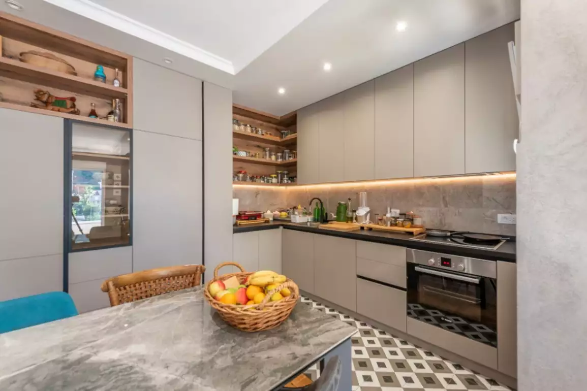 Квартира полностью кондиционирована и оборудована современной мебелью Emmeti. Современный дизайн подчеркивают натяжные потолки со светодиодной подсветкой, столярные изделия из фанеры на заказ с механизмами Bloom, датчики света, тревожные лампы. В гостиной и спальнях уложен первоклассный дубовый паркет. В части квартиры, покрытой плиткой, также есть пол с подогревом, которым можно пользоваться через приложение на телефоне.
