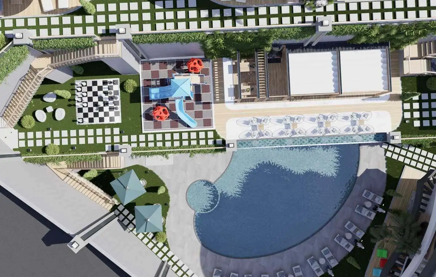 Из инфраструктуры будет открытый бассейн, зона с шезлонгами у бассейна, беседка для отдыха, детская игровая комната, финская сауна и турецкий хамам, тренажерный зал.
