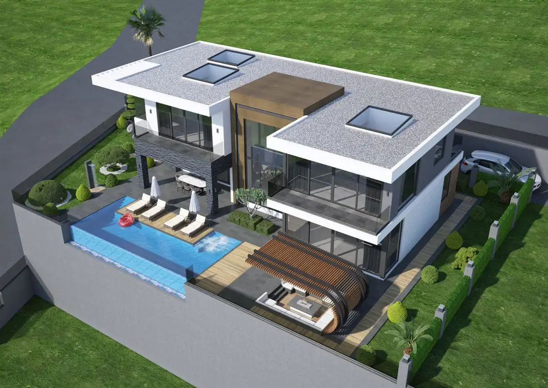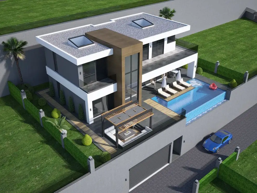 Что в комплексе: Комплекс будет состоять из 16 вилл. Каждая вилла будет иметь собственную территорию и участок земли, индивидуальный бассейн, гараж с автоматической дверью. За территорией будет вестись круглосуточное видеонаблюдение. Предусмотрено автоматическое включение и полив газона. Все собственники вилл могут рассчитывать на абсолютную приватность, но для максимально качественного управления и снижения расходов на содержание каждой отдельной виллы, управление и строительство вилл проходит организованно.