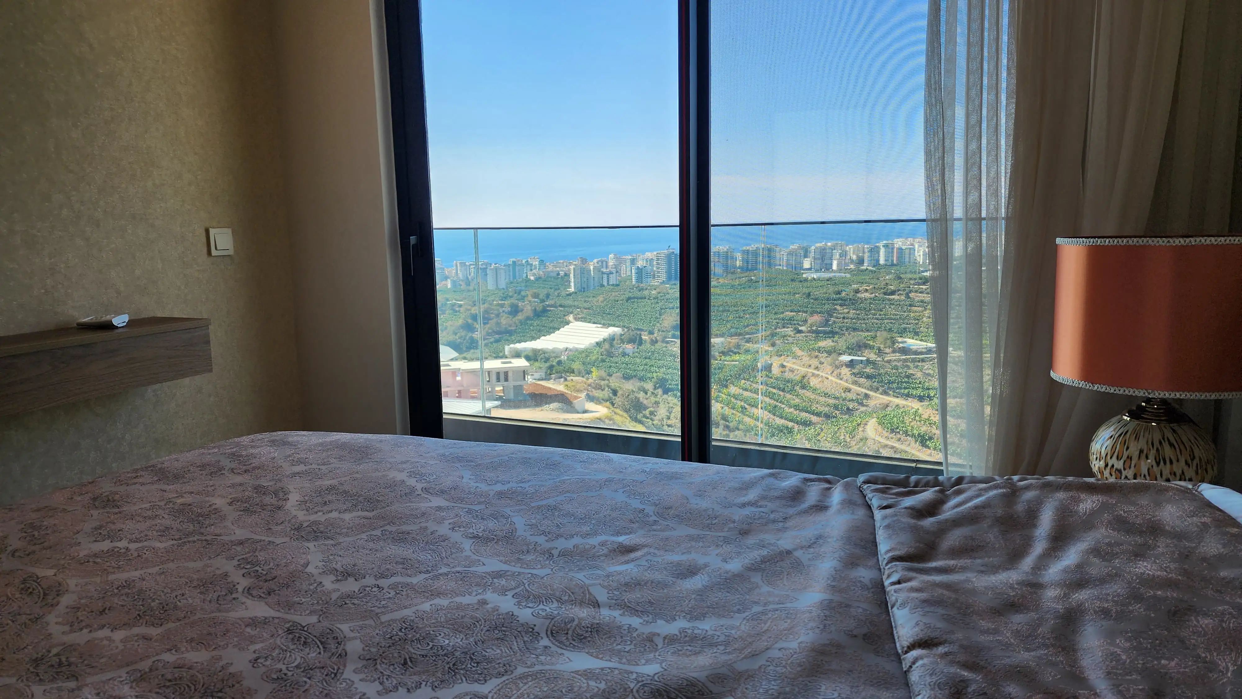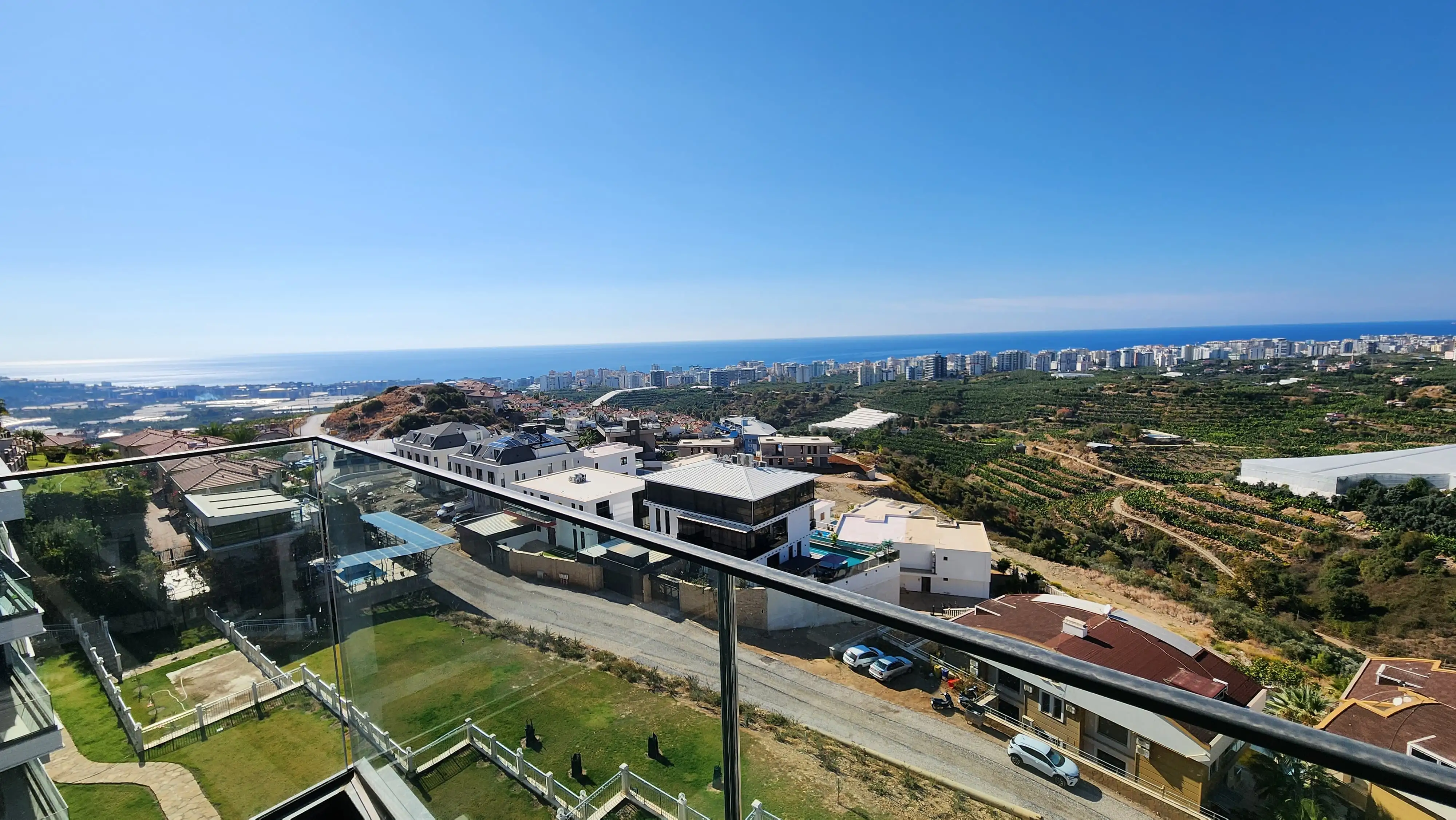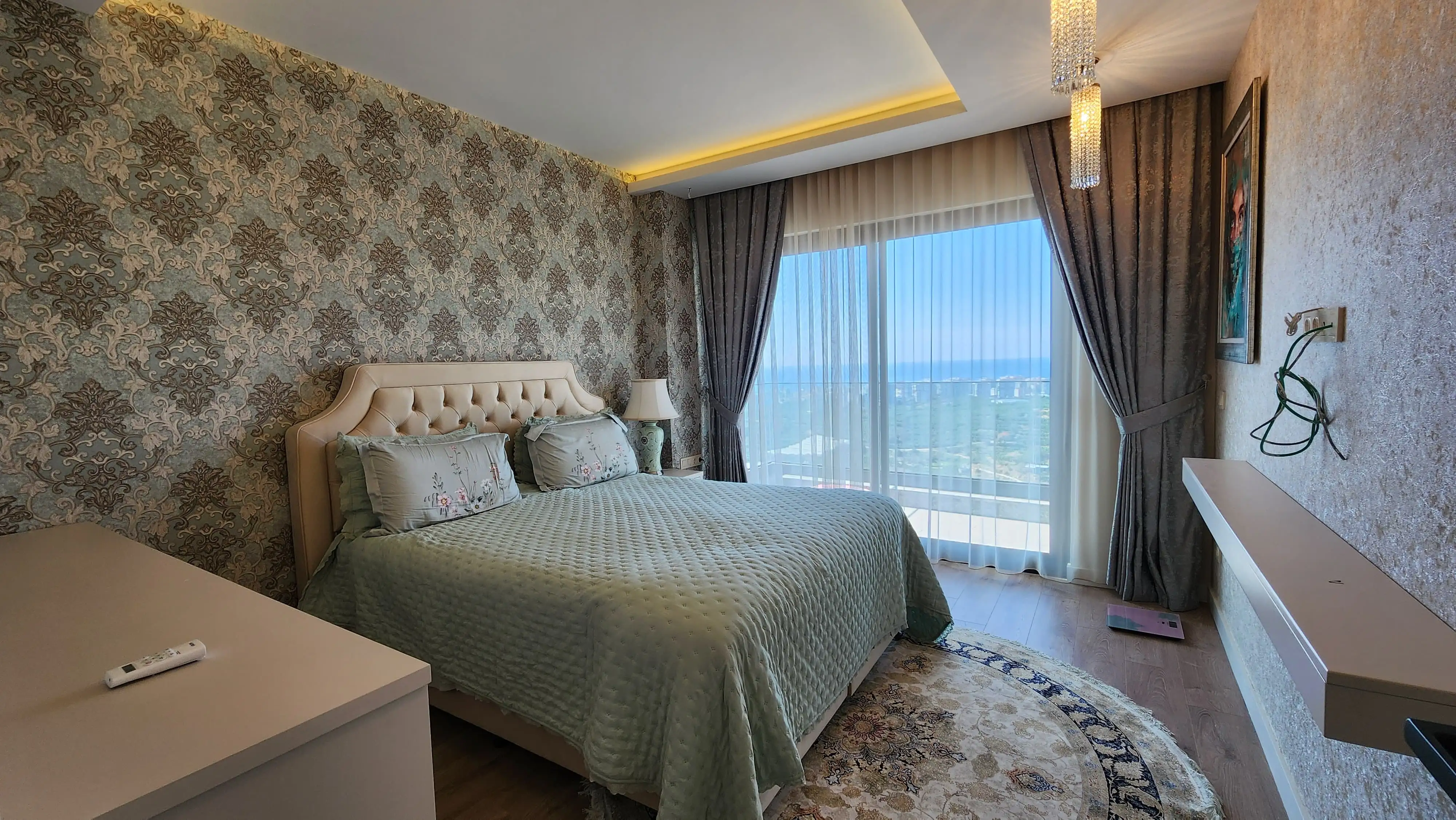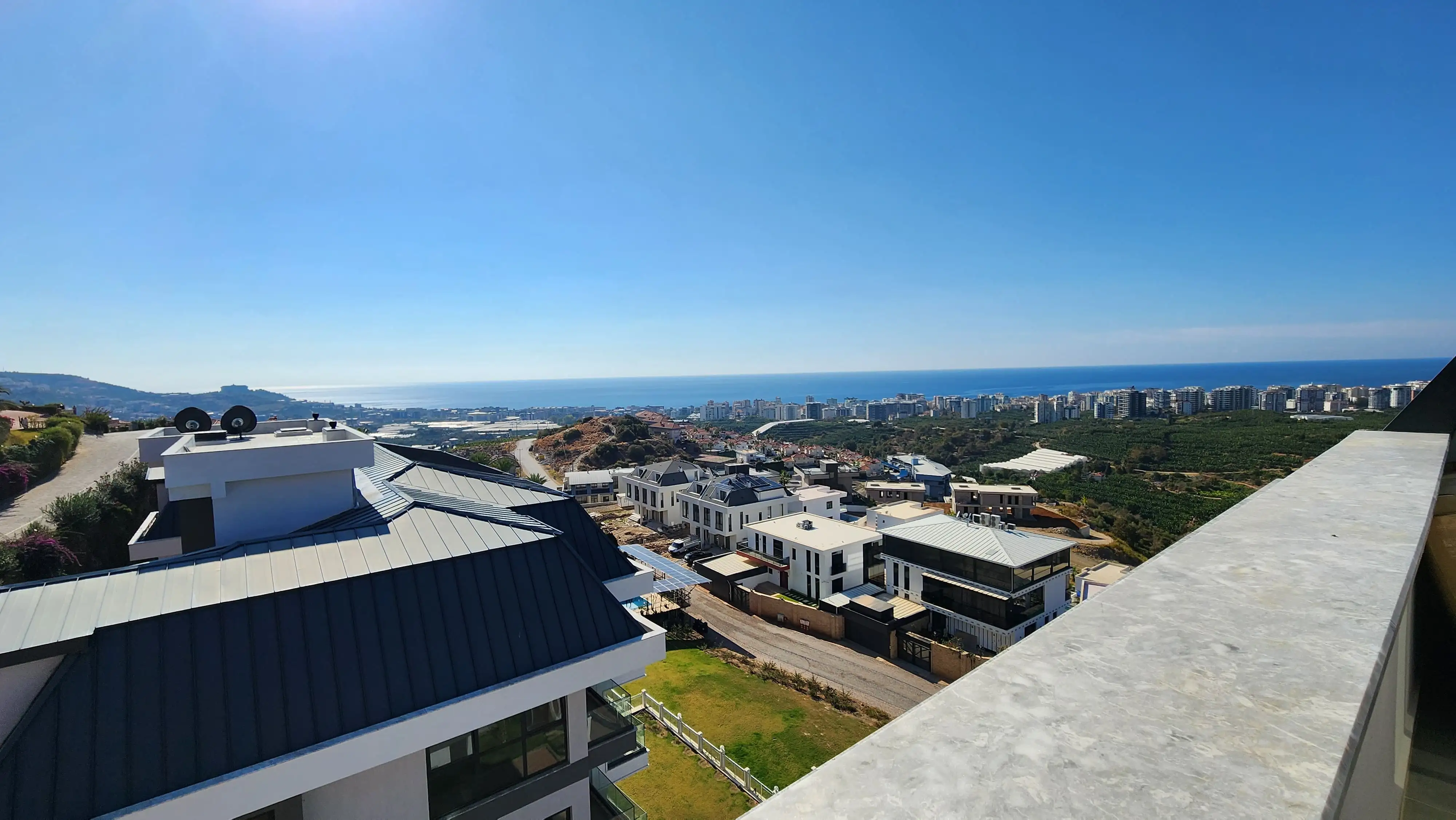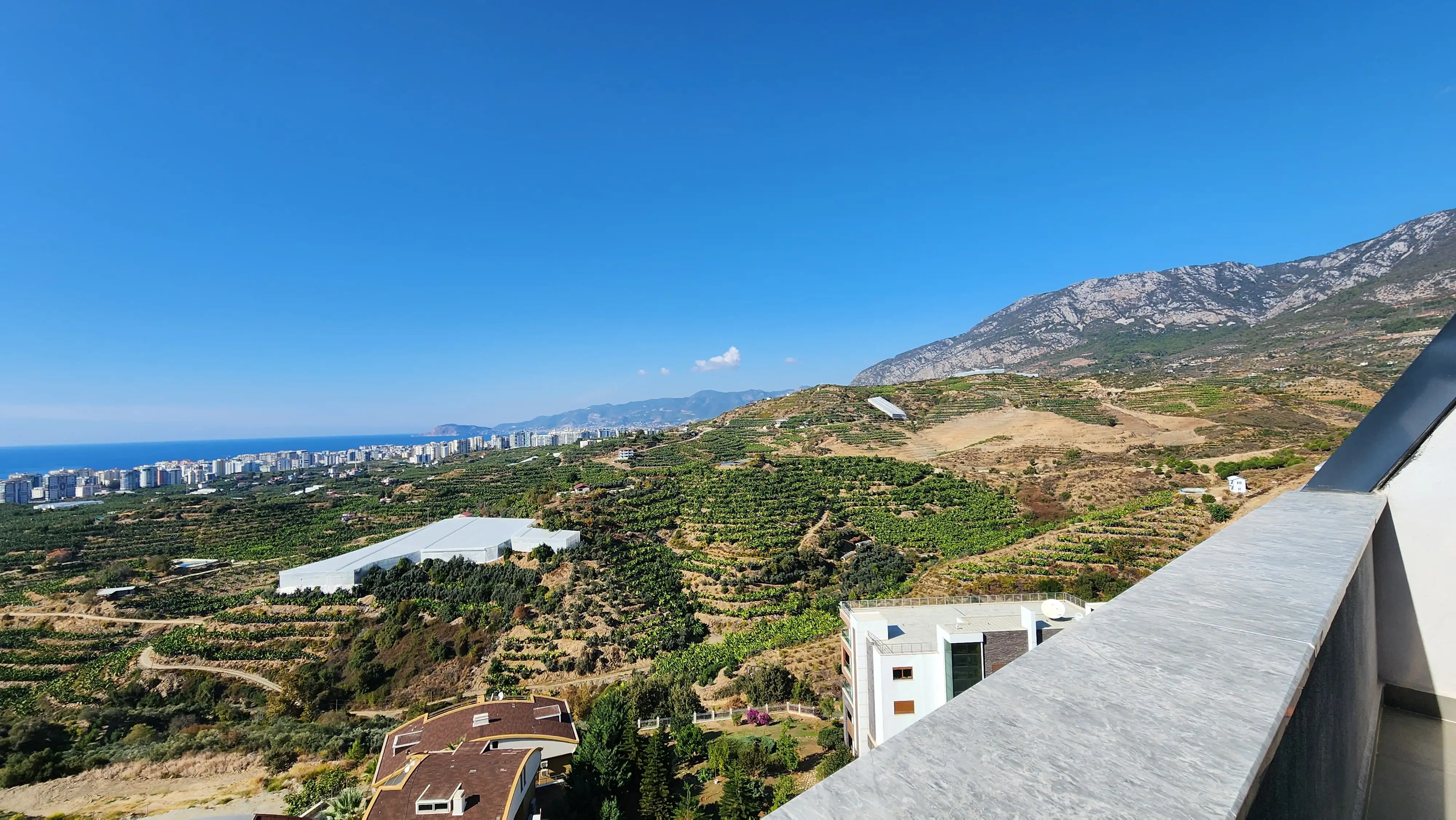 Внутри: Просторный полностью меблированный пентхаус 3+1 площадью 180 м² с панорамным видом на Средиземное море и побережье Алании. Вся мебель и техника высокого качества, что обеспечивает комфорт и стиль в интерьере.