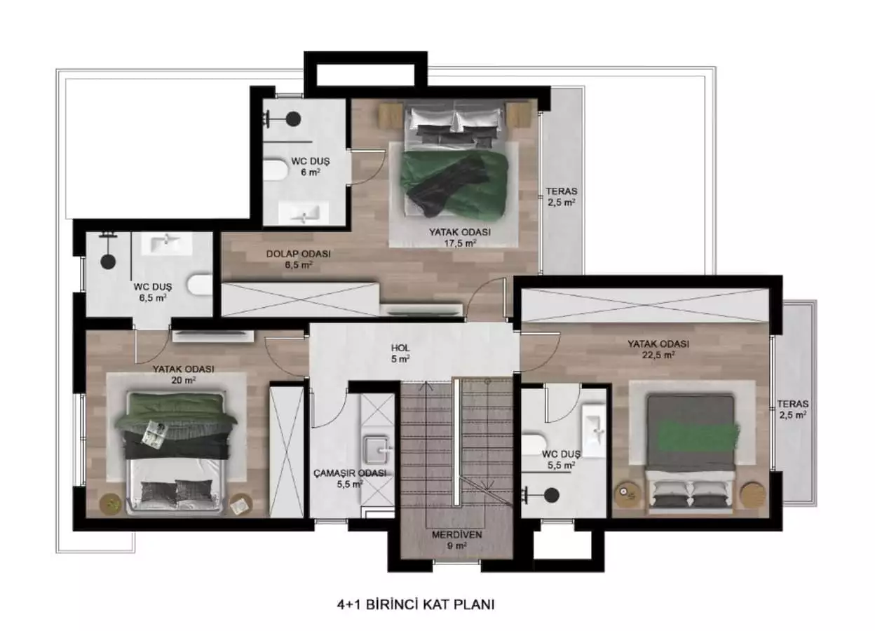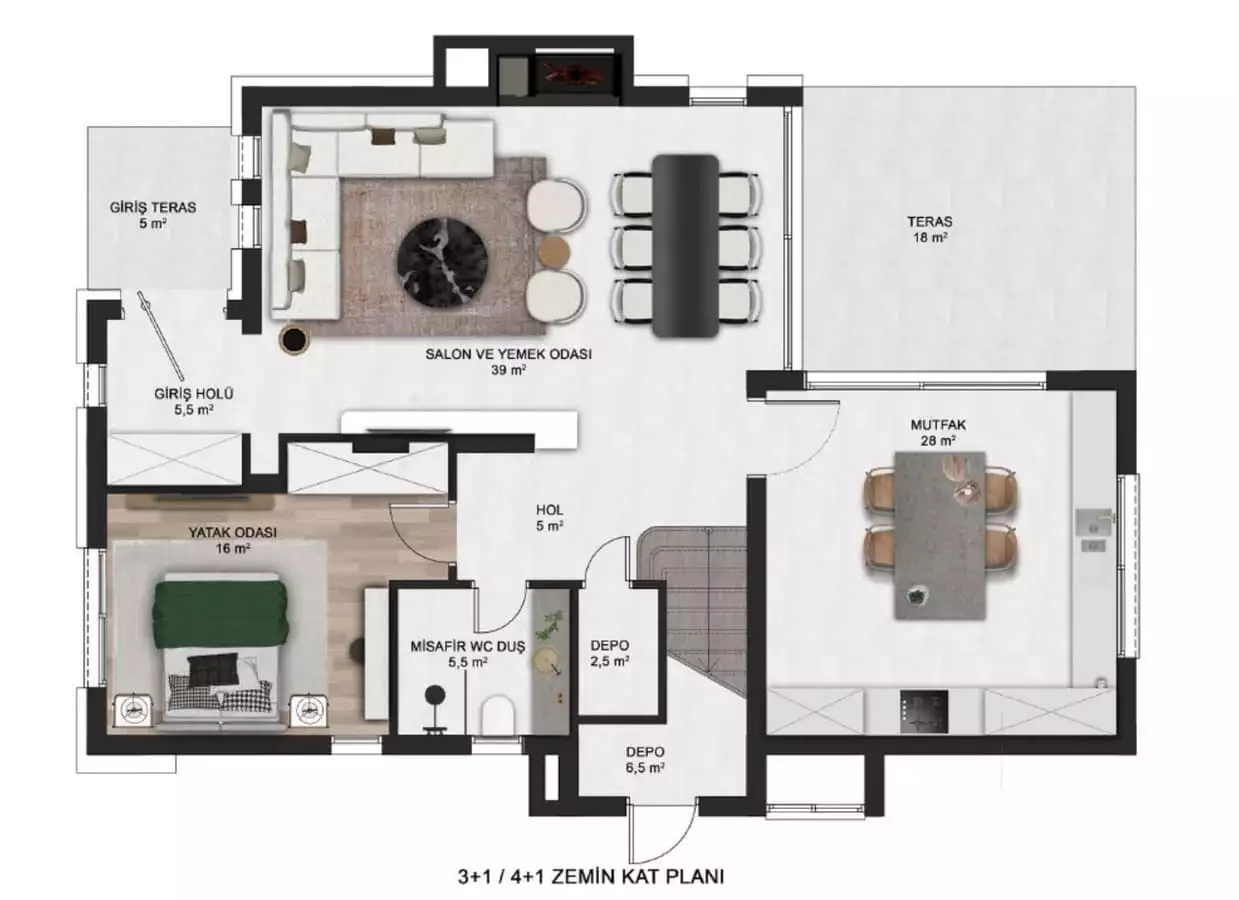 Внутри: Вилла планировкой 3+1 площадью 218 м2 позволяет разместить в себе гостиную, совмещенную с кухней, 3 спальни, 3 ванные комнаты и 2 террасы.