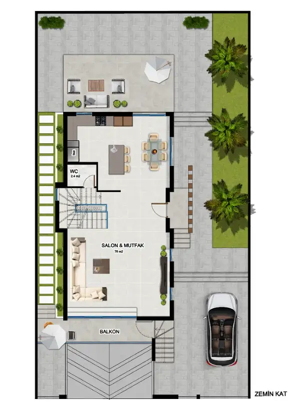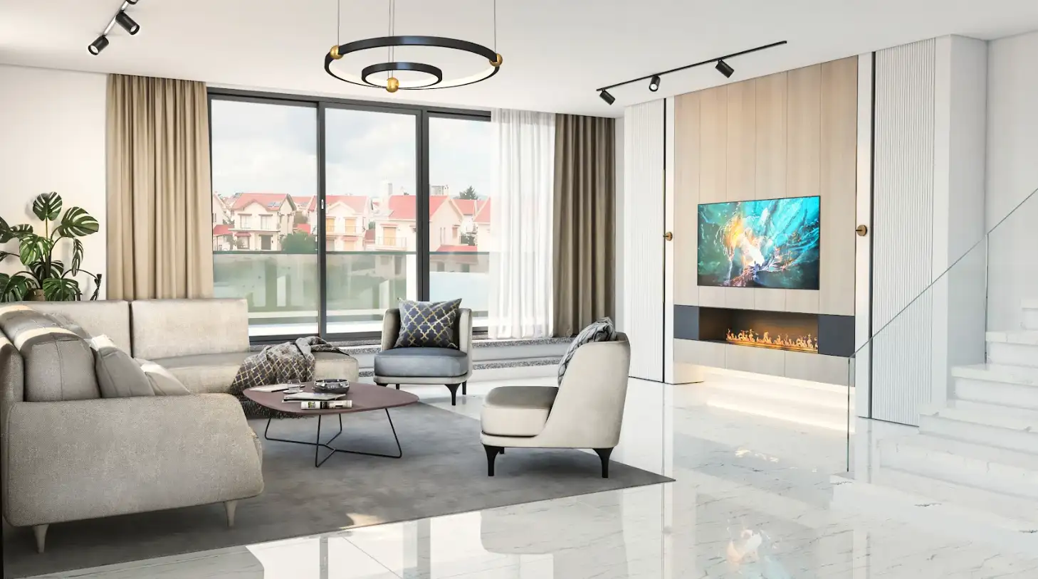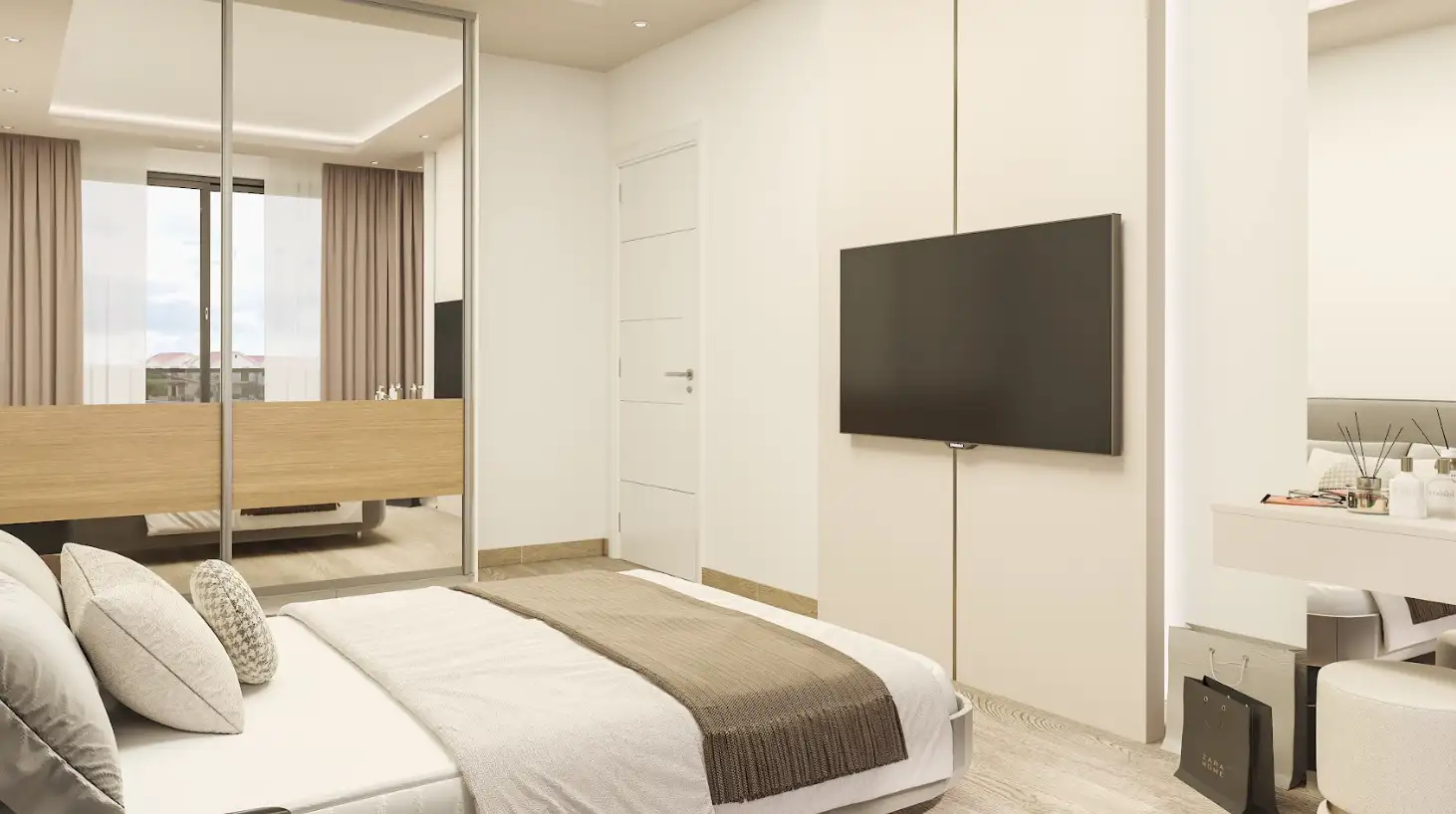 Внутри: Каждая вилла имеет планировку 3+1 с общей площадью 455 кв.м. Все виллы предлагаются в полной чистовой отделке высокого класса с установленной сантехникой и встроенными шкафами в комнатах.
