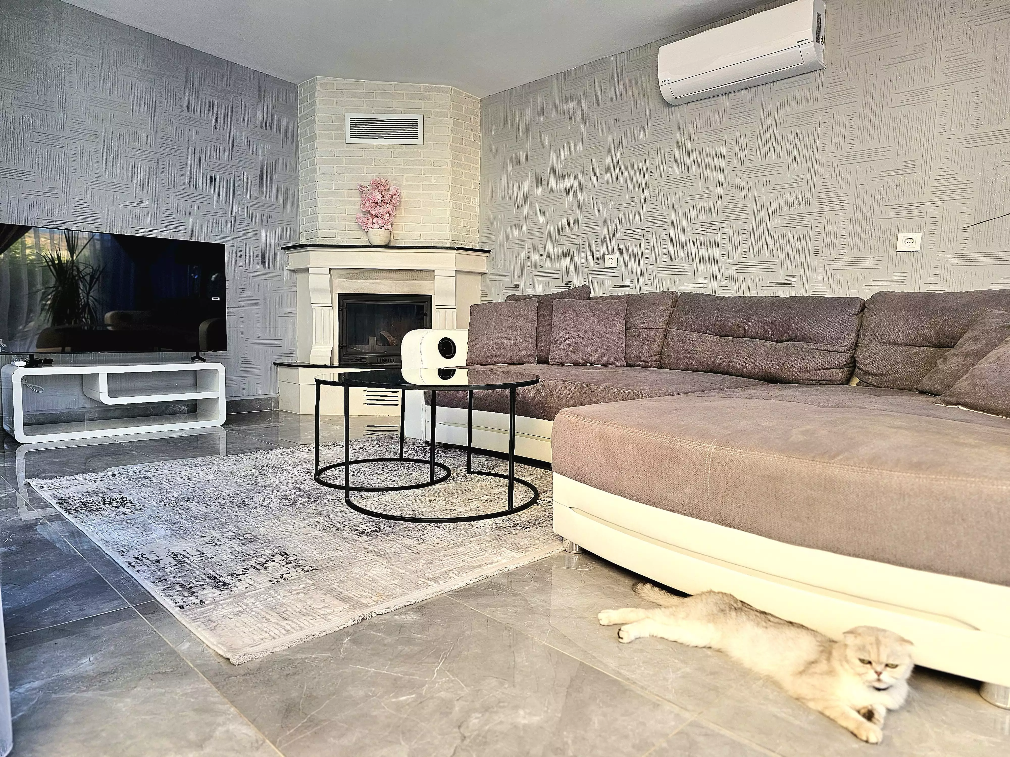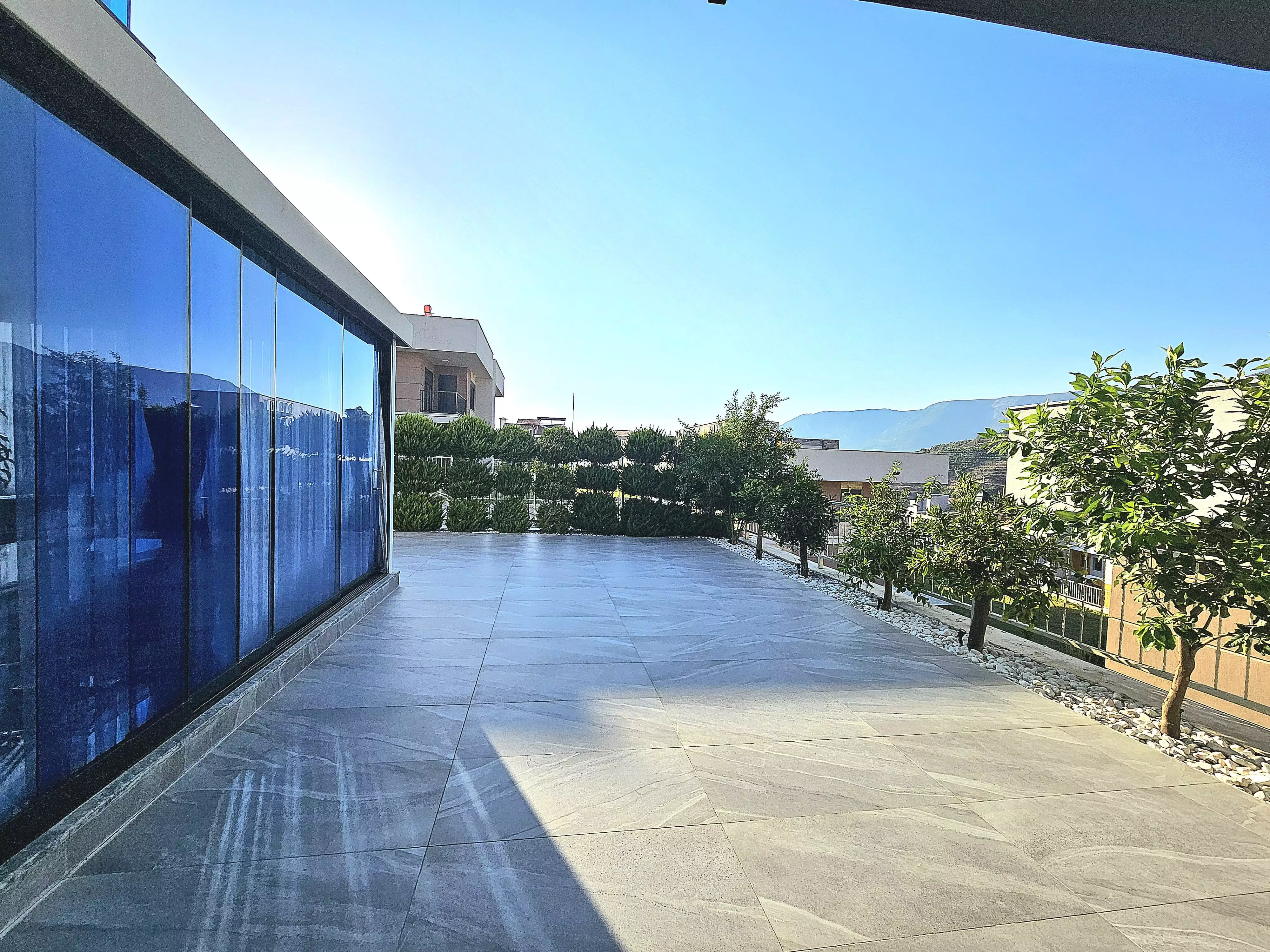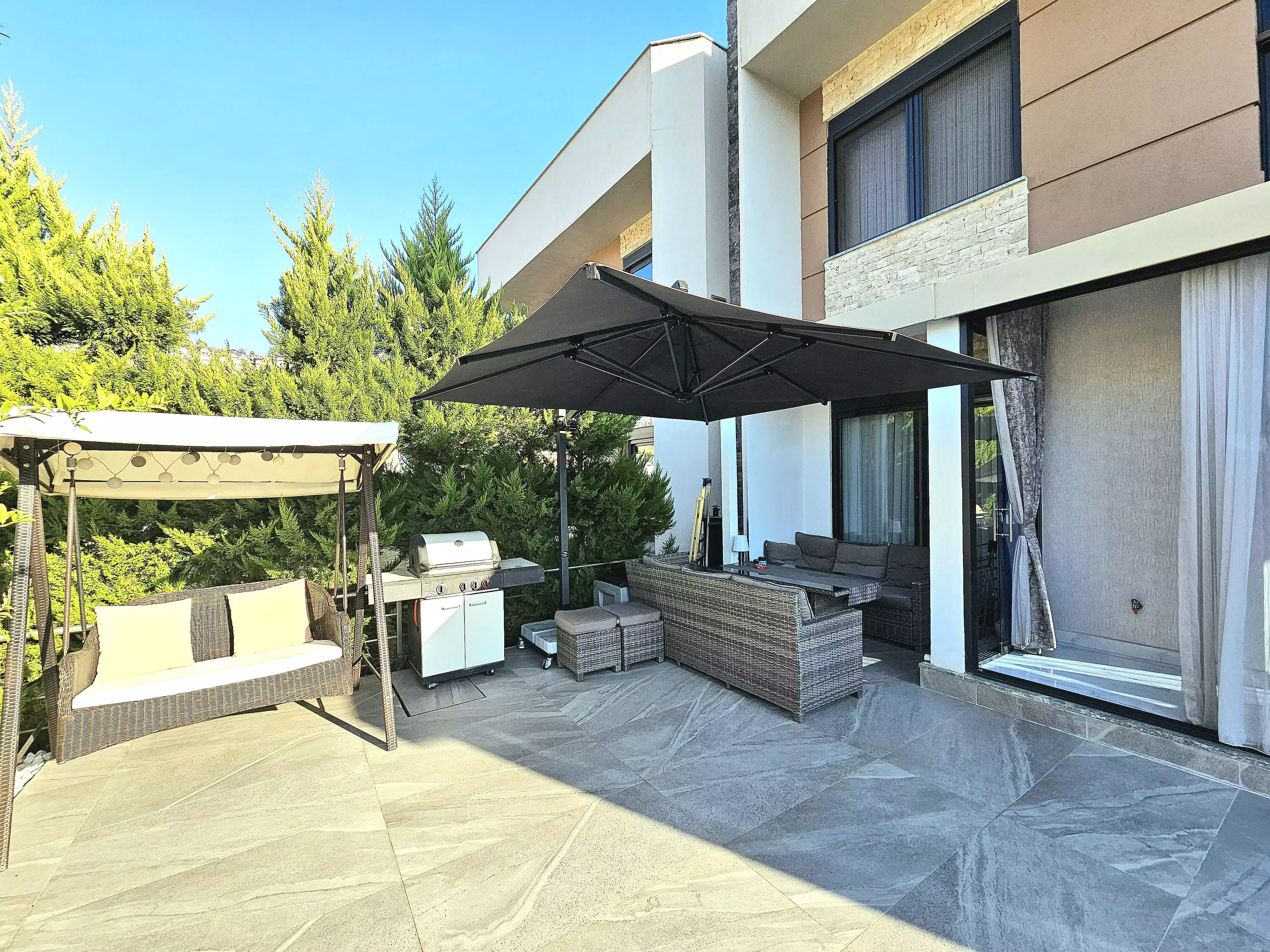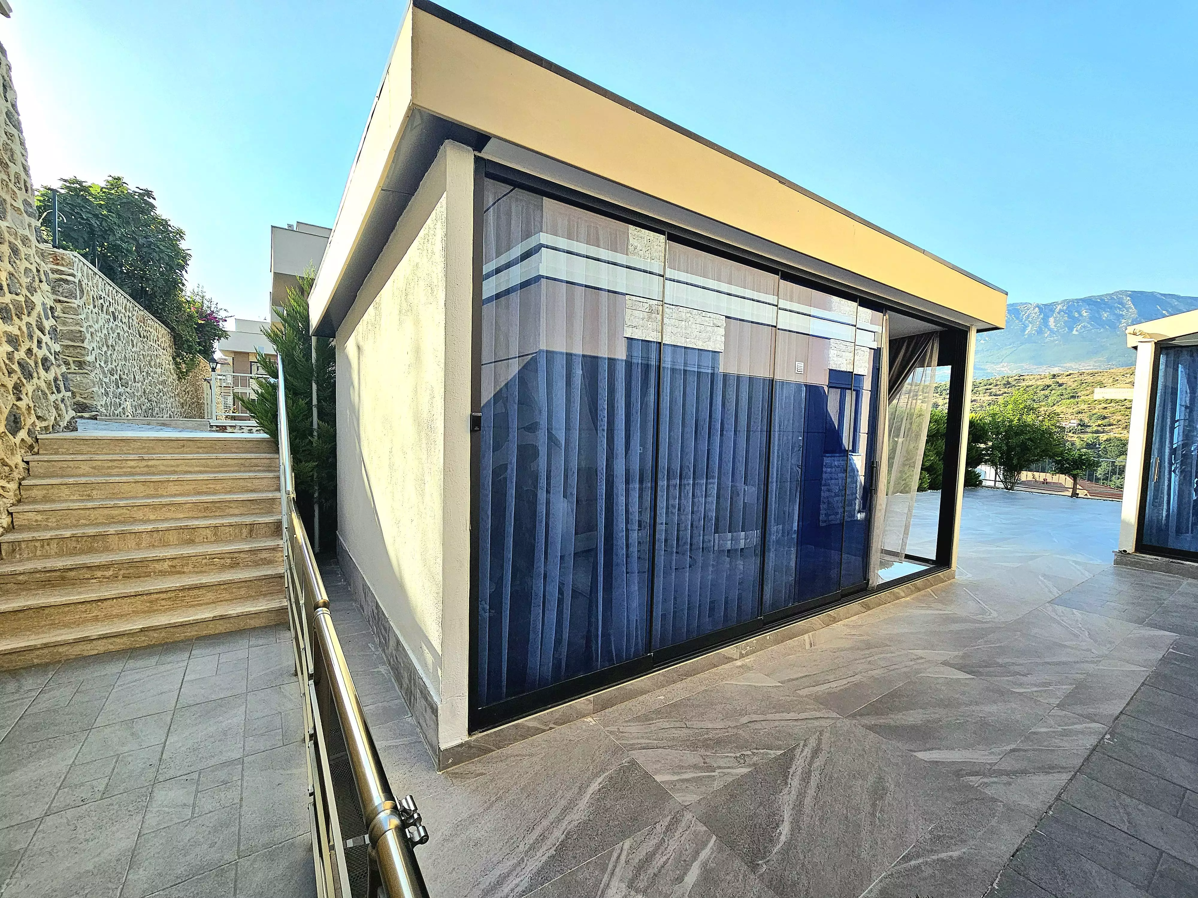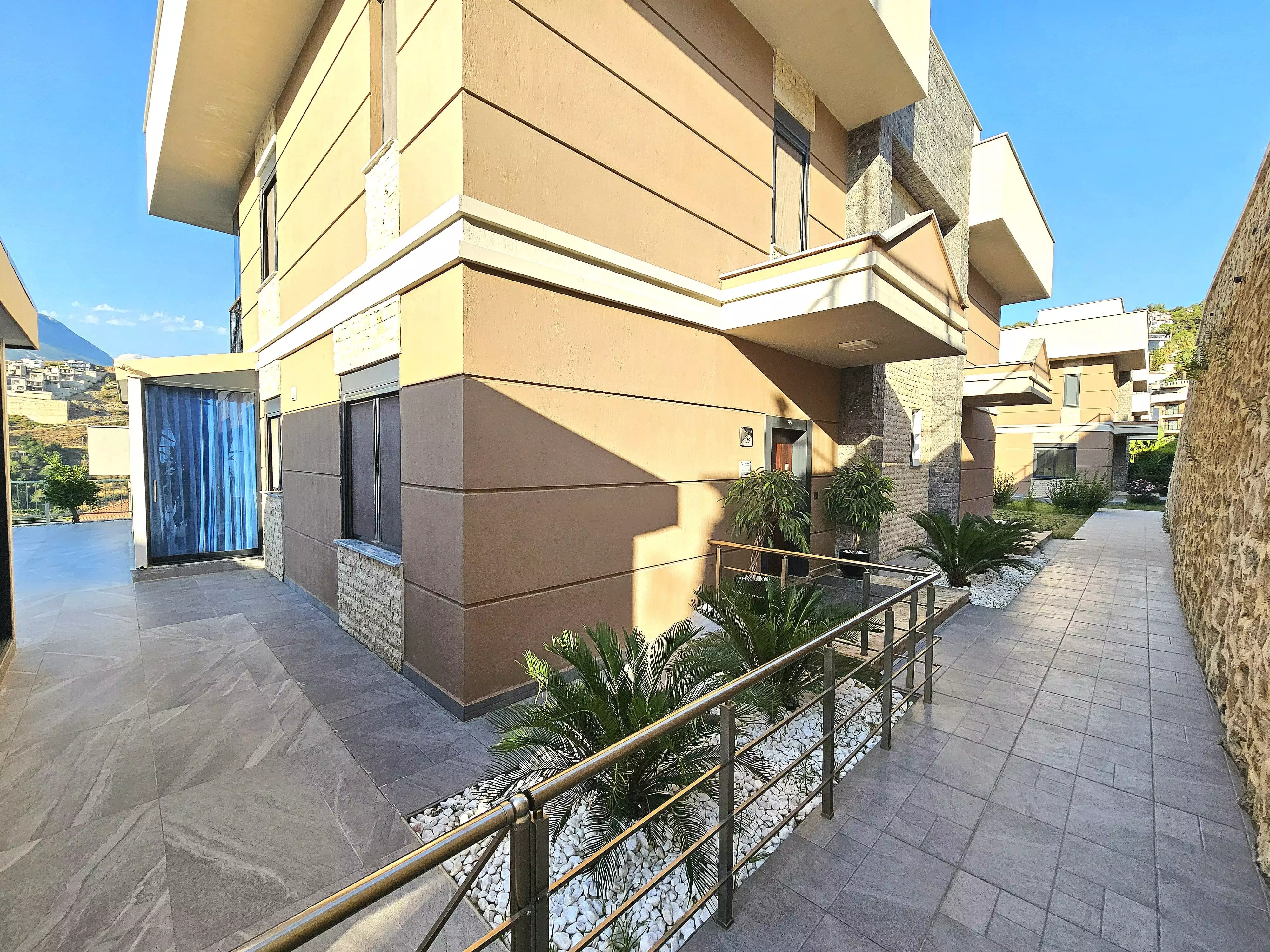 Внутри: Вилла площадью 220 м² имеет 3 спальни, гостиную, кухню, рабочий кабинет, 3 санузла, 2 балкона и террасу. Из окон открывается вид на горы Торос. Вилла полностью меблирована и оборудована техникой Bosch. На участке есть пристройка для отдыха и встреч.