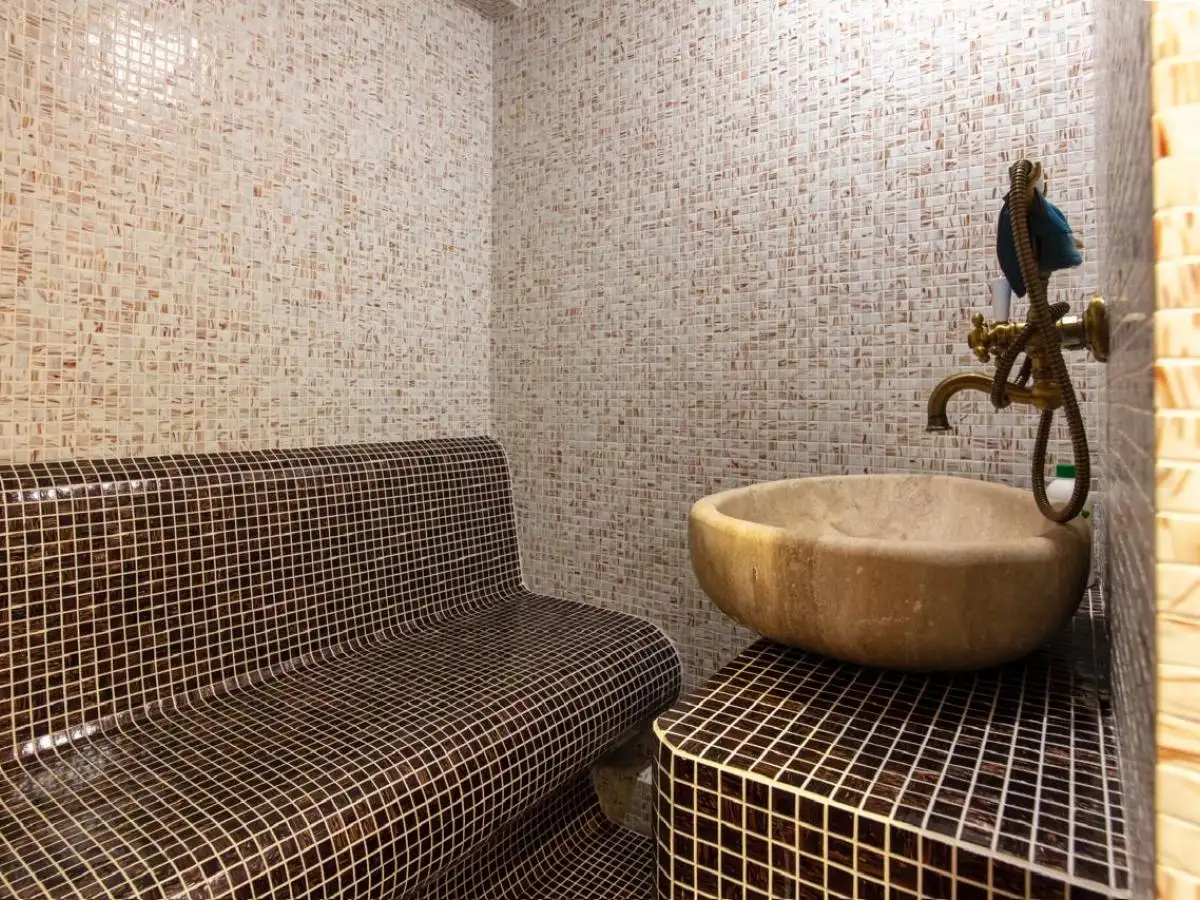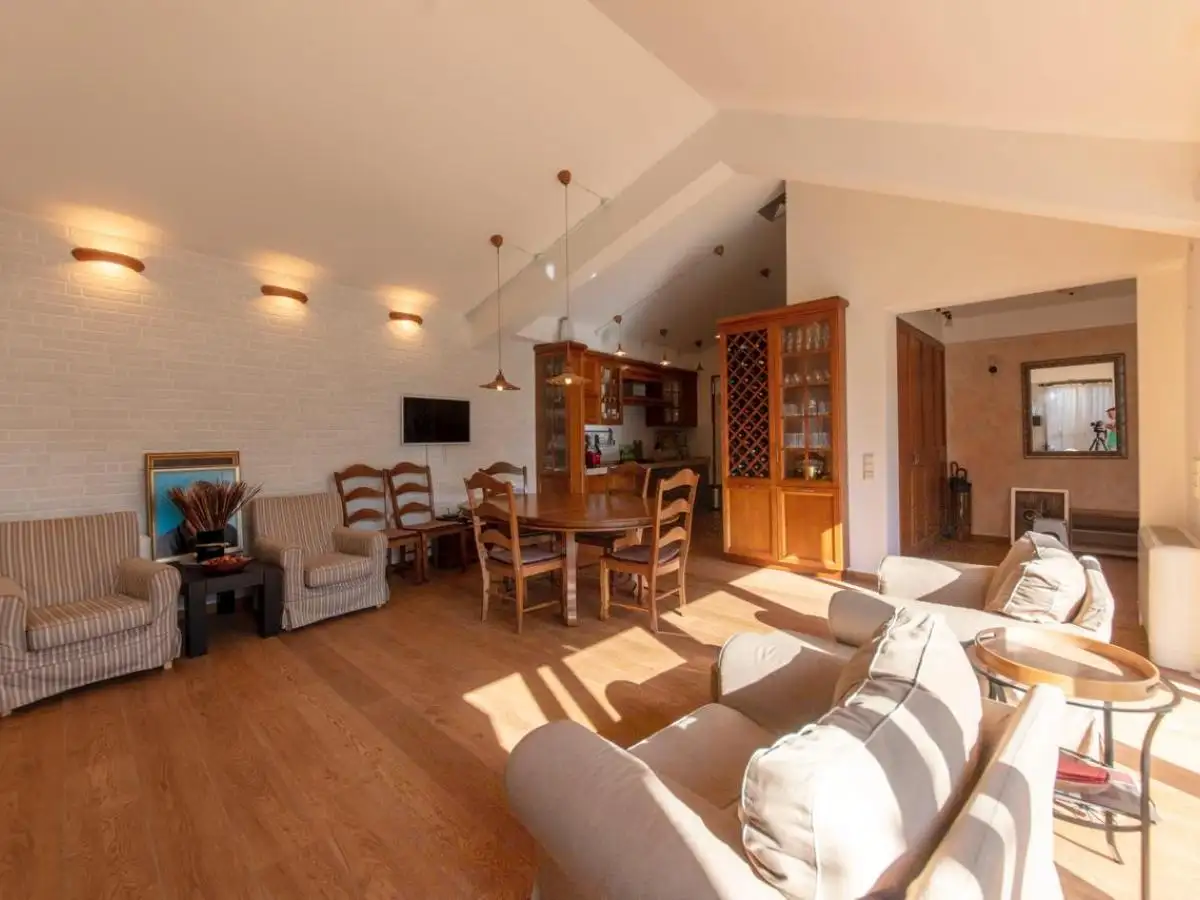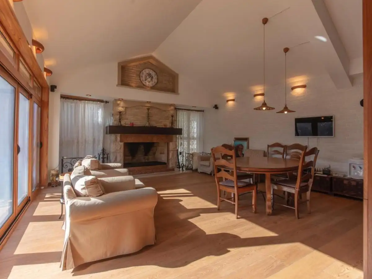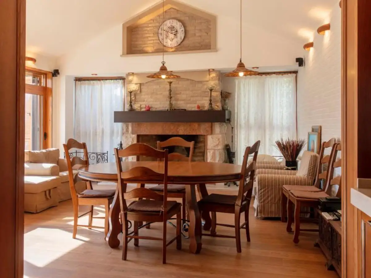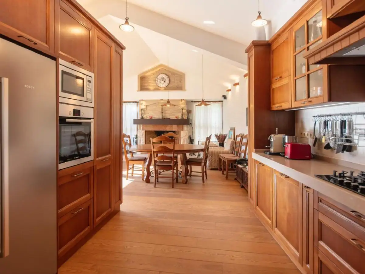 большая кухня -столовая с дровяным камином и зоной отдыха, оснащена всей необходимой бытовой техникой (электрическая и газовая плита, холодильник, духовая печь, винный шкаф)