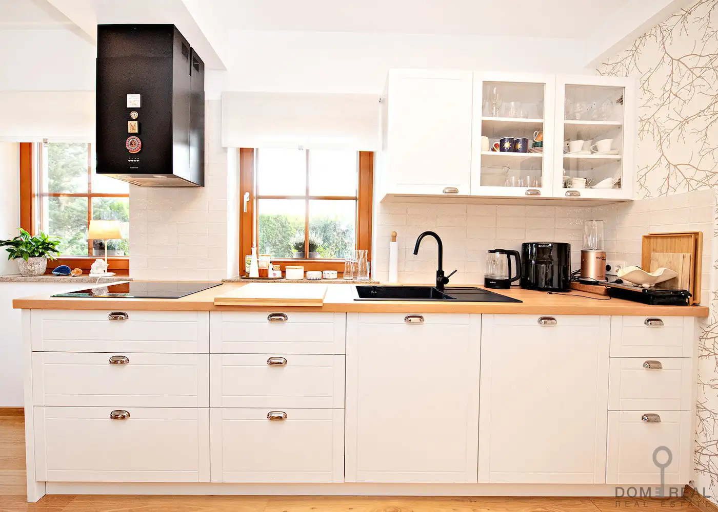 - Первый этаж: открытая планировка с современной кухней, столовой и гостиной, уют которой дополняет камин. Кроме того, на первом этаже расположены ванная комната и кабинет.