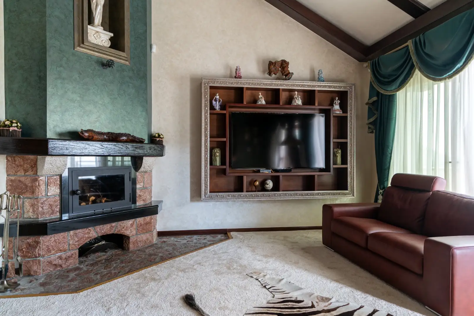 Дом для отдыха – это большое пространство с панорамным остеклением. Здесь установлен камин для зимнего отдыха и кондиционер для летнего. Шторы с автоматическим открыванием. В доме для отдыха есть своя кухня. У входа размещена большая печь для барбекю.