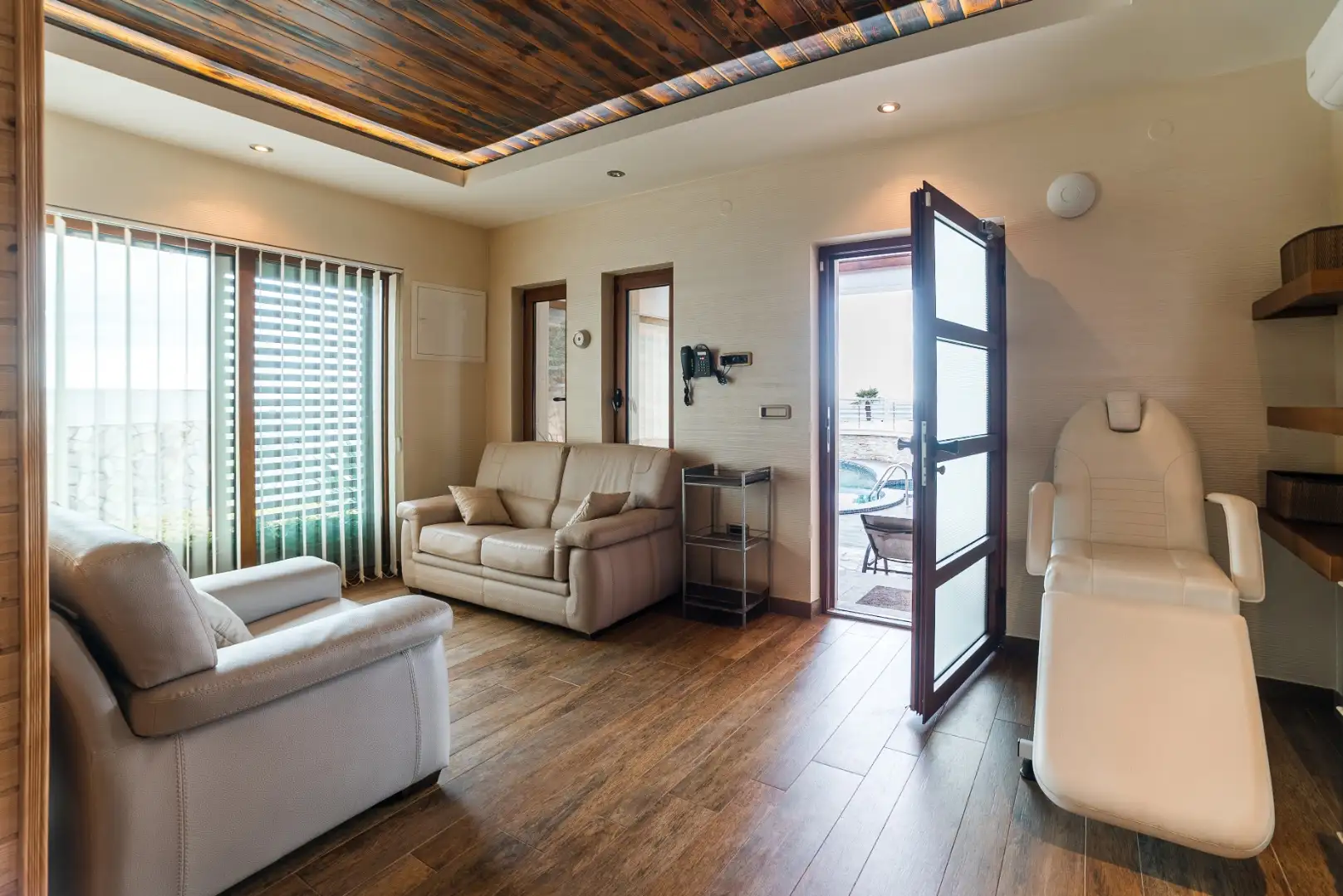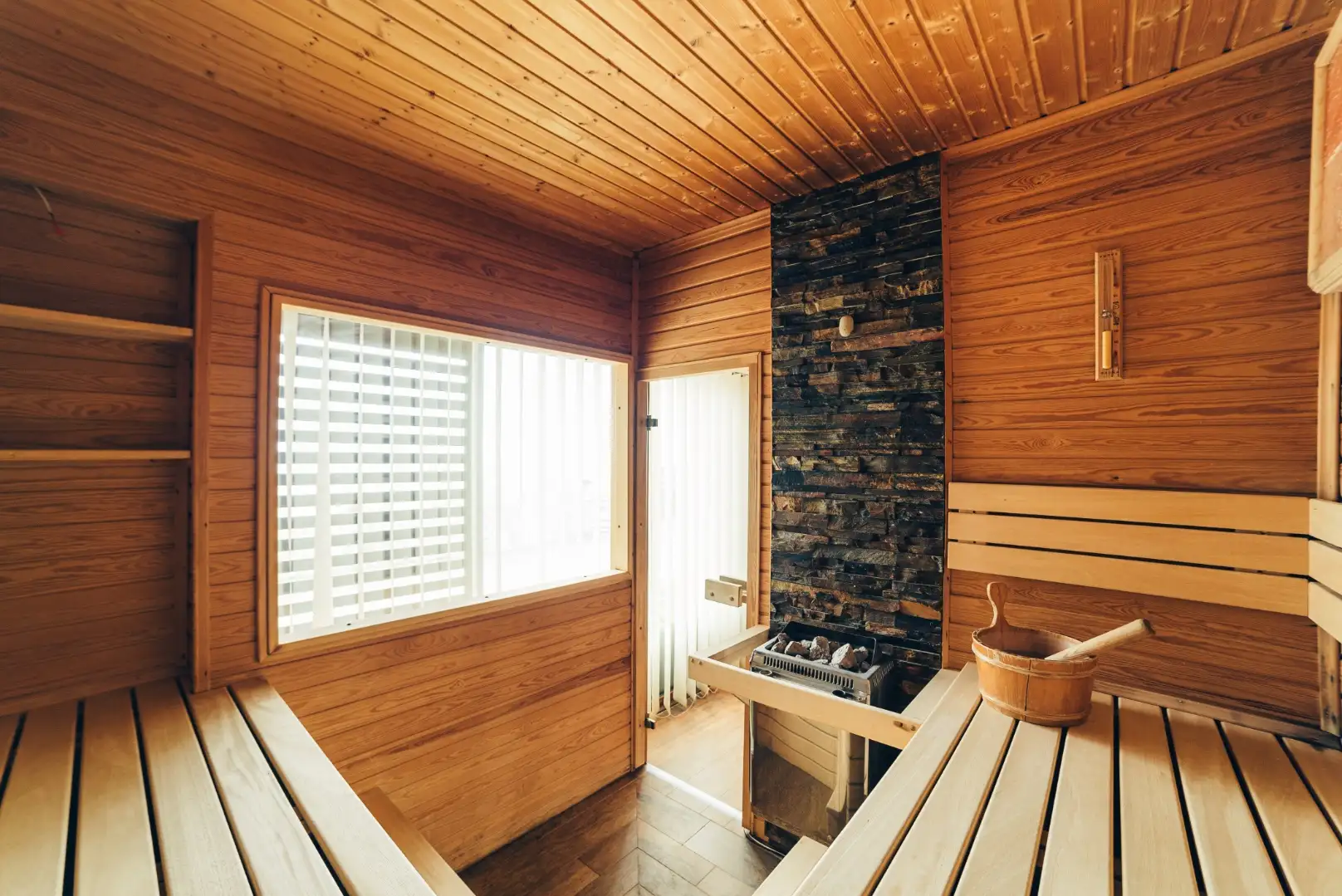 Сауна представляет собой отдельное здание возле бассейна. В нём есть зона отдыха, ванная комната и парилка. Сауна электрическая, имеет печь с автоиспарителем, который автоматически поддерживает заданную влажность и температуру. Внутри парилки установлены пластины с гималайской солью. Массажное кресло в предбаннике дает дополнительную возможность для расслабления и восстановления.