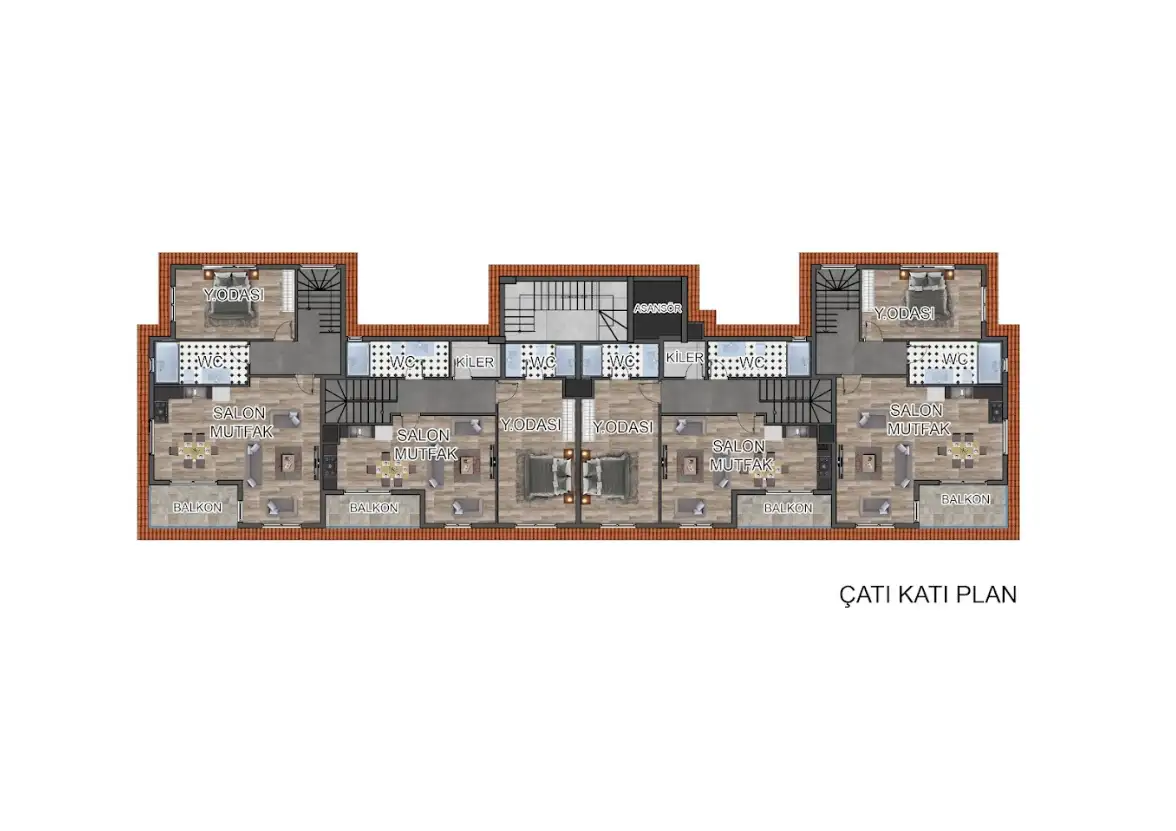 1+1 площадь от 57 м2 до 60 м2; 2+1 площадь 85 м2; 2+1 пентхаус площадь 110 м2