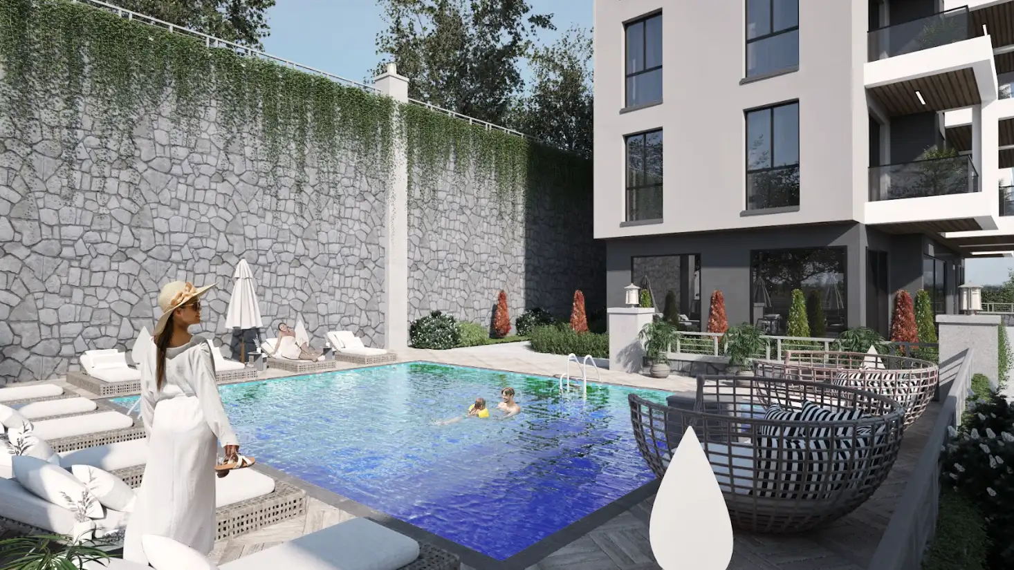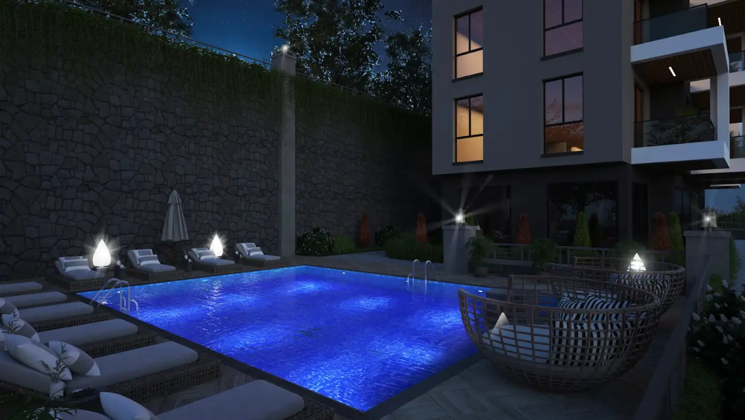 Что в комплексе: На участке земли площадью 830 м2 будет расположен один шестиэтажный жилой блок на 15 квартир. На территории комплекса будет открытый бассейн и место отдыха, барбекю зона и беседка, открытая парковка, а также на территории установят круглосуточную систему видеонаблюдения.