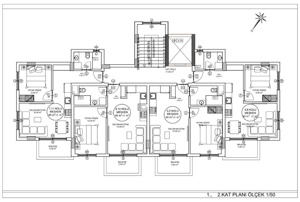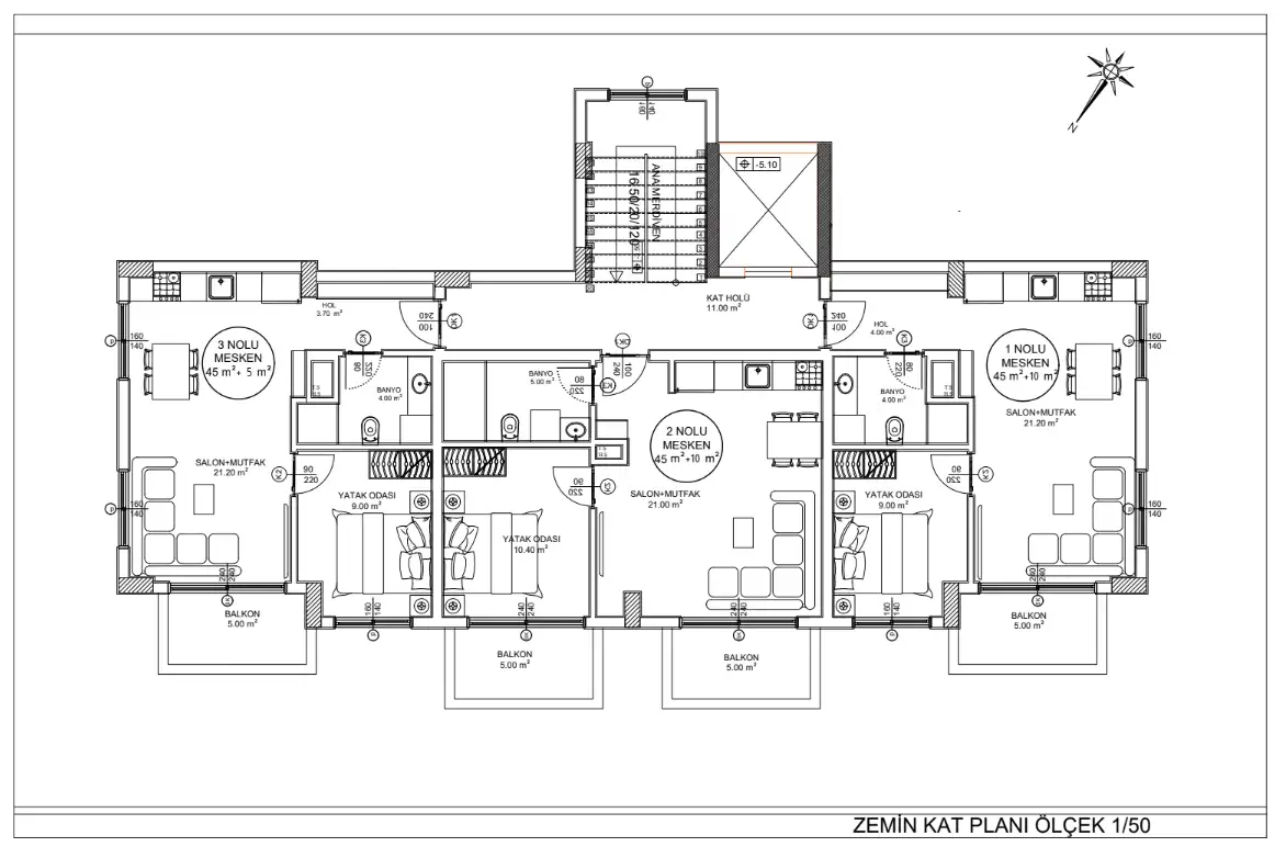 Апартаменты 1+1 площадью 40-45 м2;