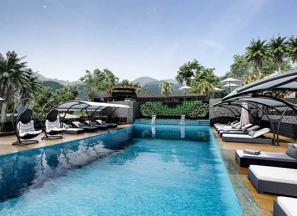 Что в комплексе: Закрытый комплекс расположен на просторной территории с садом, среди пальм и хвойного леса. На территории комплекса размещены два десятиэтажных дома, закрытый и открытый бассейн, спорт зал, площадка для занятий спортом на открытом воздухе, детский городок и несколько зон для игр и отдыха. В центре комплекса размещен огромный бассейн с собственным баром. Предусмотрена открытая охраняемая парковка. Предоставляются услуги трансфера на пляж автотранспортом комплекса.