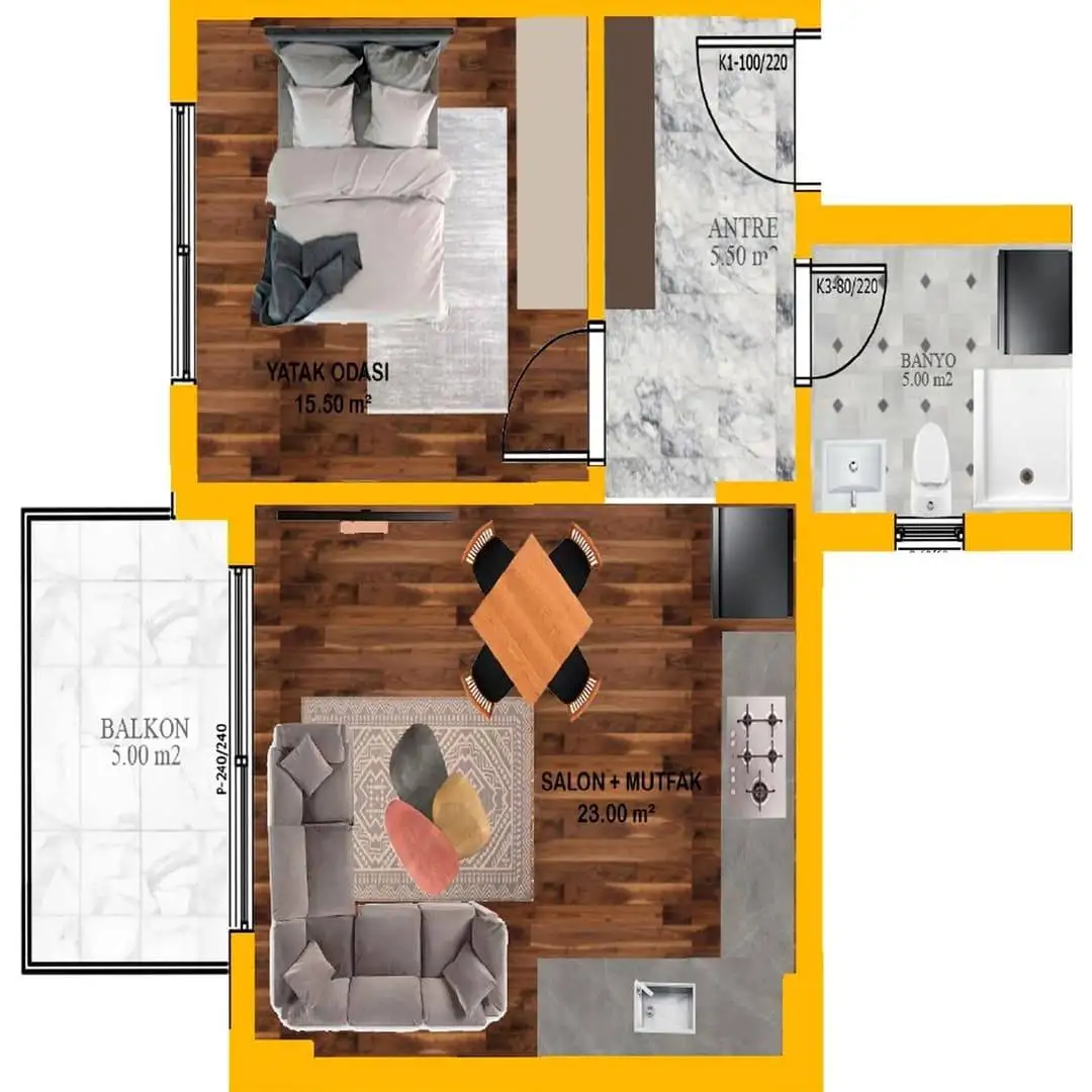 1+1 площадью от 49 м2 до 55 м2;