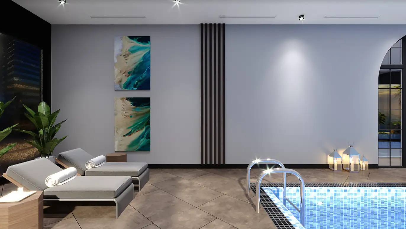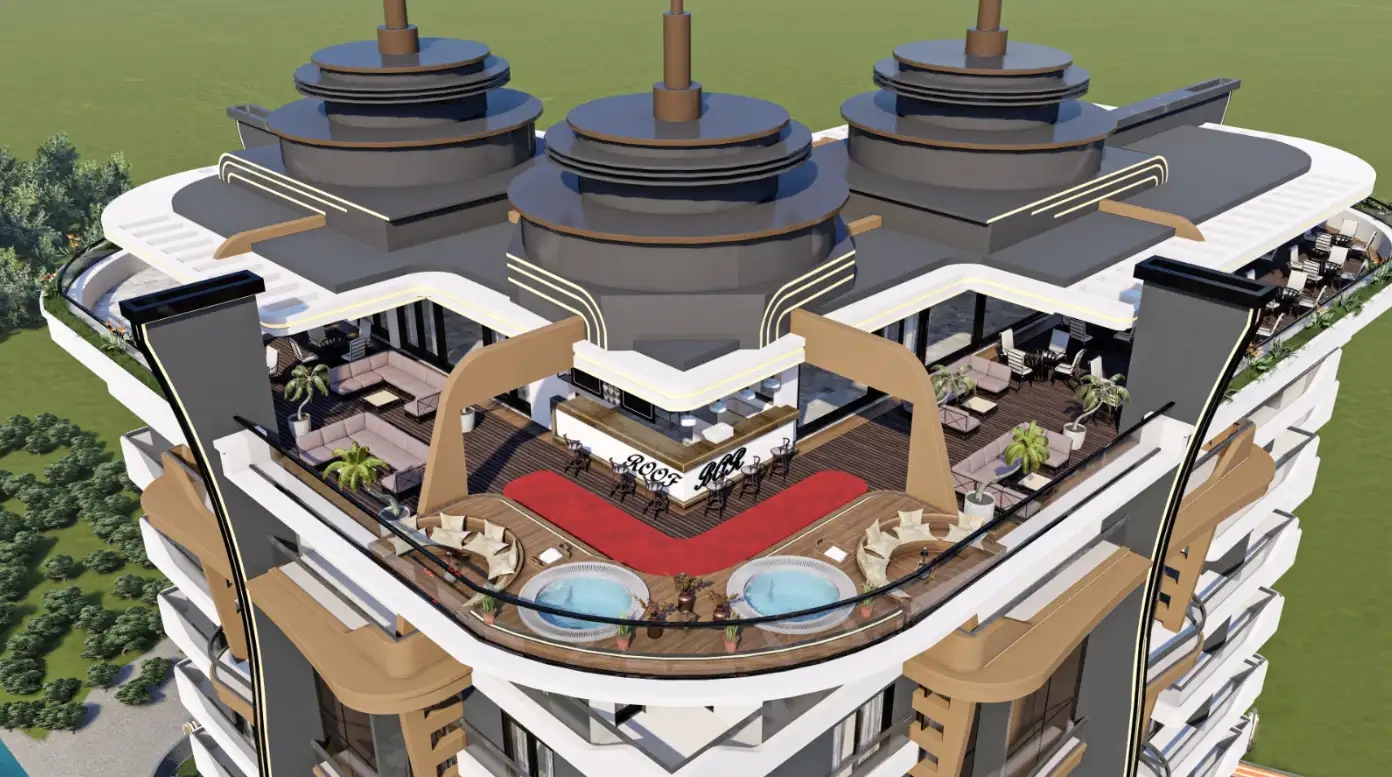 Что в комплексе: На закрытой озелененной территории расположено два жилых блока, открытый бассейн, детская площадка, детский бассейн, беседки для отдыха и рыбалки, зона отдыха и барбекю, открытый бассейн, фитнес, финская сауна, хамам, генератор. На последнем этаже комплекса находится просторная лаундж-зона, откуда открывается прекрасный пейзаж на море, гори и Аланию. На всей территории комплекса работает беспроводной интернет. Безопасность жильцов обеспечивает круглосуточная охрана.