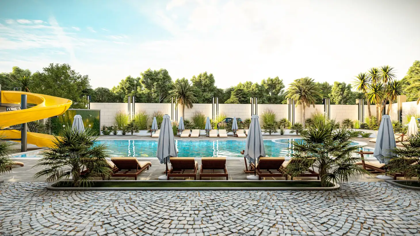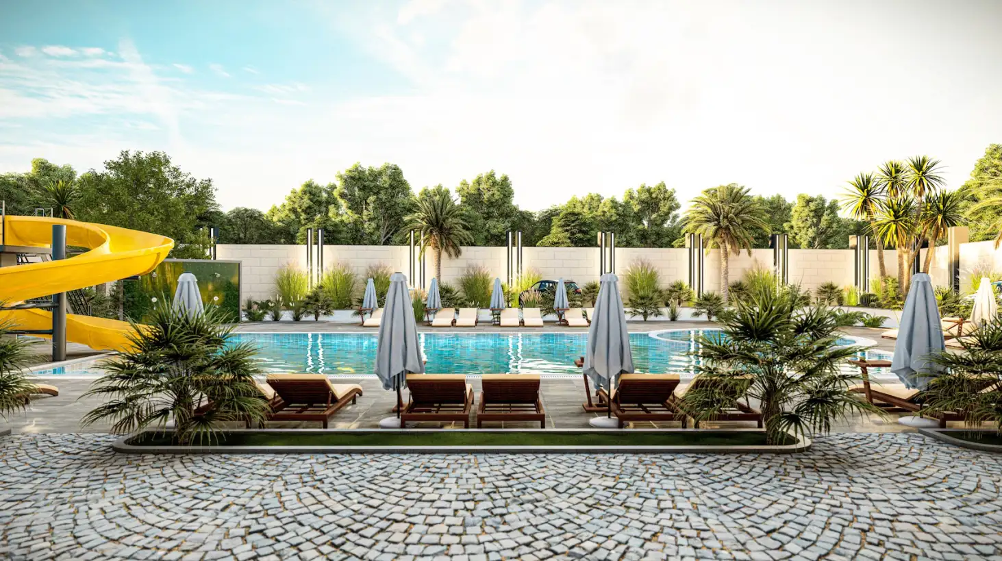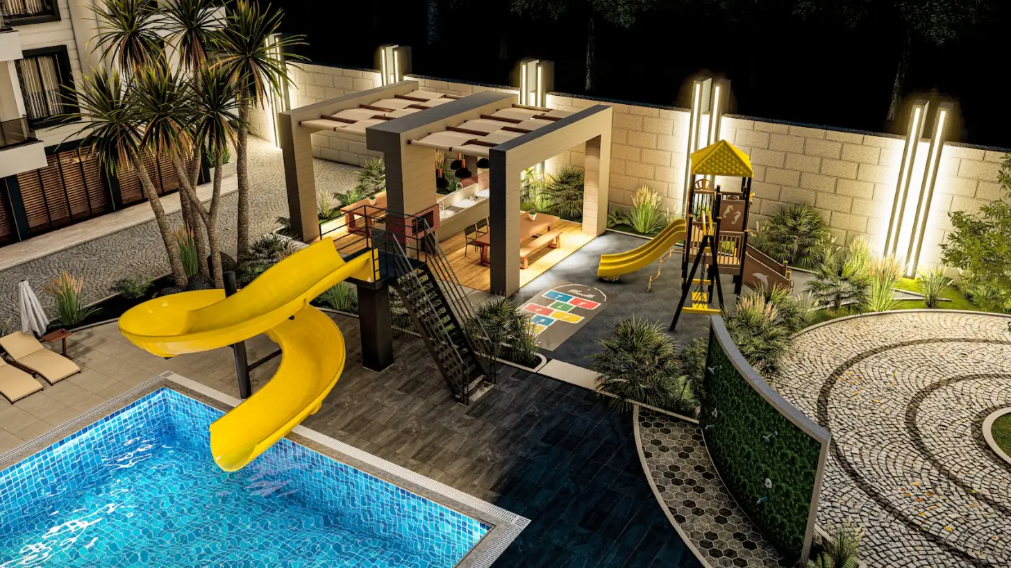 Что в комплексе: На закрытой, озелененной территории площадью 3 042 м2 будет расположен один жилой блок, открытый бассейн с водными горками, детский бассейн, зона отдыха у бассейна, детская площадка, беседки для отдыха, зона отдыха и барбекю, мини клуб, финская сауна, фитнес, открытая парковка, генератор.