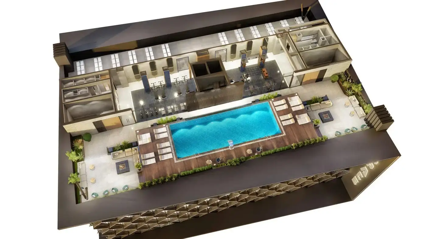 Что в комплексе: Состоящий из одного пятиэтажного здания, комплекс предлагает широкий спектр удобств, включая фитнес-центр на крыше, крытый бассейн, открытый паркинг и круглосуточную охрану.