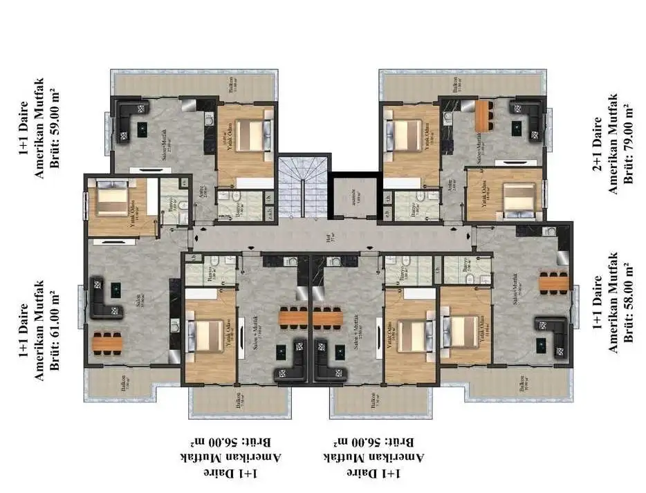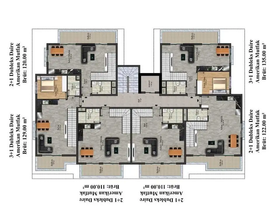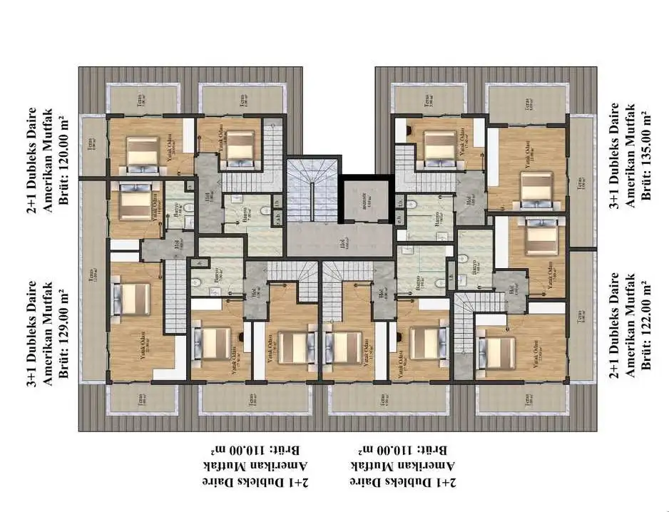 Пентхаусы 2+1 от 120 до 122 м2 - гостиная, две спальни, кухня открытой планировки, 2 ванные комнаты, 2 балкона и терраса;