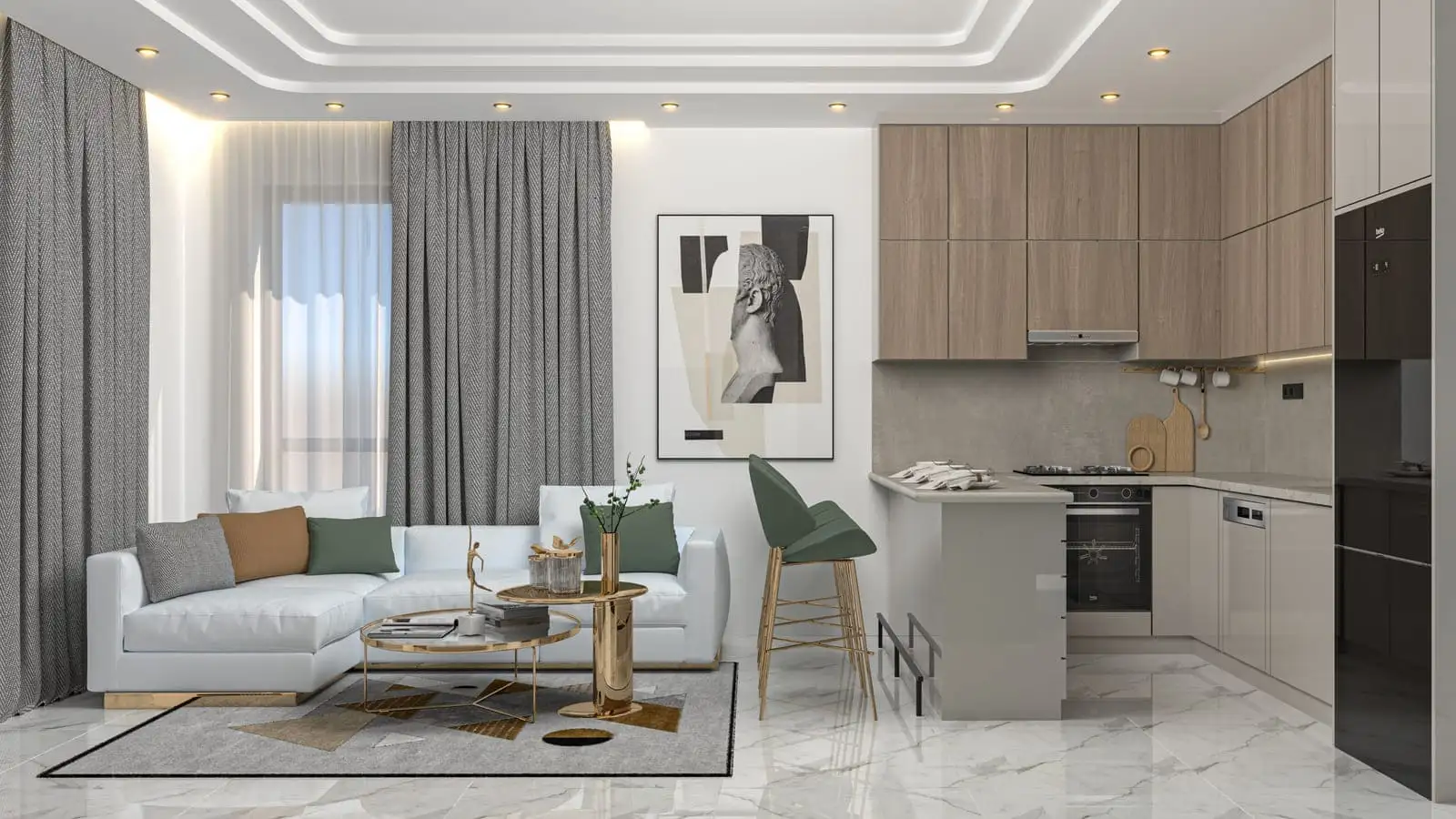 Внутри: Апартаменты предлагаются в стандартной чистовой отделке со встроенным кухонным гарнитуром и полностью укомплектованными санузлами.
