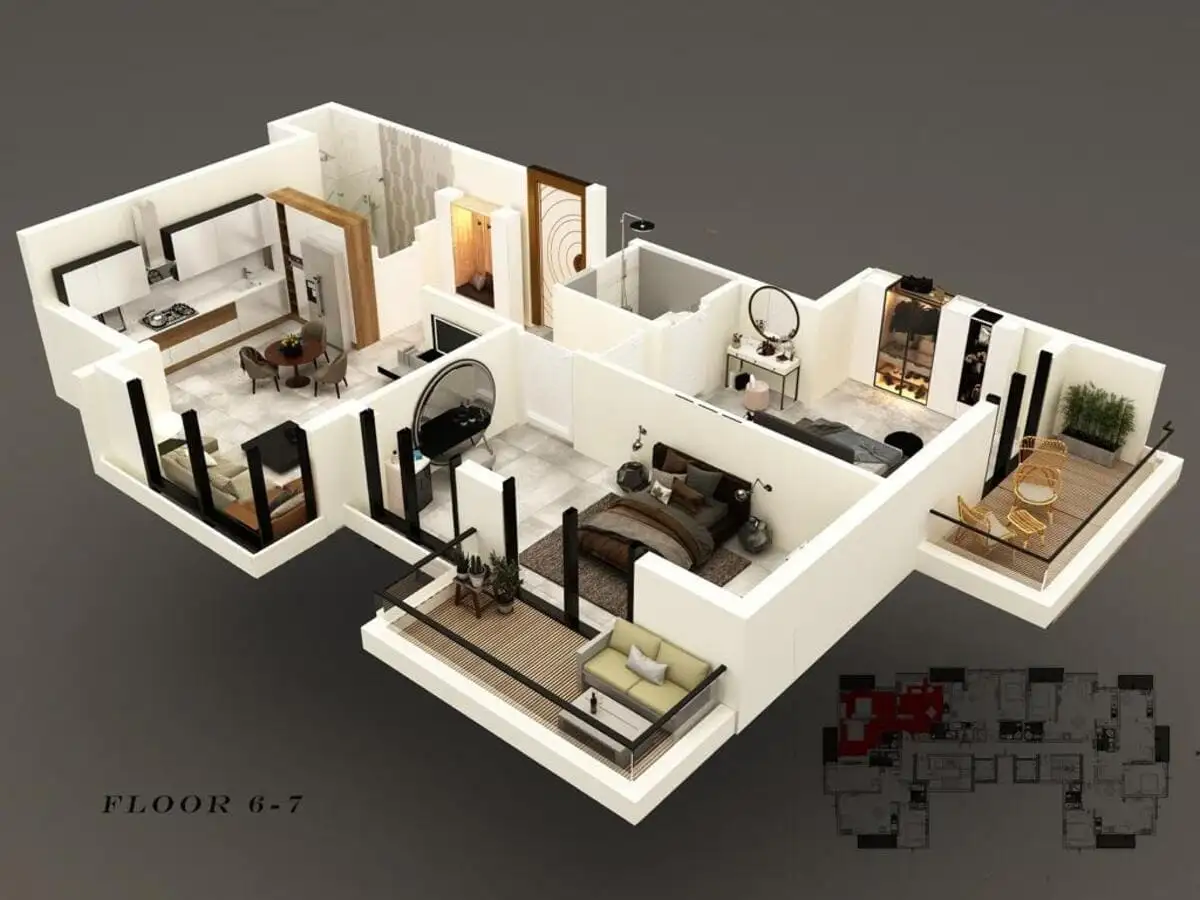 Внутри: Апартаменты предлагаются в стандартной чистовой отделке со встроенным кухонным гарнитуром и с полностью укомплектованными санузлами.