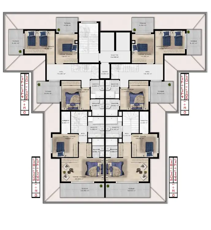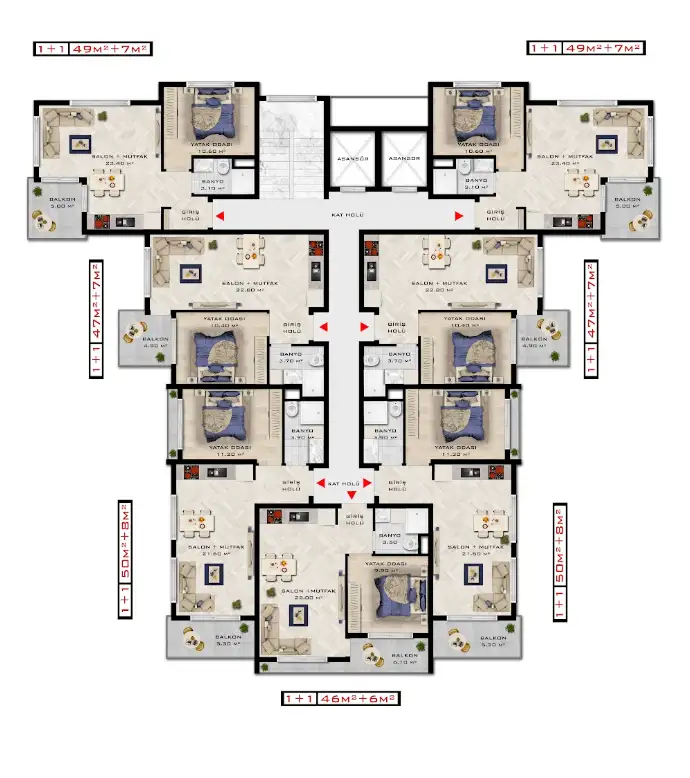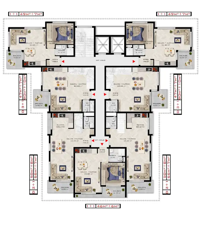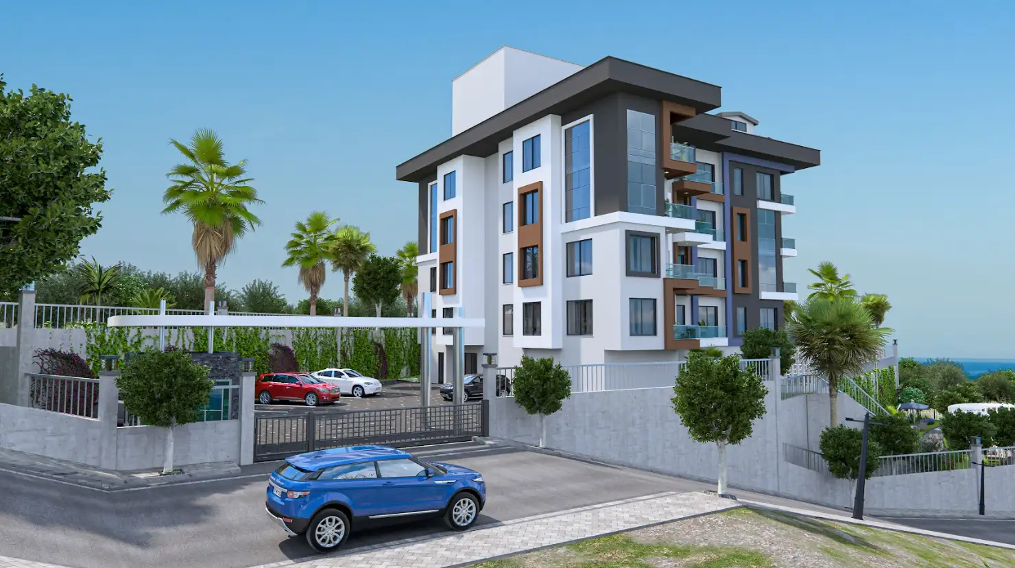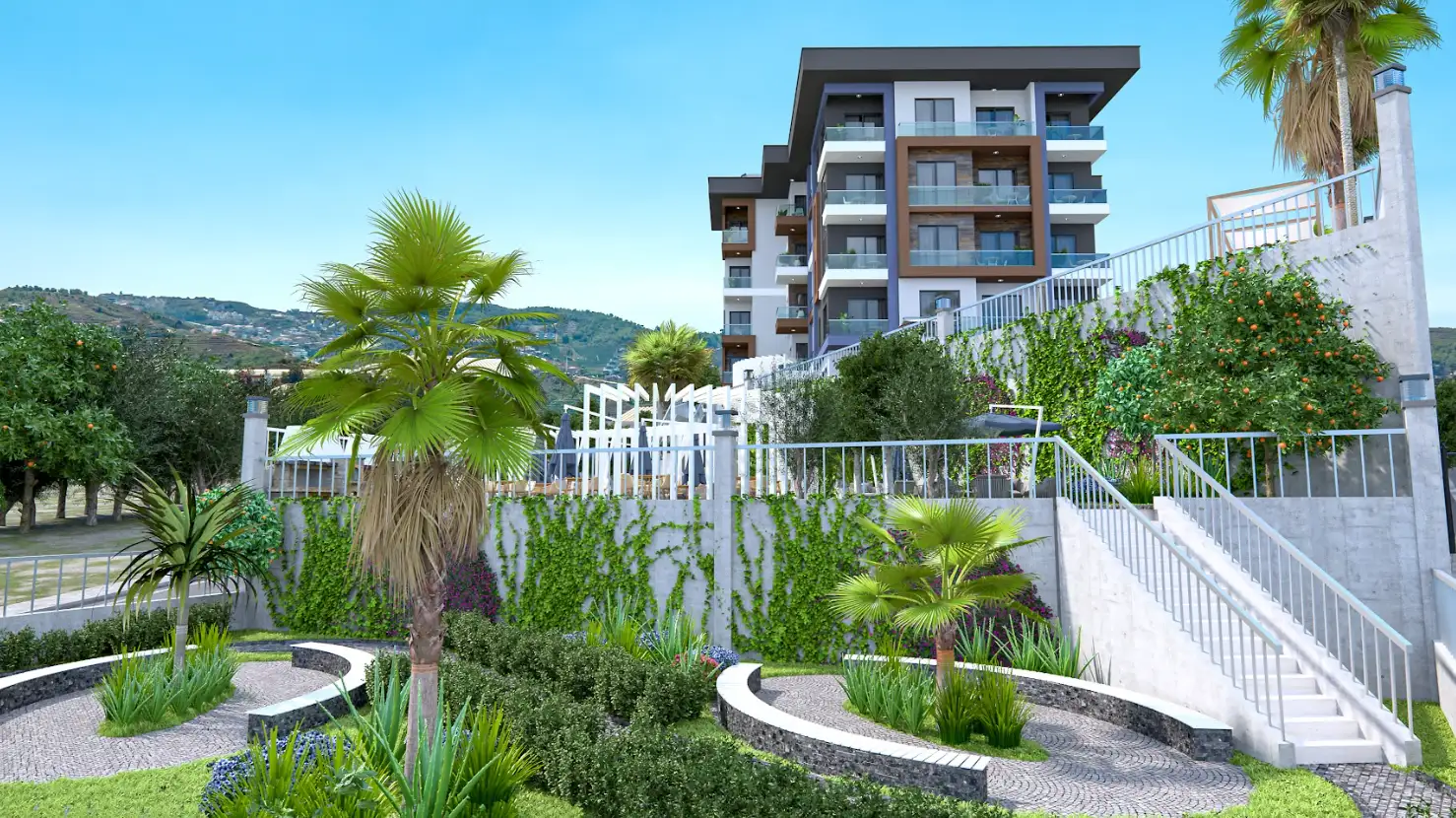 Внутри: В комплексе представлены апартаменты комфорт-класса, включая 24 квартиры с видами на море и горы. Планировки включают 1+1 площадью 52-58 м2, 2+1 пентхаусы площадью 131 м2 и 3+1 пентхаусы общей площадью 154 м2. Все квартиры сдаются в полной чистовой отделке высокого качества.