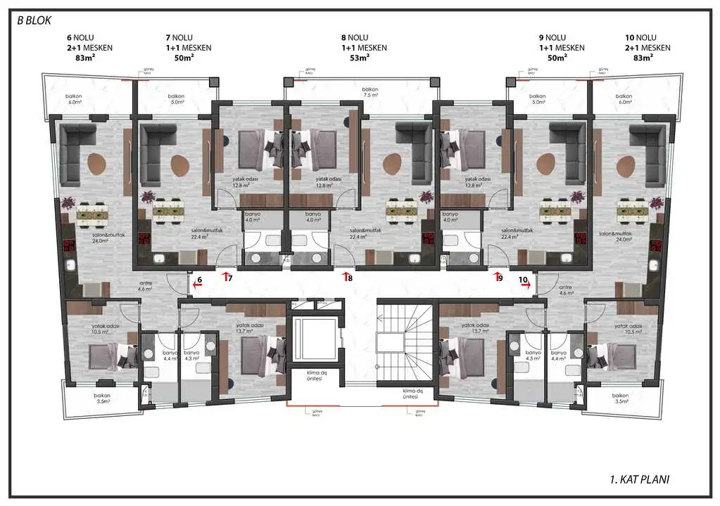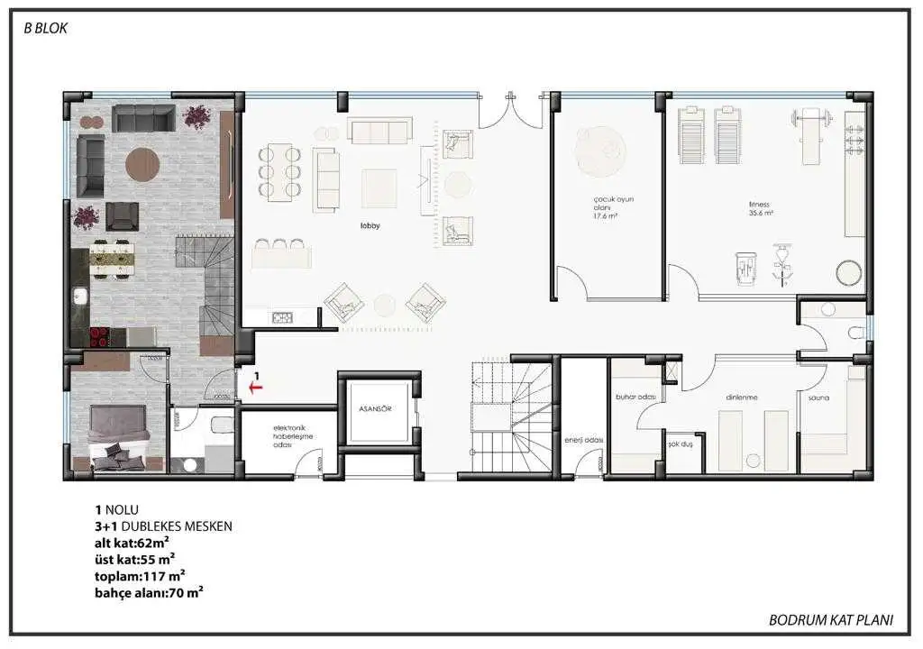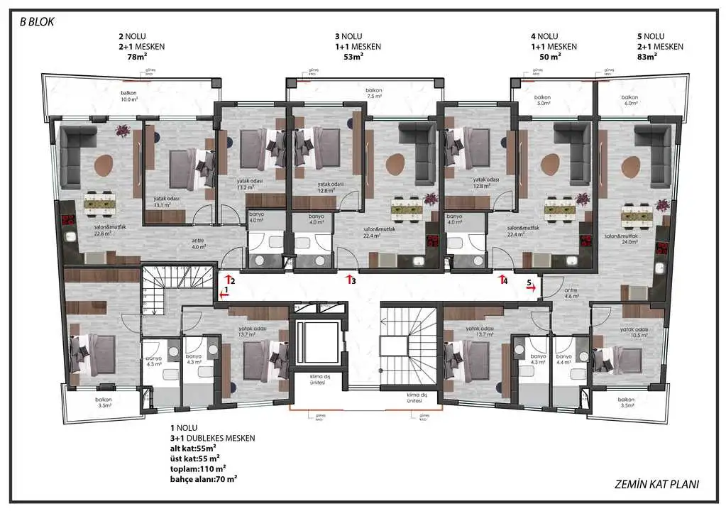 Садовые дуплексы 3+1 с площадью 110 м2 - гостиная, три спальни, отдельная кухня, ванная комната, 2 санузла, балкон и собственный сад площадью 70 м2.