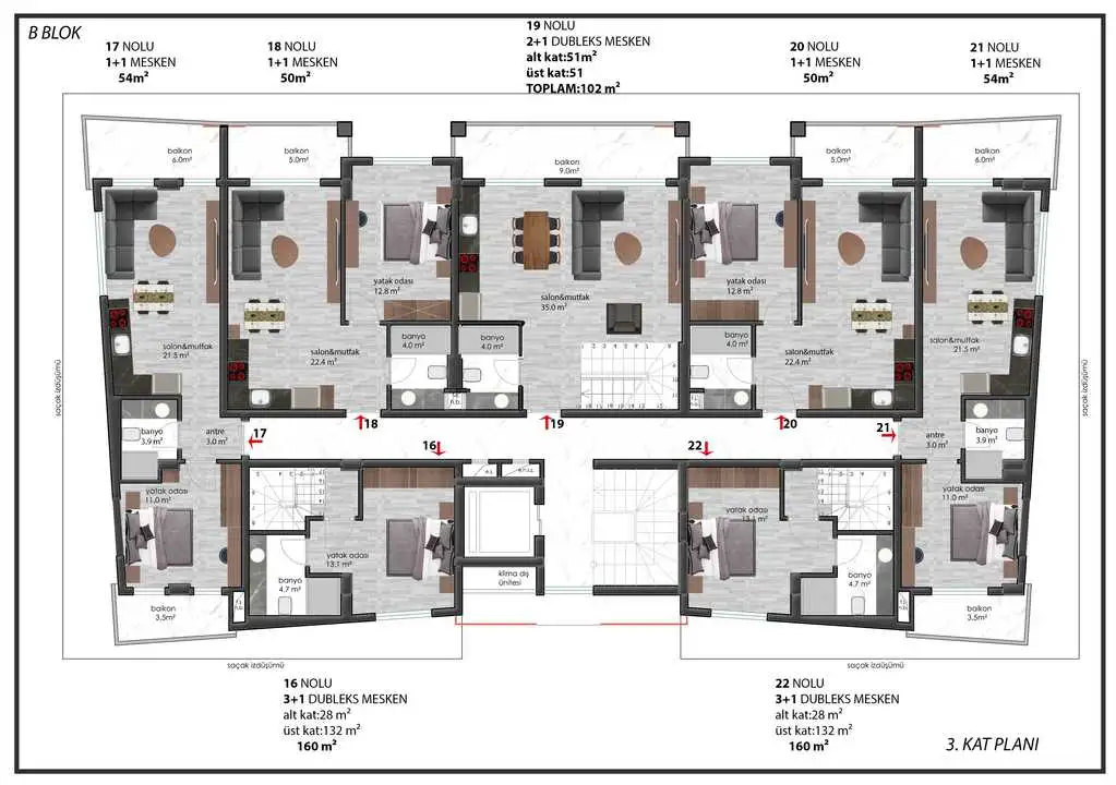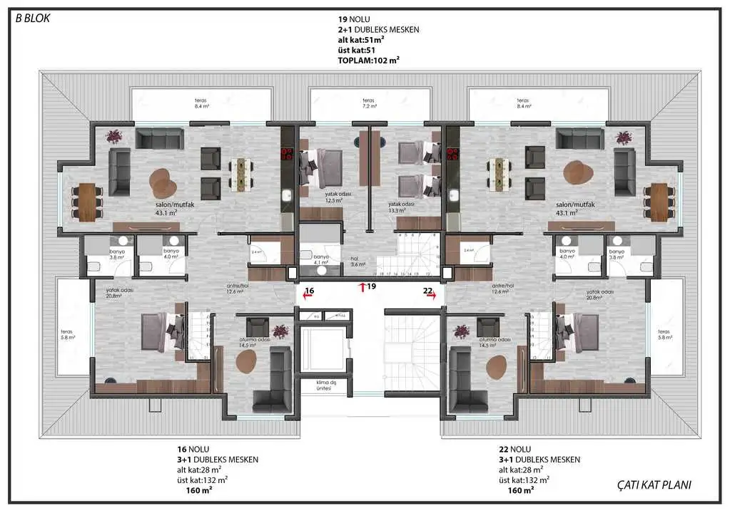 Пентхаусы 3+1 с площадью 160 м2 включают в себя гостиную, три спальни, кухню открытой планировки, 2 санузла, ванную комнату, кладовую и 2 террасы;