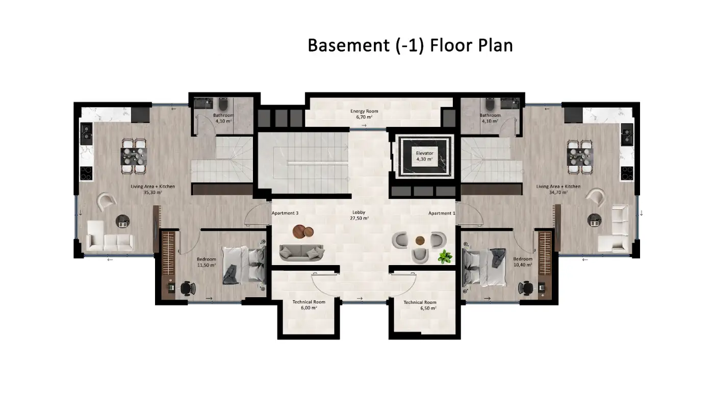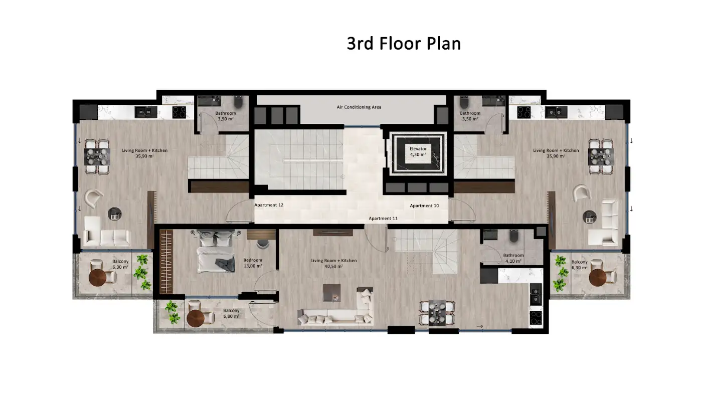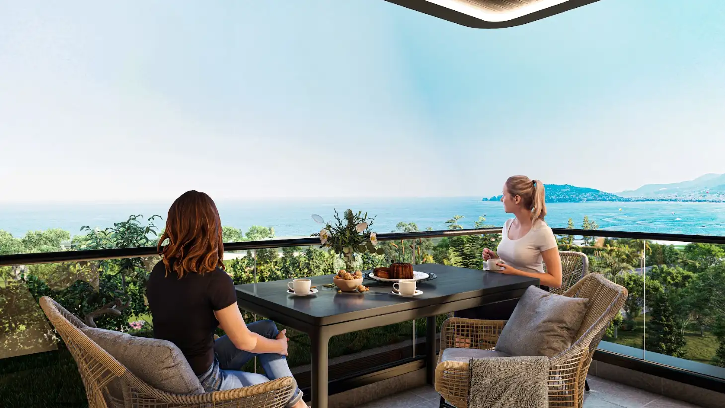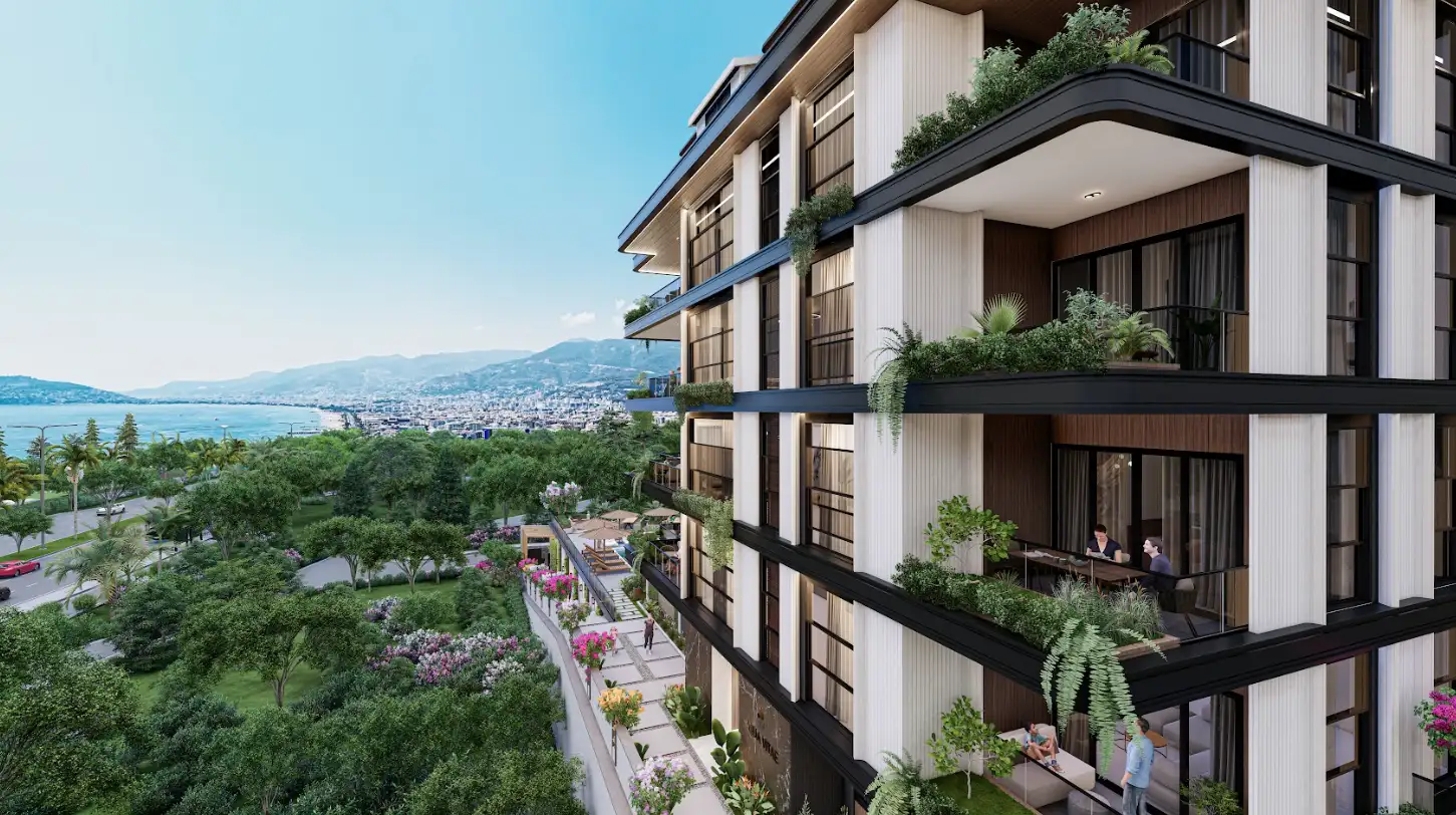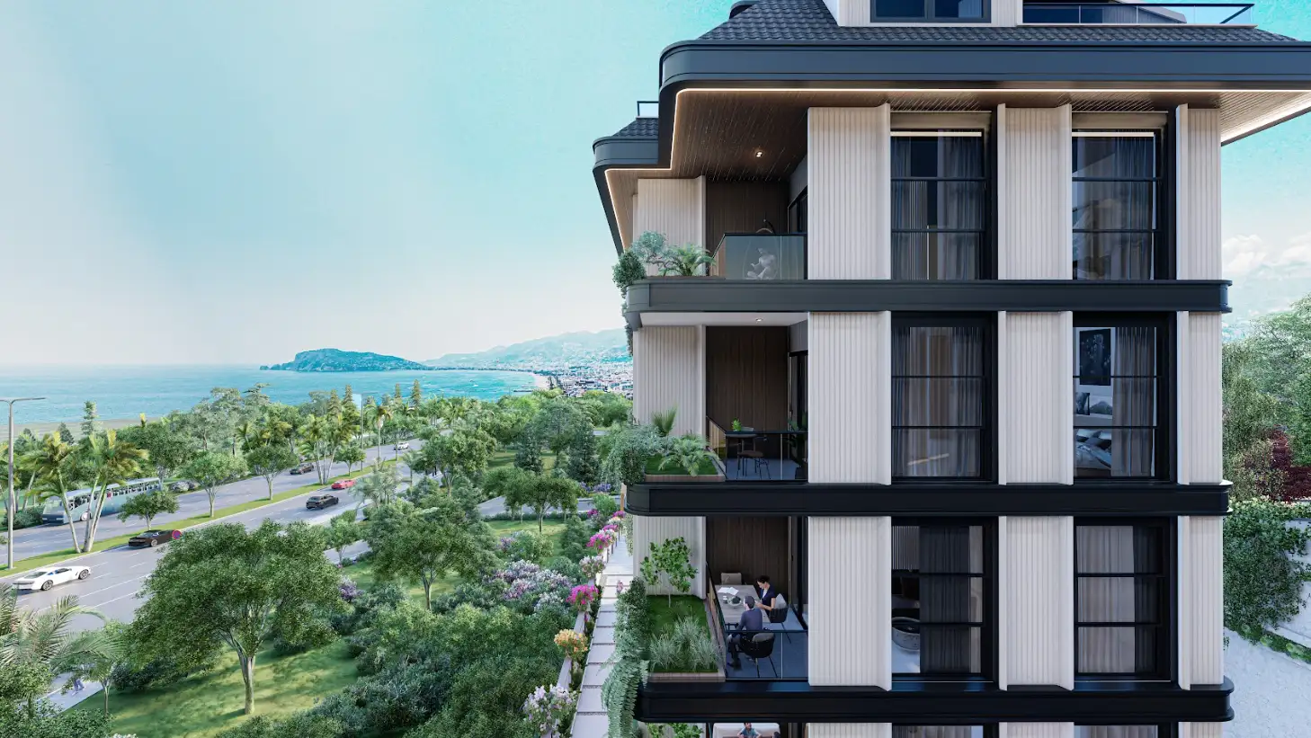 Внутри: Каждая квартира 1+1 и 2+1 дуплекс имеет потрясающий открытый вид на море. Просторные комнаты, современные интерьеры и качественная отделка создают атмосферу уюта и стиля.