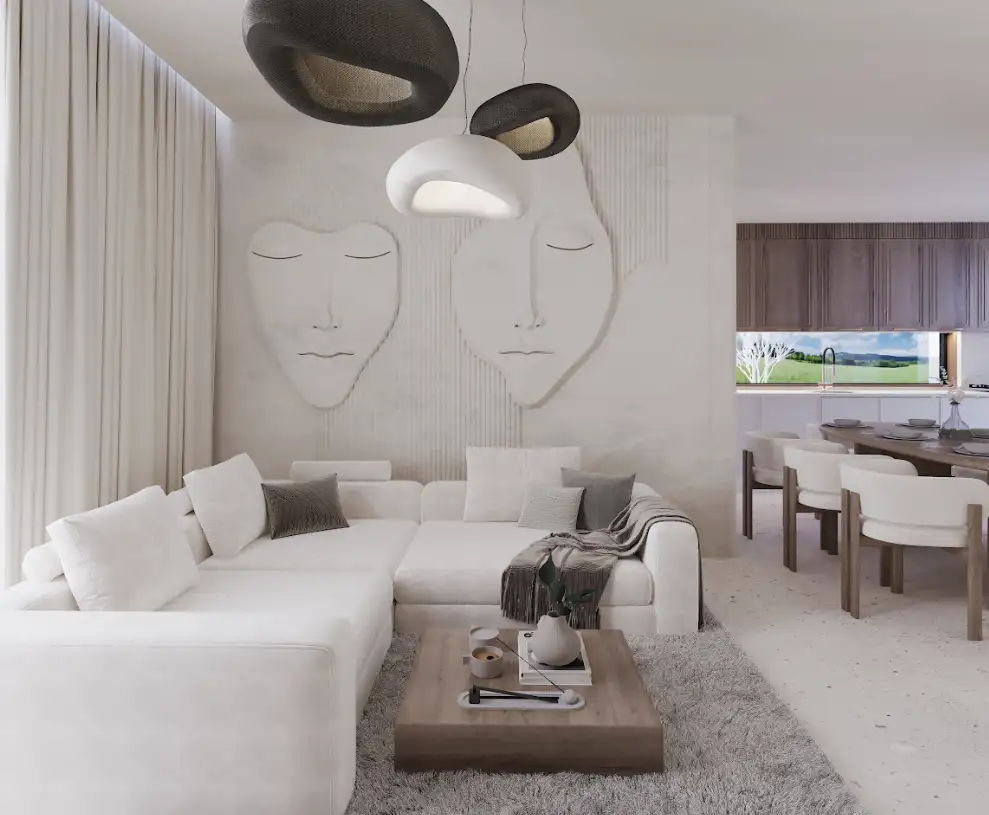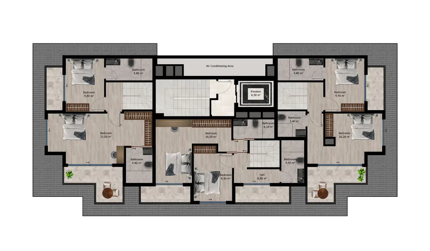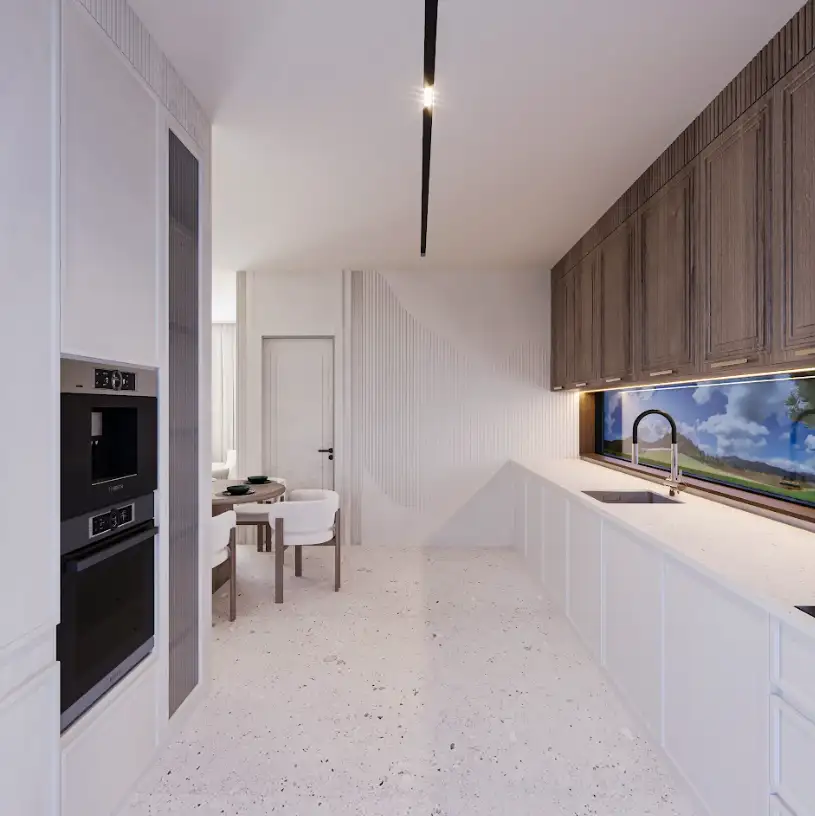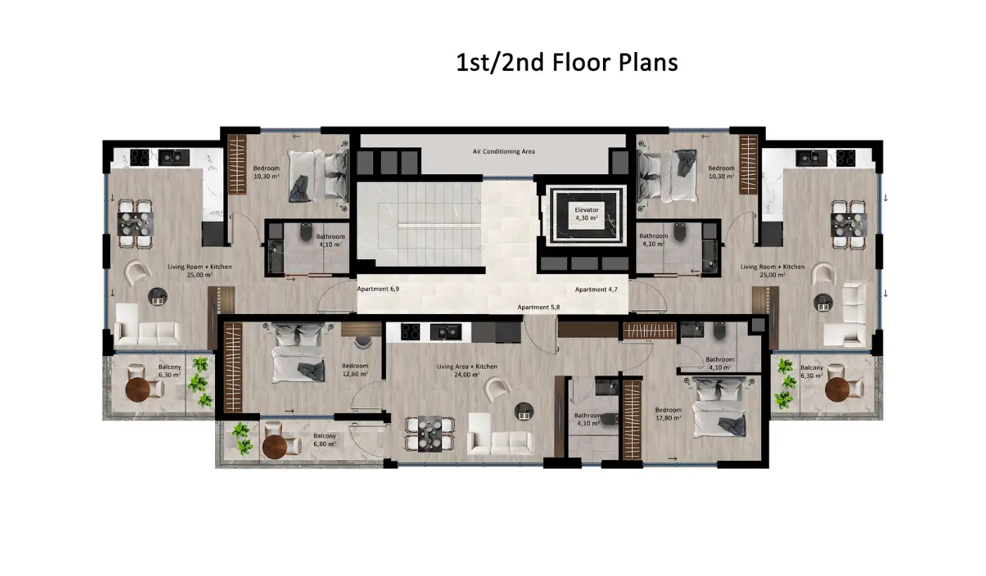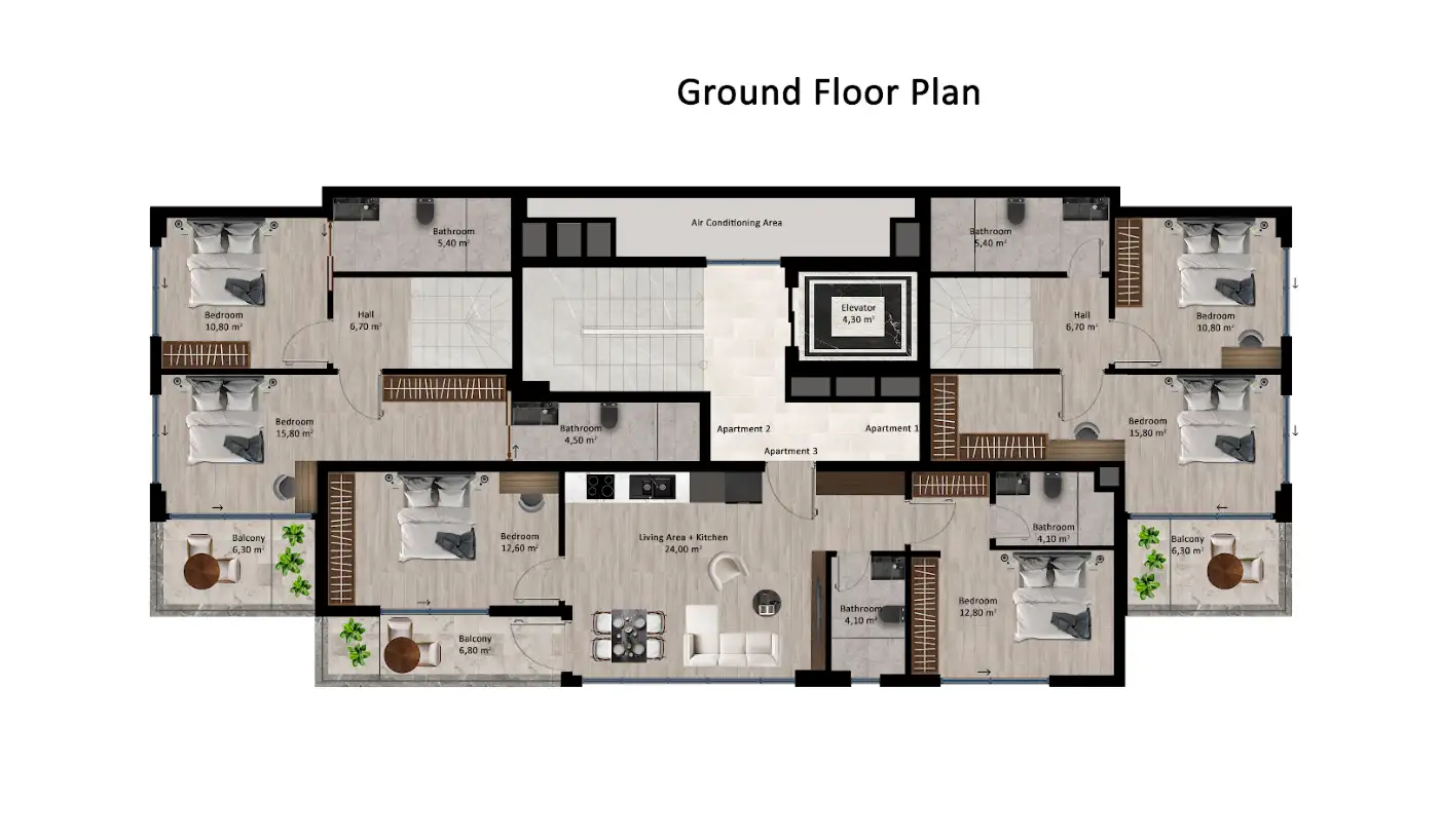 Внутри: Каждая квартира 1+1 и 2+1 дуплекс имеет потрясающий открытый вид на море. Просторные комнаты, современные интерьеры и качественная отделка создают атмосферу уюта и стиля.