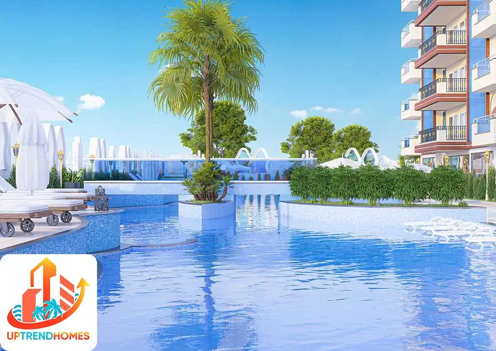 Внутри: За красивыми фасадами расположены разнообразные планировки: от экономичных квартир 1+1 площадью от 45,6 кв. м до больших двухуровневых квартир 3+1 площадью до 176 кв. м. Все квартиры жилого комплекса сдаются с полной чистовой отделкой, установленным кухонным гарнитуром и полностью укомплектованными сан.узлами. На верхних этажах располагаются пентхаусы с просторными террасами, с которых открывается вид на Средиземное море.