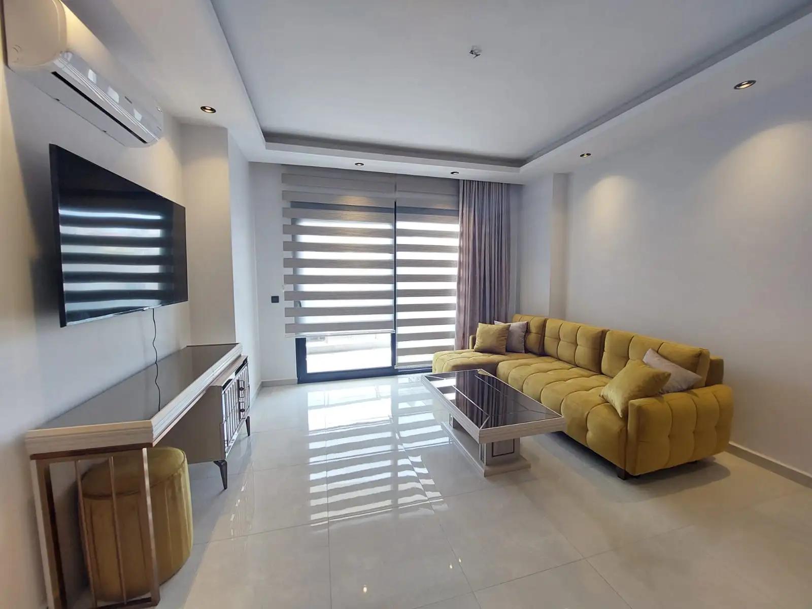 Внутри: Квартира имеет планировку 1+1, площадью 60 м². Апартаменты расположены на пятом этаже. С видом на город. Квартира продается с новой мебелью и техникой.