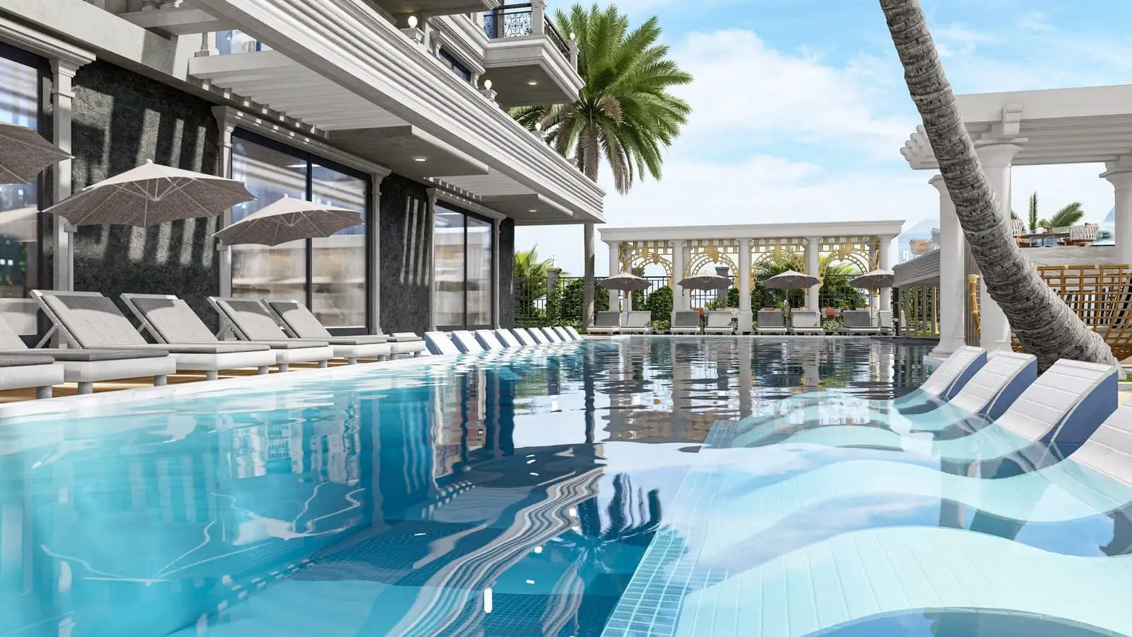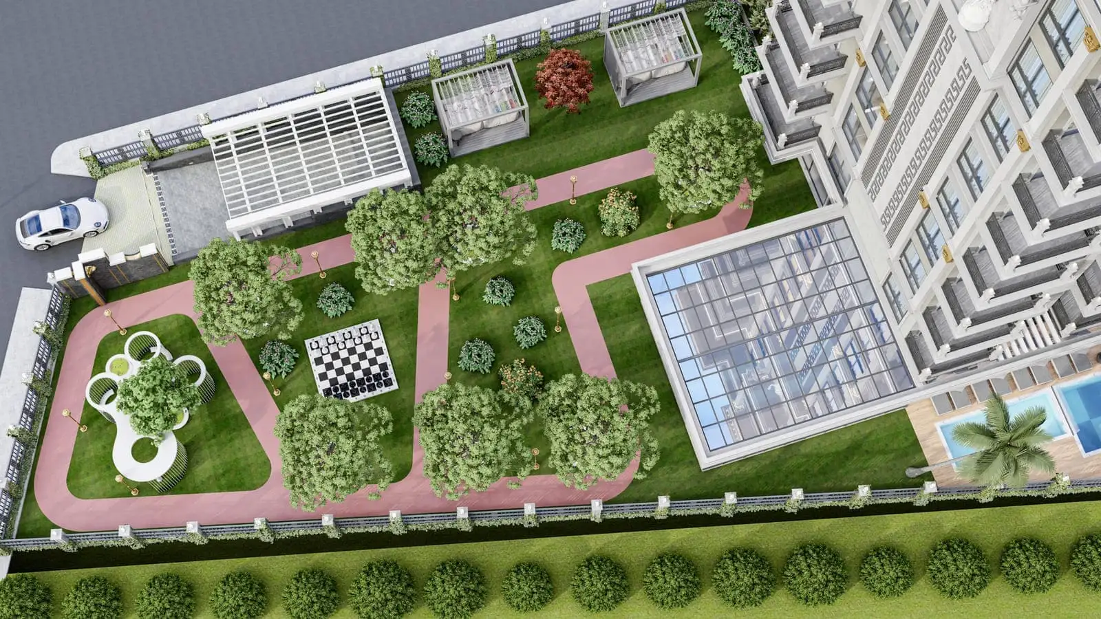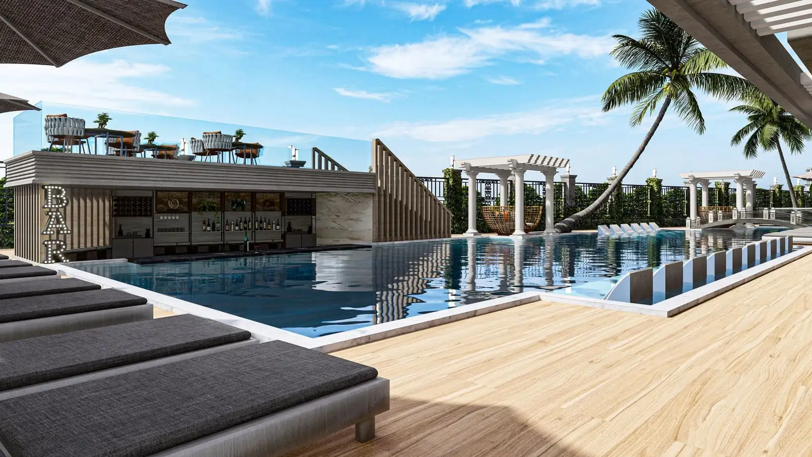 Что в комплексе: На закрытой территории площадью 2 250 м2 будет расположен 1 жилой блок на 63 квартиры, открытый бассейн, бар у бассейна, беседки для отдыха, зона отдыха и барбекю, детская площадка, финская сауна, римская парная, фитнес, крытый бассейн, открытая и крытая парковки.