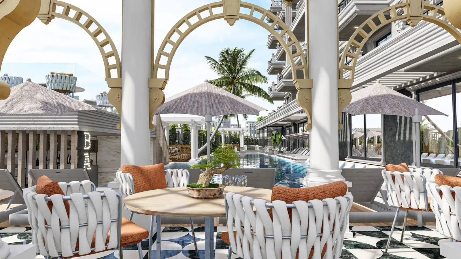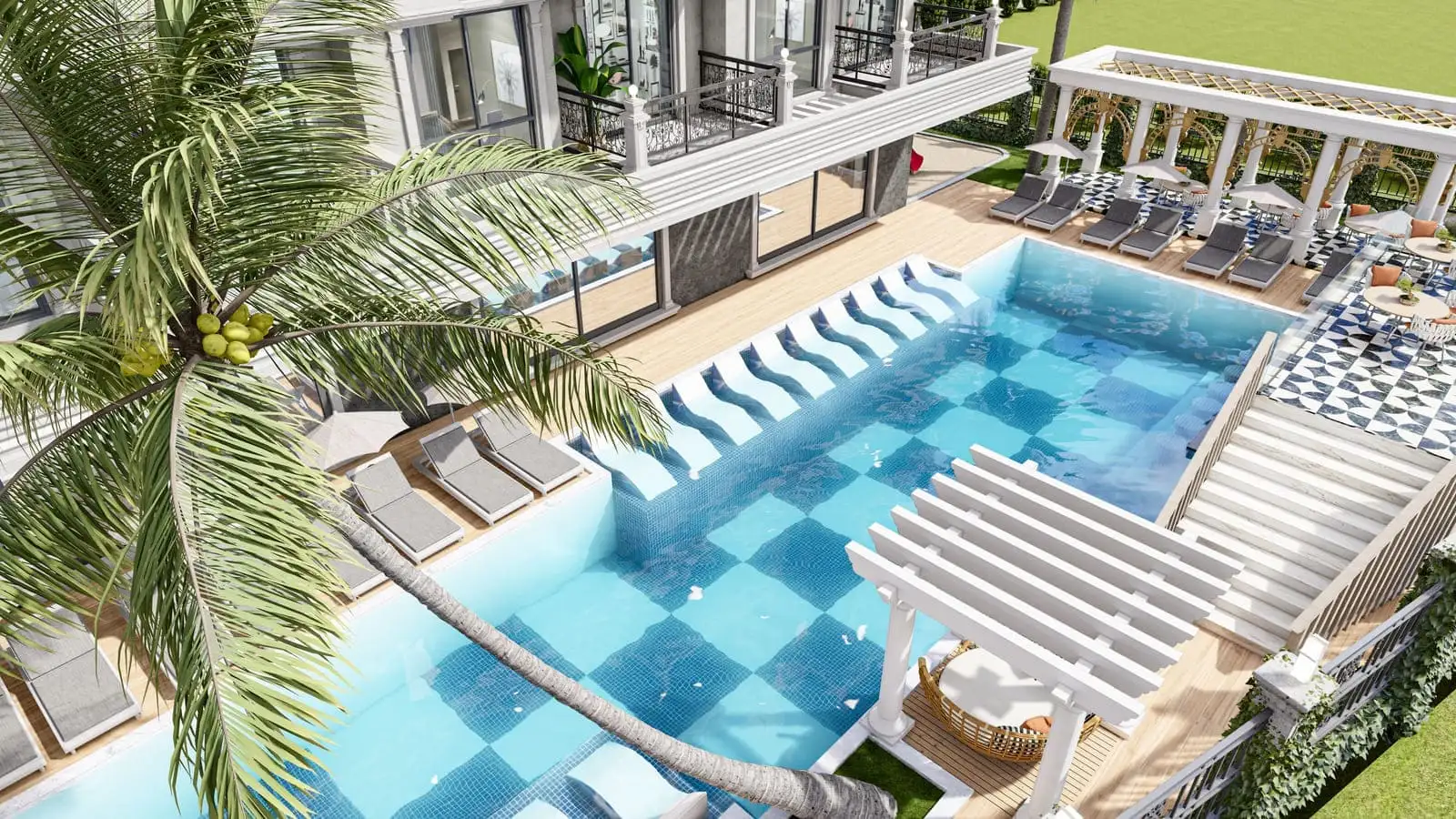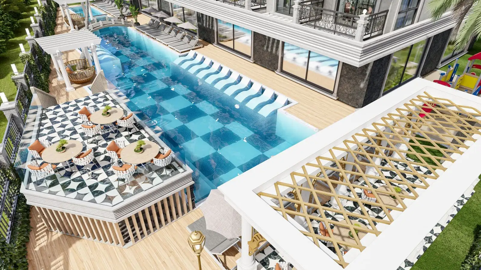 Что в комплексе: На закрытой территории площадью 2 250 м2 будет расположен 1 жилой блок на 63 квартиры, открытый бассейн, бар у бассейна, беседки для отдыха, зона отдыха и барбекю, детская площадка, финская сауна, римская парная, фитнес, крытый бассейн, открытая и крытая парковки.