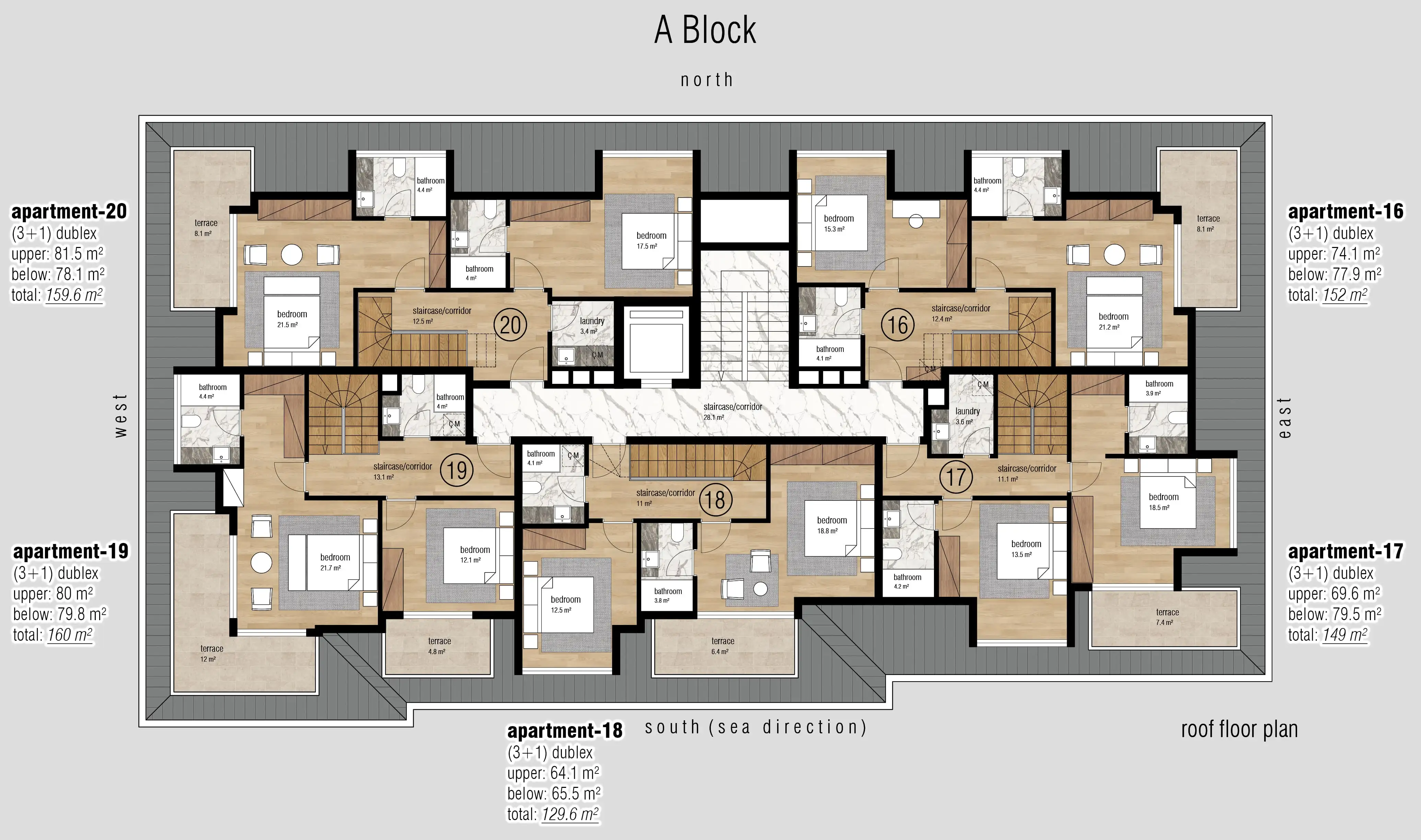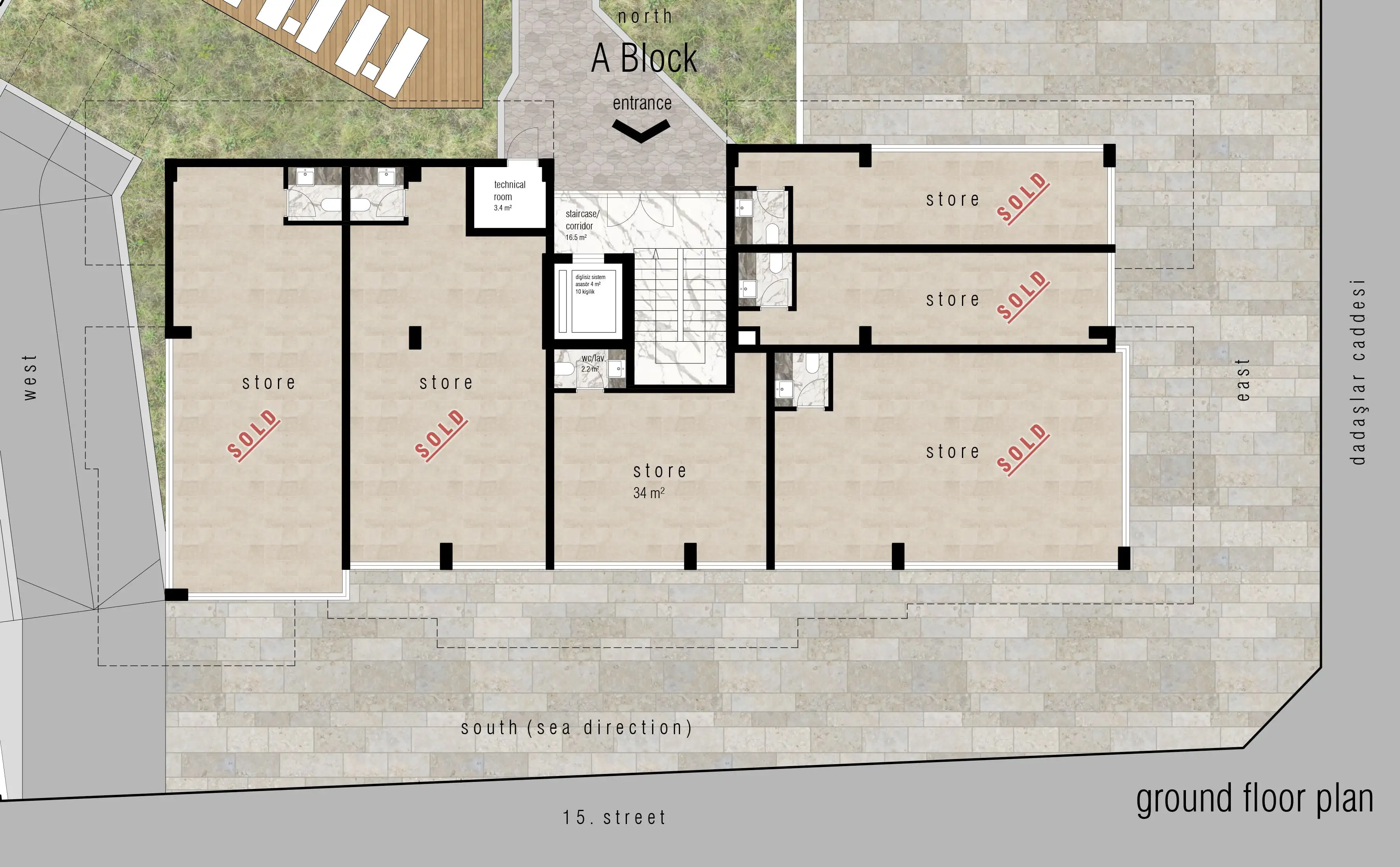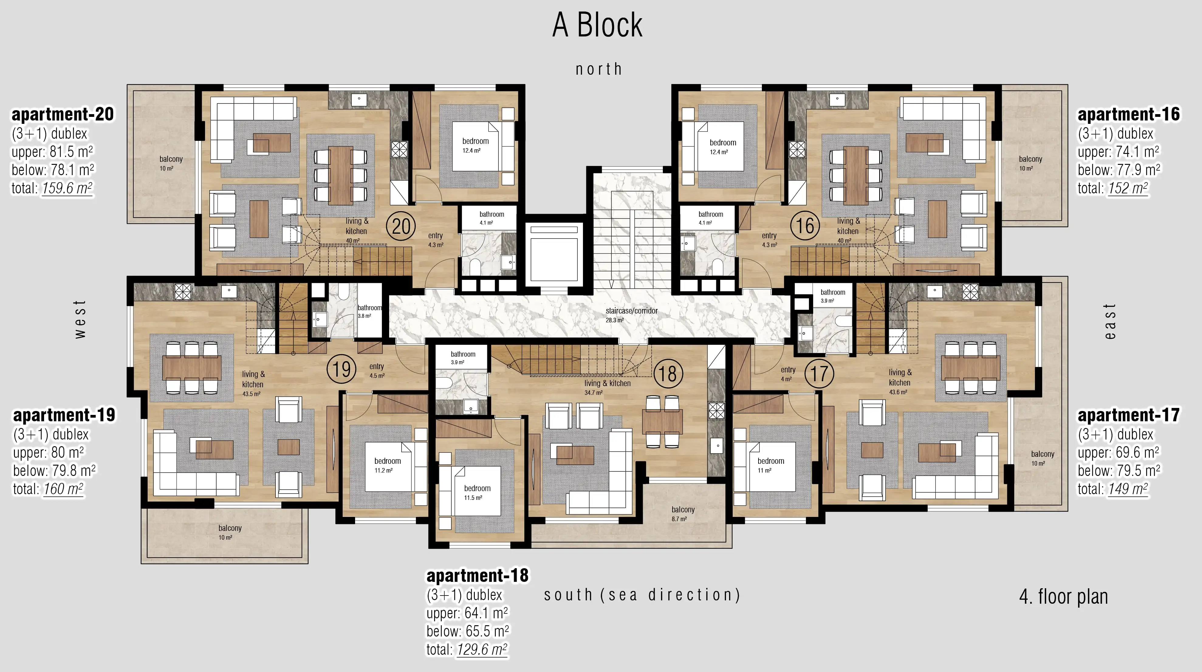 Внутри: Все квартиры выполнены в современном дизайне и оснащены высококачественными материалами, включая подогрев полов в ванных комнатах, электрический водонагреватель, встроенные точечные светильники, панорамные балконные двери, стальные входные двери и двойные стеклопакеты для максимальной безопасности и комфорта, видеодомофон, современную полностью оборудованную кухню, а также керамическое покрытие пола и отделку ванных комнат