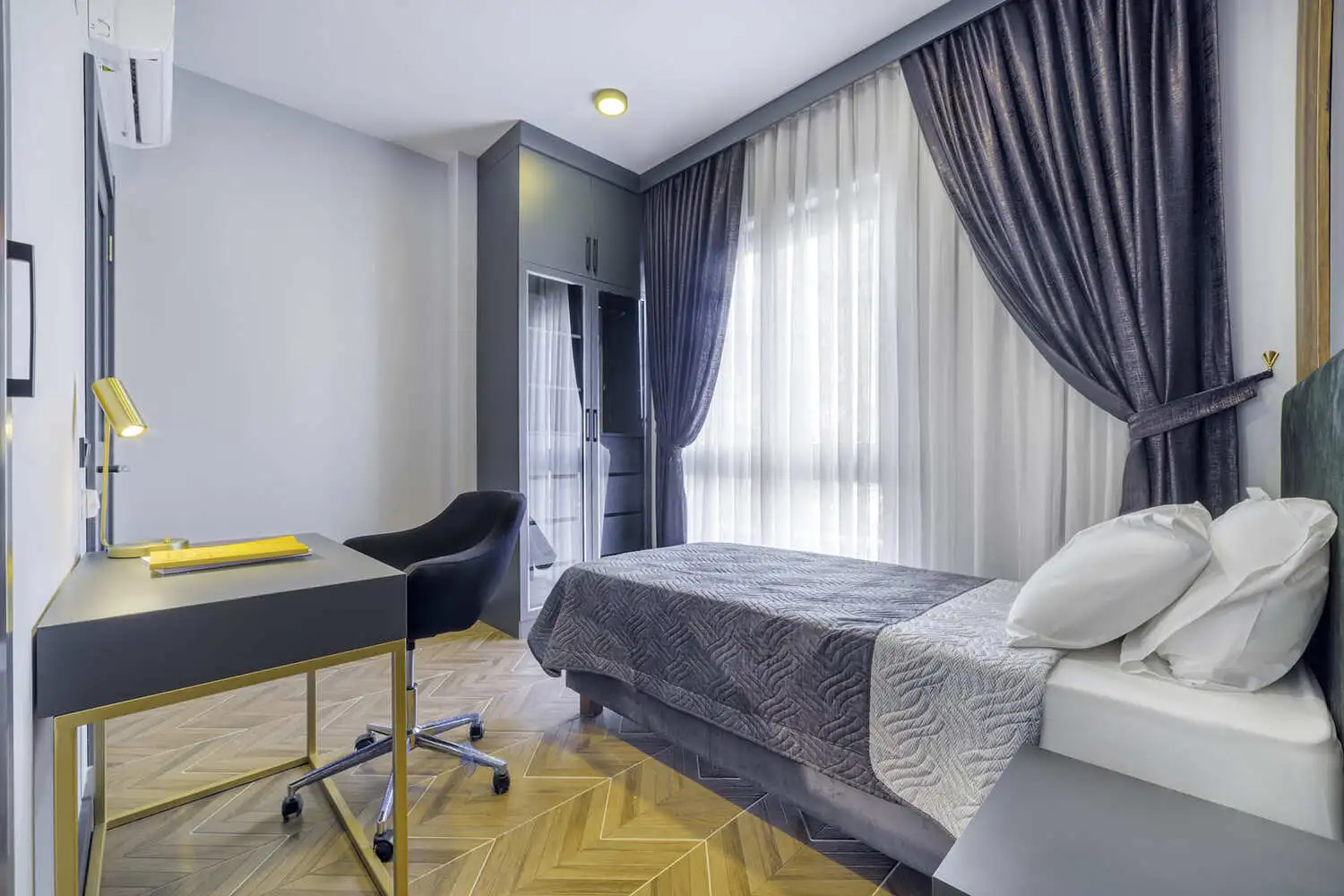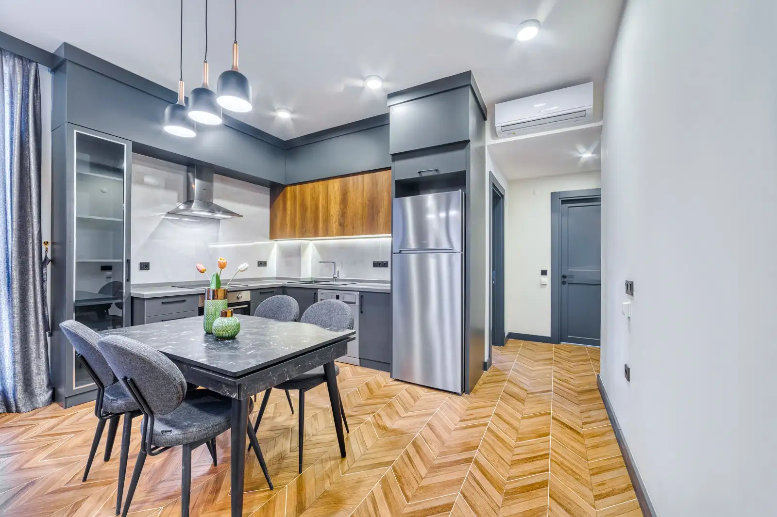 Апартаменты продаются в чистовой отделке, с уже установленными инверторными кондиционерами, с качественными окнами и дверьми, декоративным освещением в комнатах, подогревом полов во всех комнатах, звукоизоляцией между квартирами. Также в стоимость входят все расходы, связанные с оформлением права собственности. Доступны планировки: