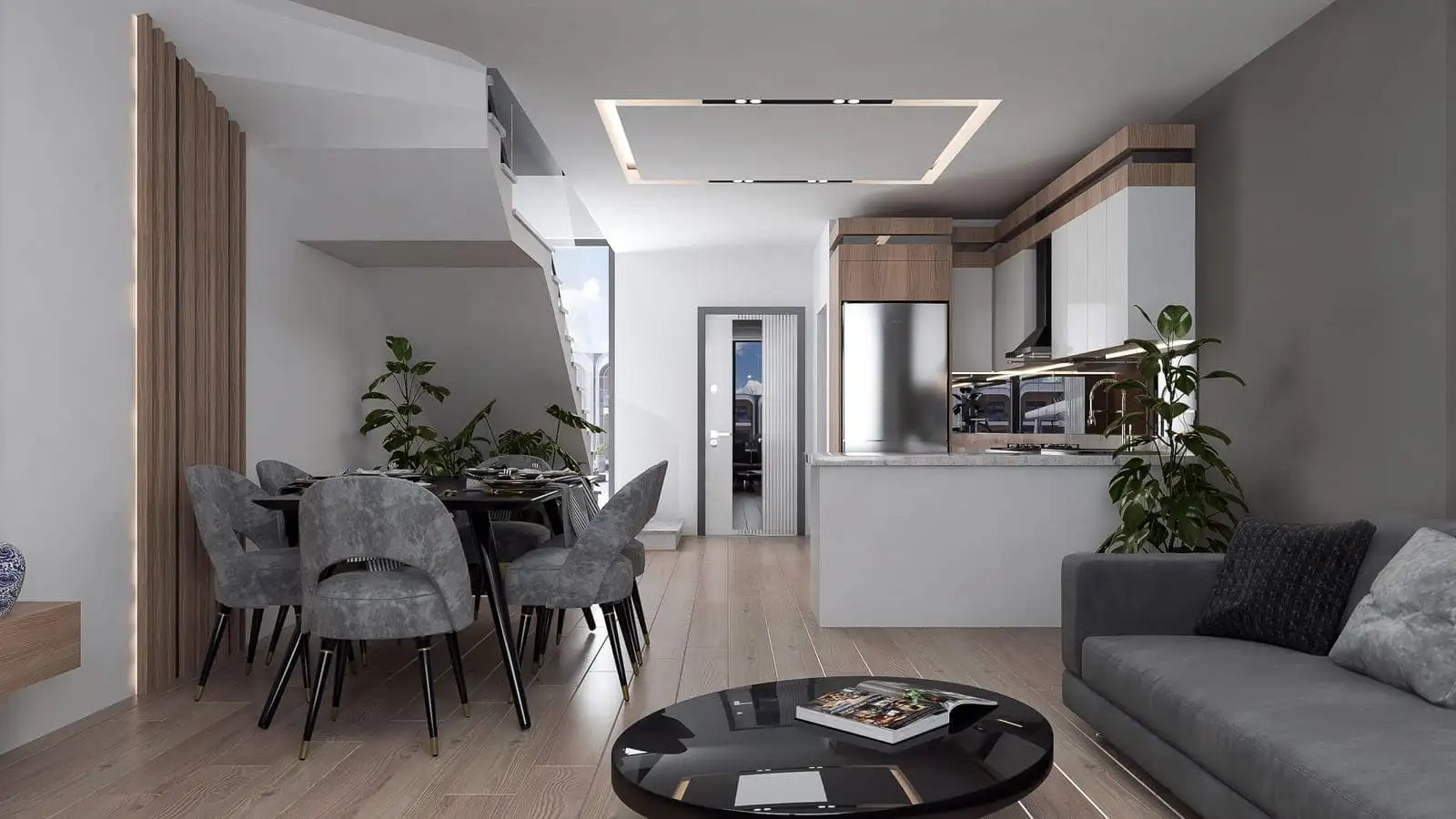 Внутри: Доступны апартаменты планировкой 1+1 площадью 72 м2 и дуплексы 2+1 площадью 120 м2.