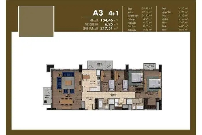4+1 площадью от 132, 99 м2 до 138,61 м2.
