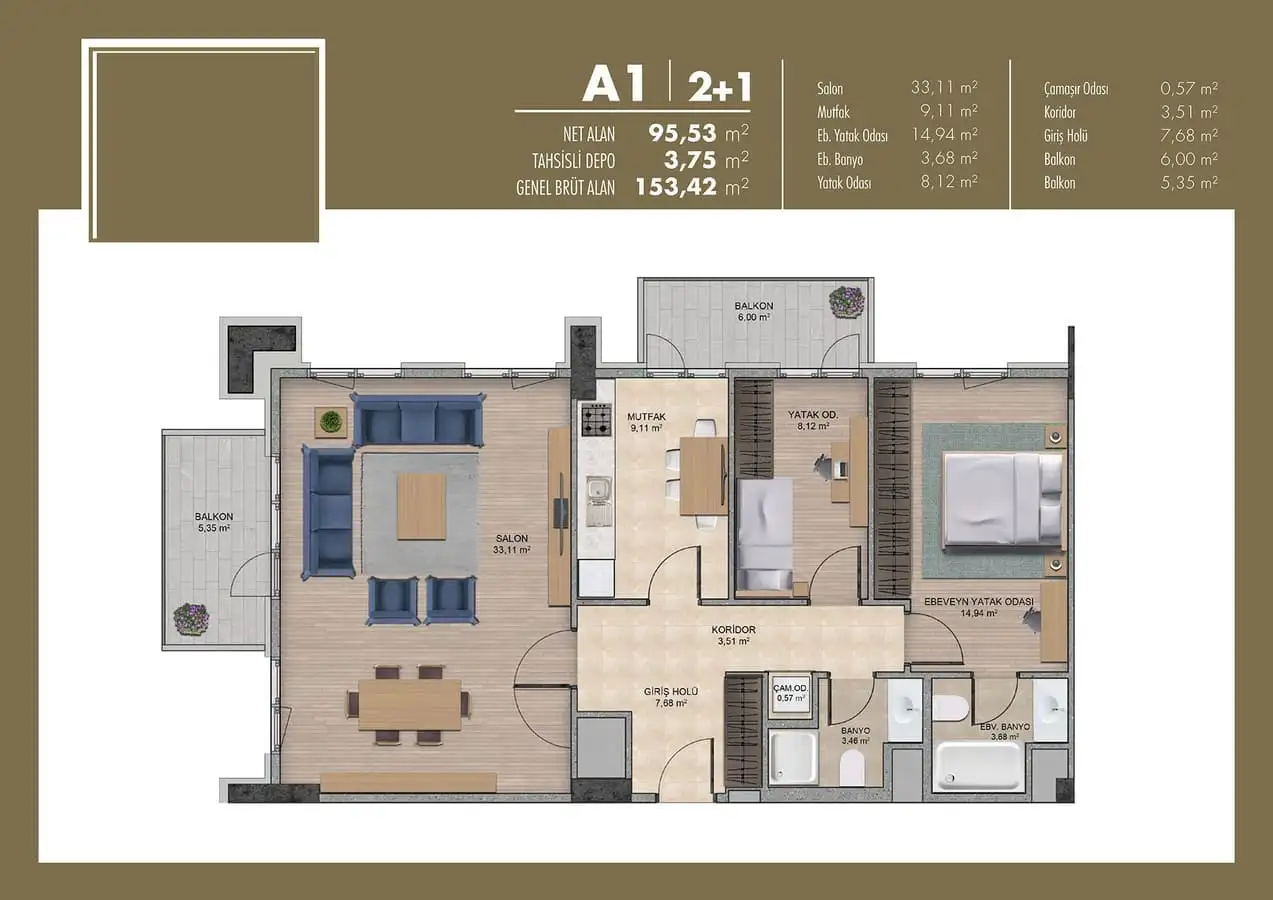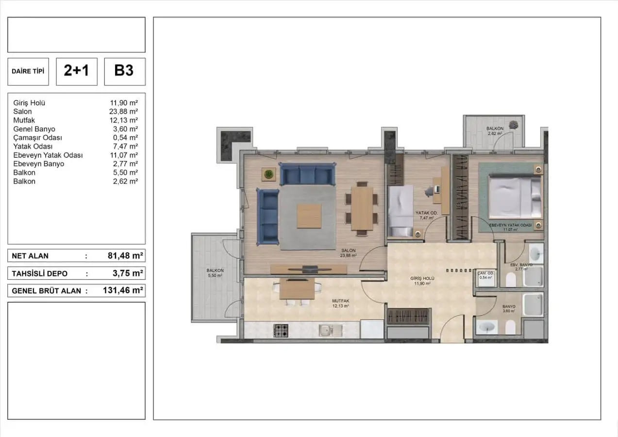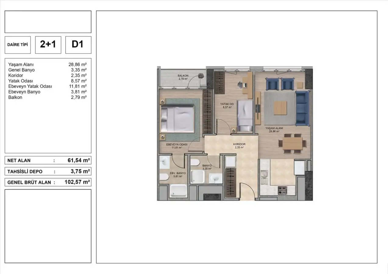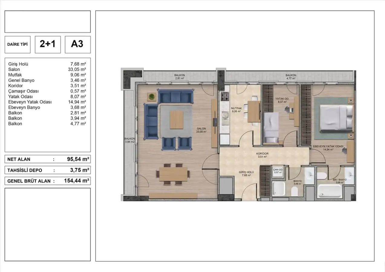2+1 площадью от 61,54 м2 до 95,54 м2;