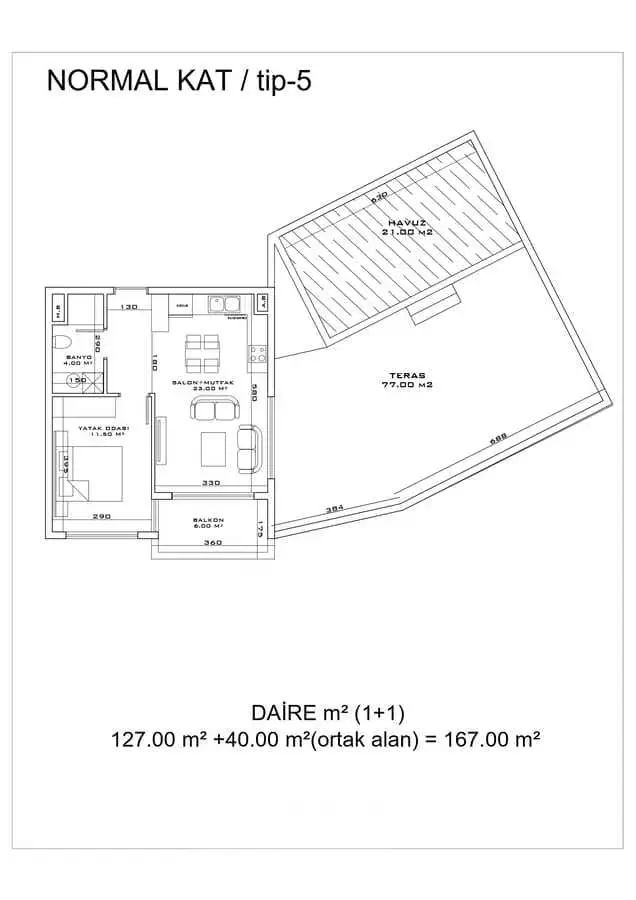 1+1 с бассейном на террасе площадью от 50 м²до 127 м²;