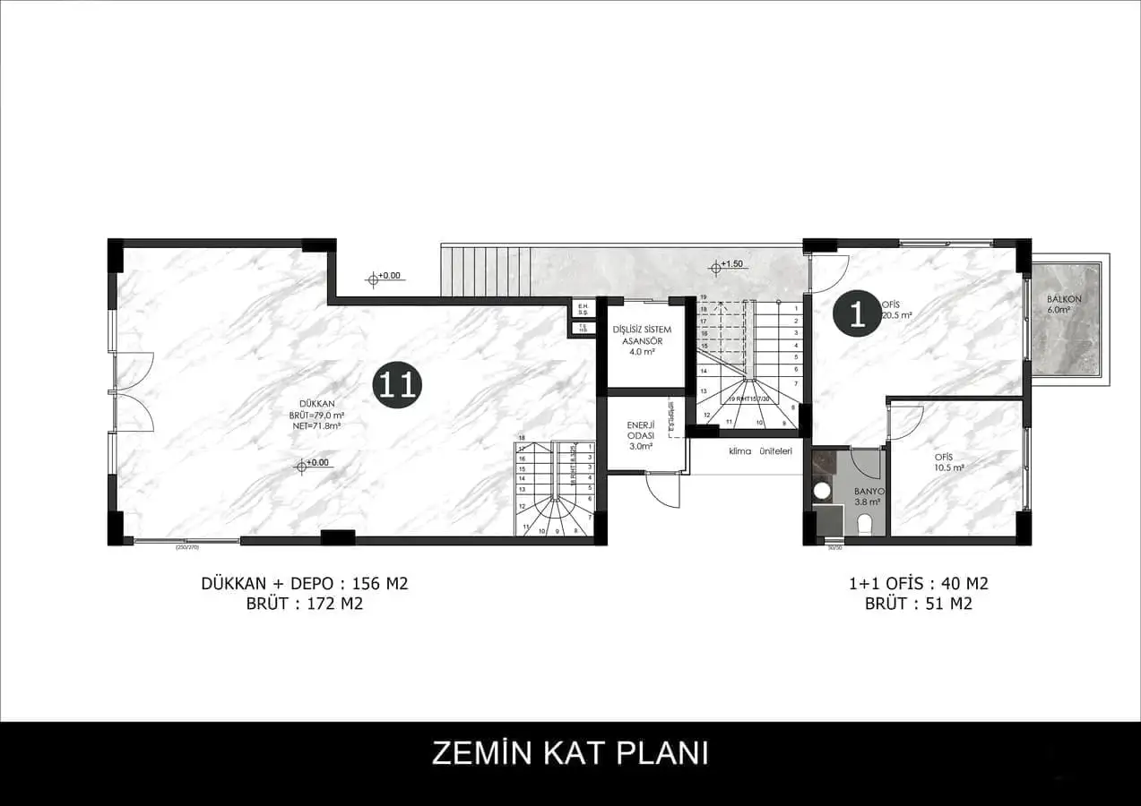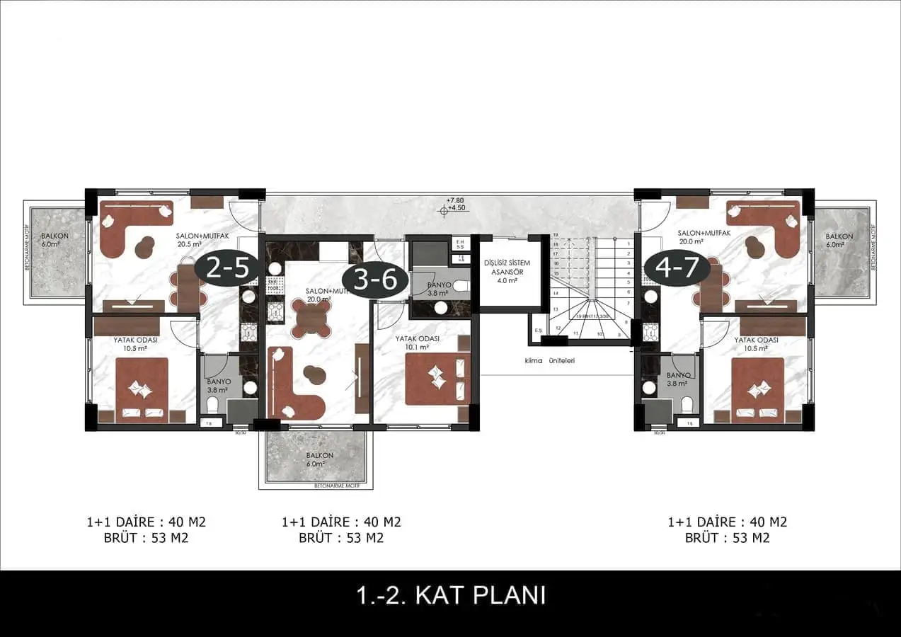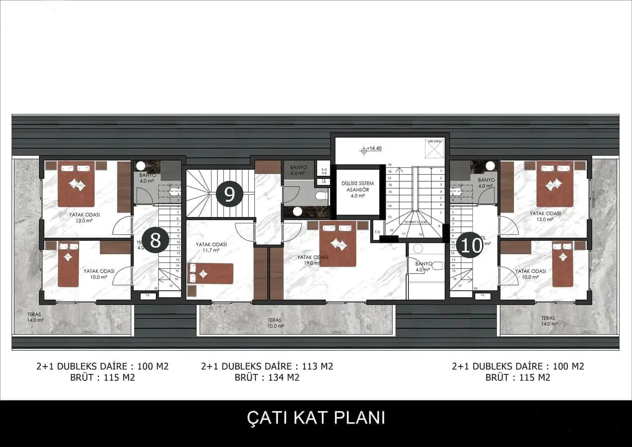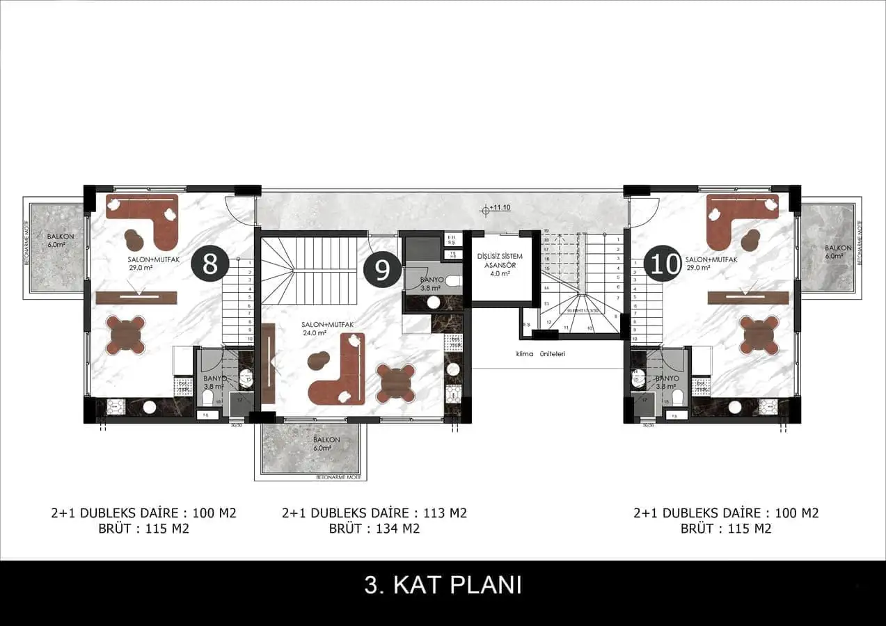 Внутри: Доступны апартаменты планировкой 1+1 площадью 44 м2 и пентхаусы 2+1 площадью 110 м2 и 113 м2.