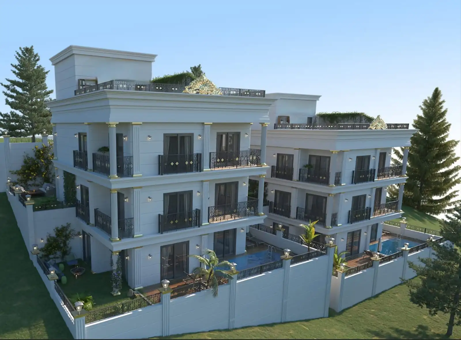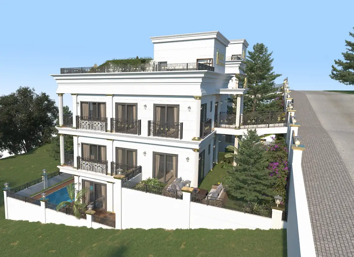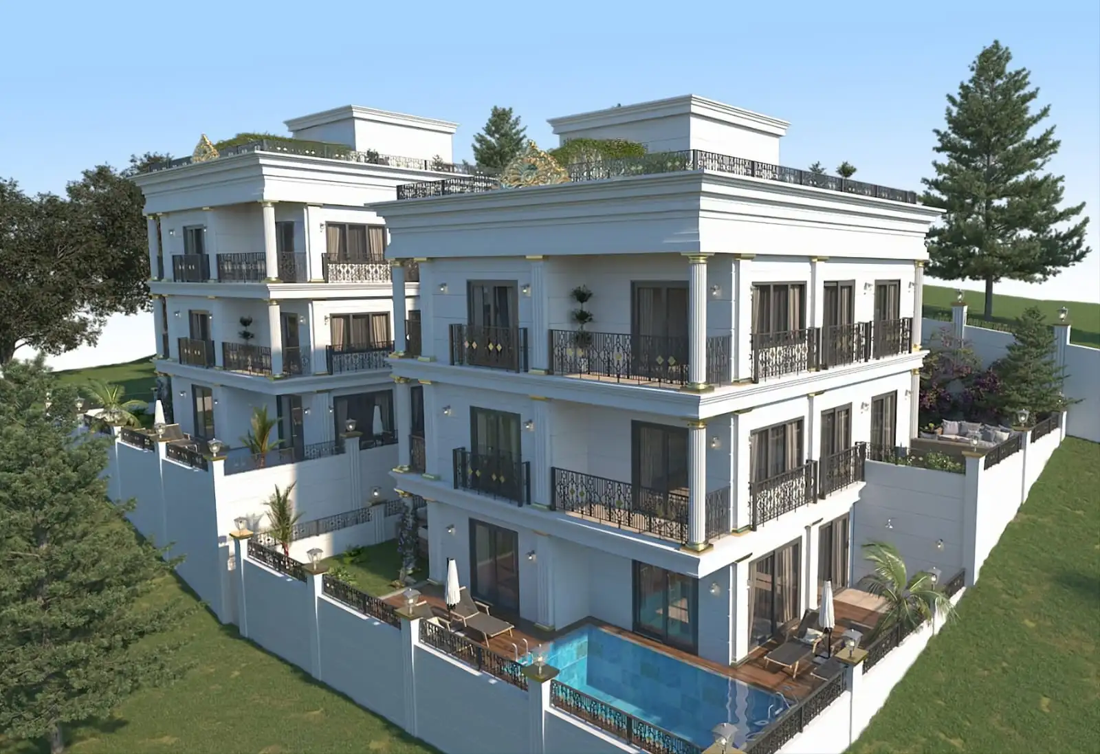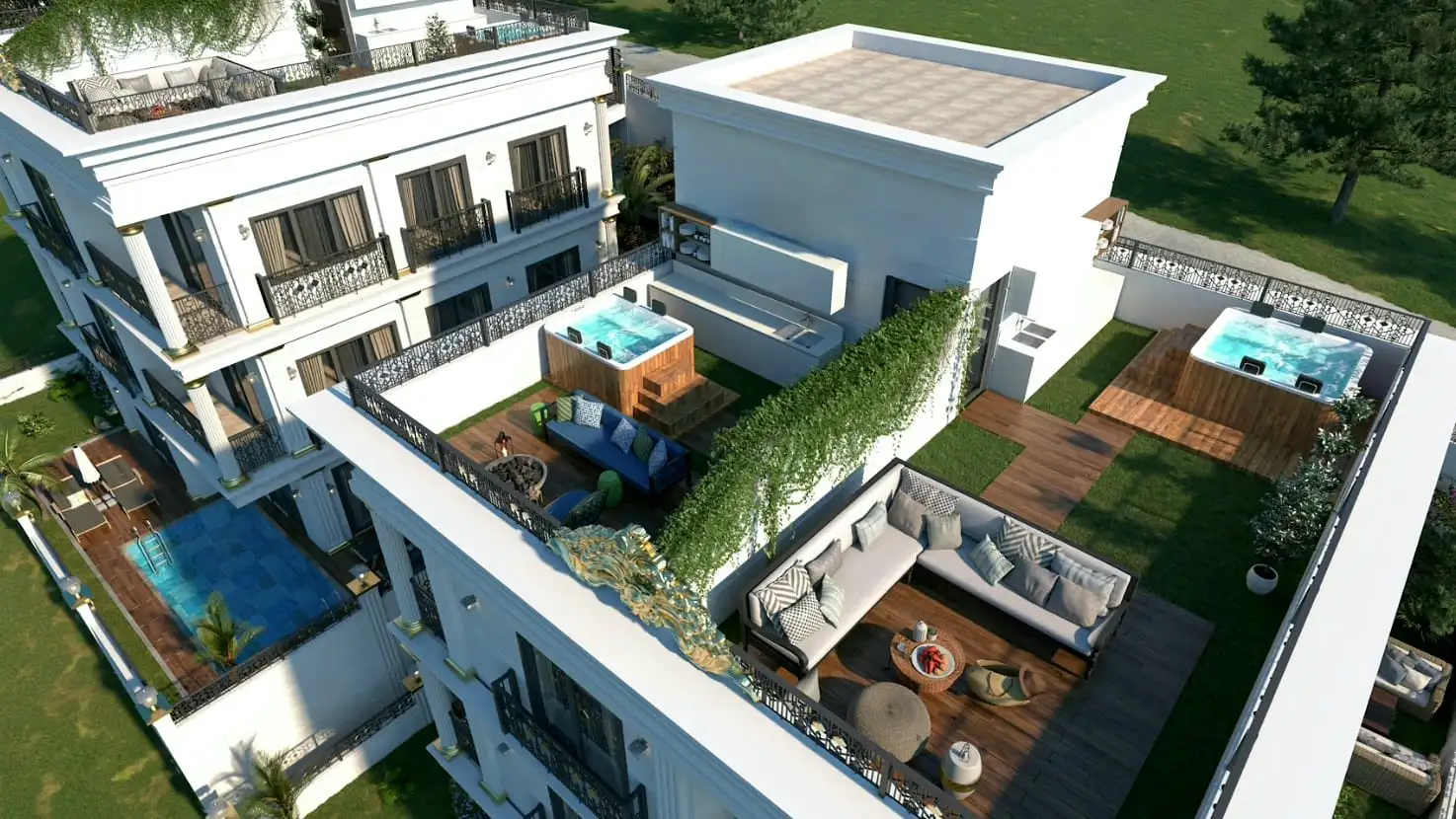 Что в комплексе: На территории комплекса, общей площадью 1975 квадратных метров, будут представлены 6 двухэтажных блоков в формате таунхаус и одна вилла в стиле Османской империи. Инфраструктура комплекса включает открытый плавательный бассейн, парковку для автомобилей, детскую игровую площадку, миниклуб, кинотеатр, сауну и фитнес-зал.