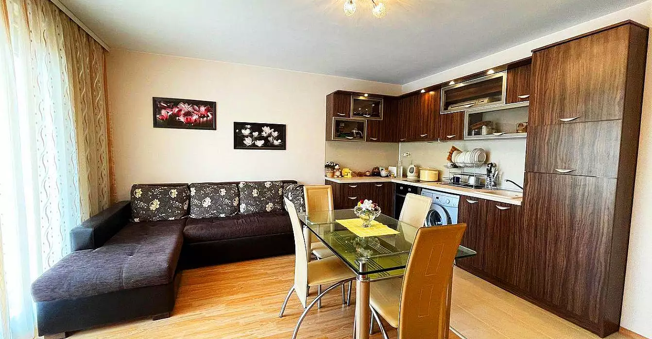 Компания Болгарский Дом с радостью представляет новинку в Равде – в первой фазе ЖК Мелия. На первом этаже к приобретению готова двухкомнатная квартира – апартамент с благоустройством и приятным дизайном интерьера. Метраж – это 54 м. кв. комфортабельного пространства, с балкона красивый вид на территорию и бассейн. Современные техника и мебель в стоимости – сделка под ключ.