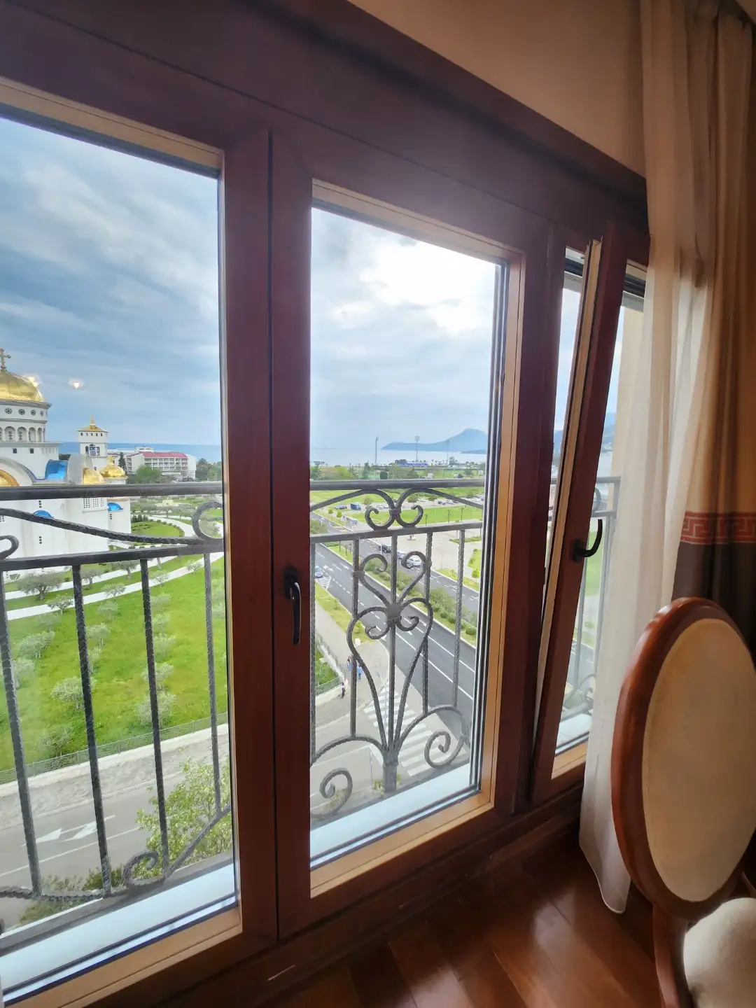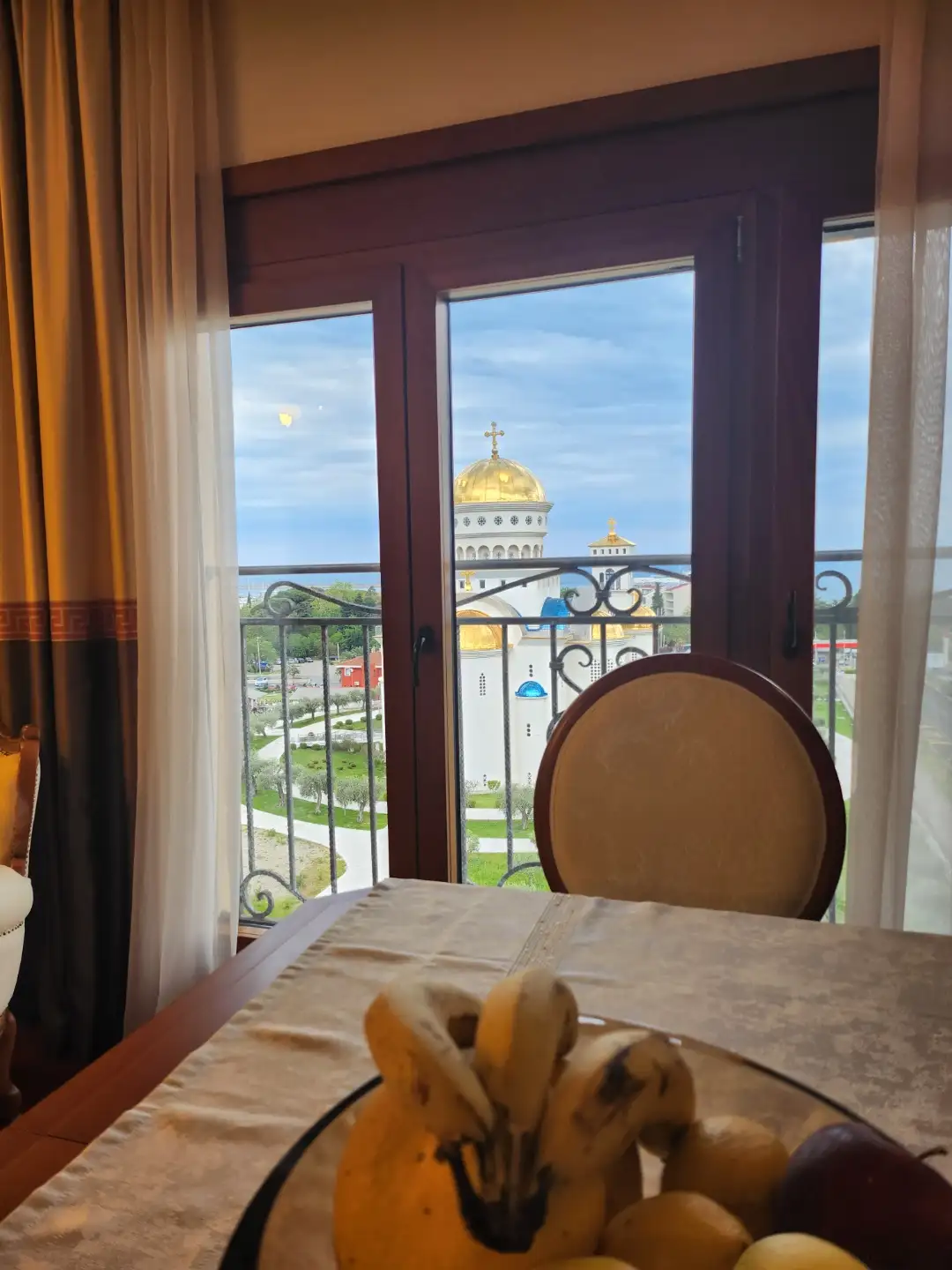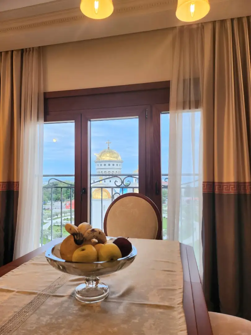 Из окон гостиной и террасы открывается великолепный вид на море и храм.