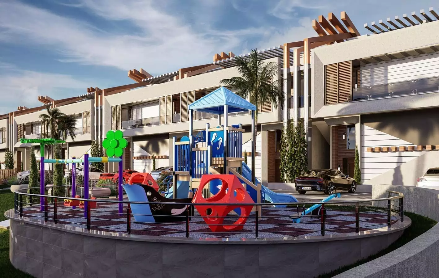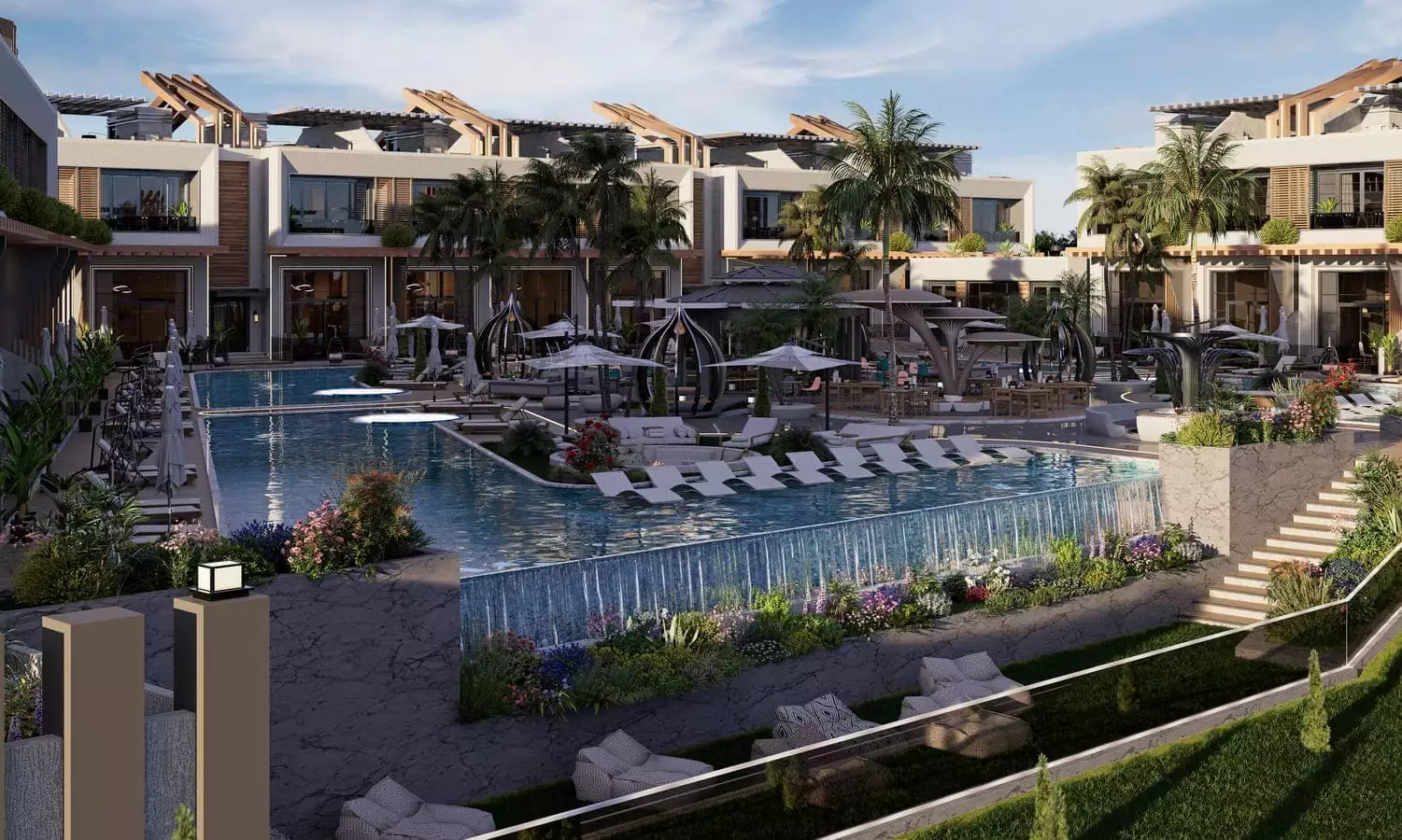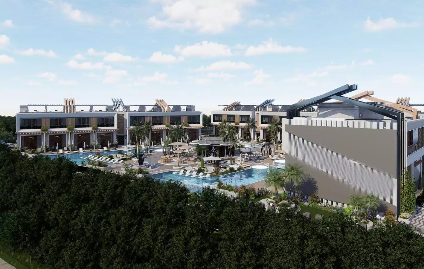 Что в комплексе: На закрытой, охраняемой территории комплекса расположены открытые бассейны, джакузи, зона отдыха у бассейна, бар у бассейна, лобби-бар, беседки для отдыха, детские площадки, прогулочные дорожки, теннисный корт, ресторан и кафе, кинотеатр, фитнес – центр, открытая парковка.