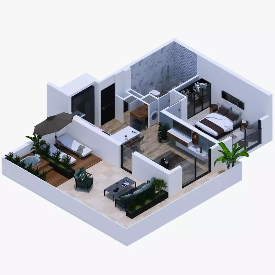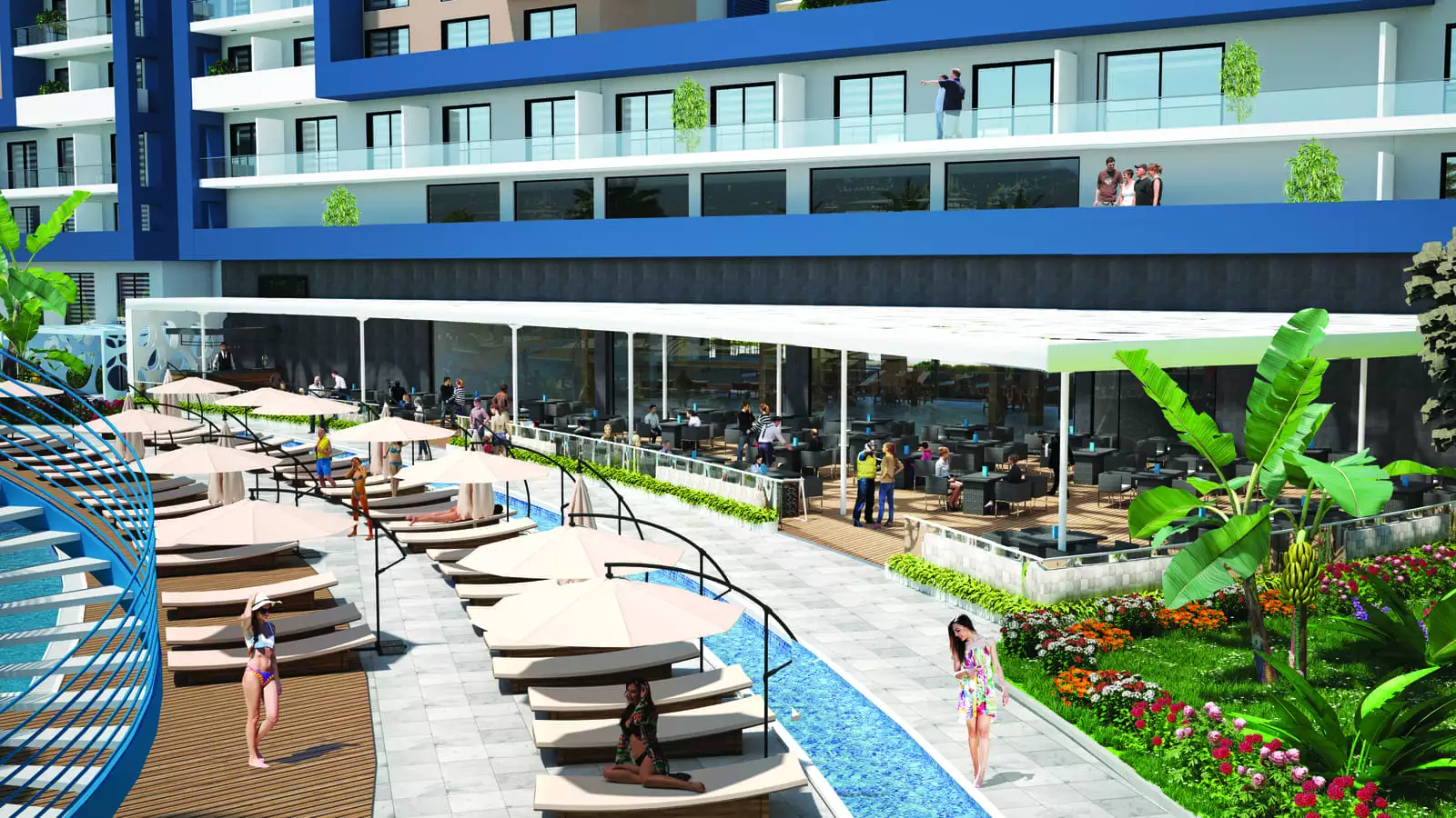 Что в комплексе: На закрытой территории комплекса с ландшафтным дизайном будет расположен открытый бассейн площадью 1 000 м2, ресторан – бар у бассейна, детская площадка, уличная шахматная площадка, спортивная площадка, фитнес, SPA – центр и иные удобства. Для жильцов комплекса буде предусмотрен бесплатный трансфер к морю.