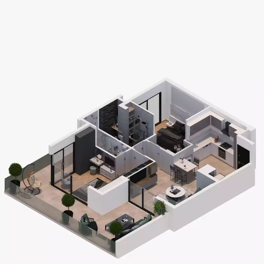 Апартаменты предлагаются в полной чистовой отделке, с высококачественными окнами, дверями, кухонной мебелью, бытовой техникой и готовыми ванными комнатами.