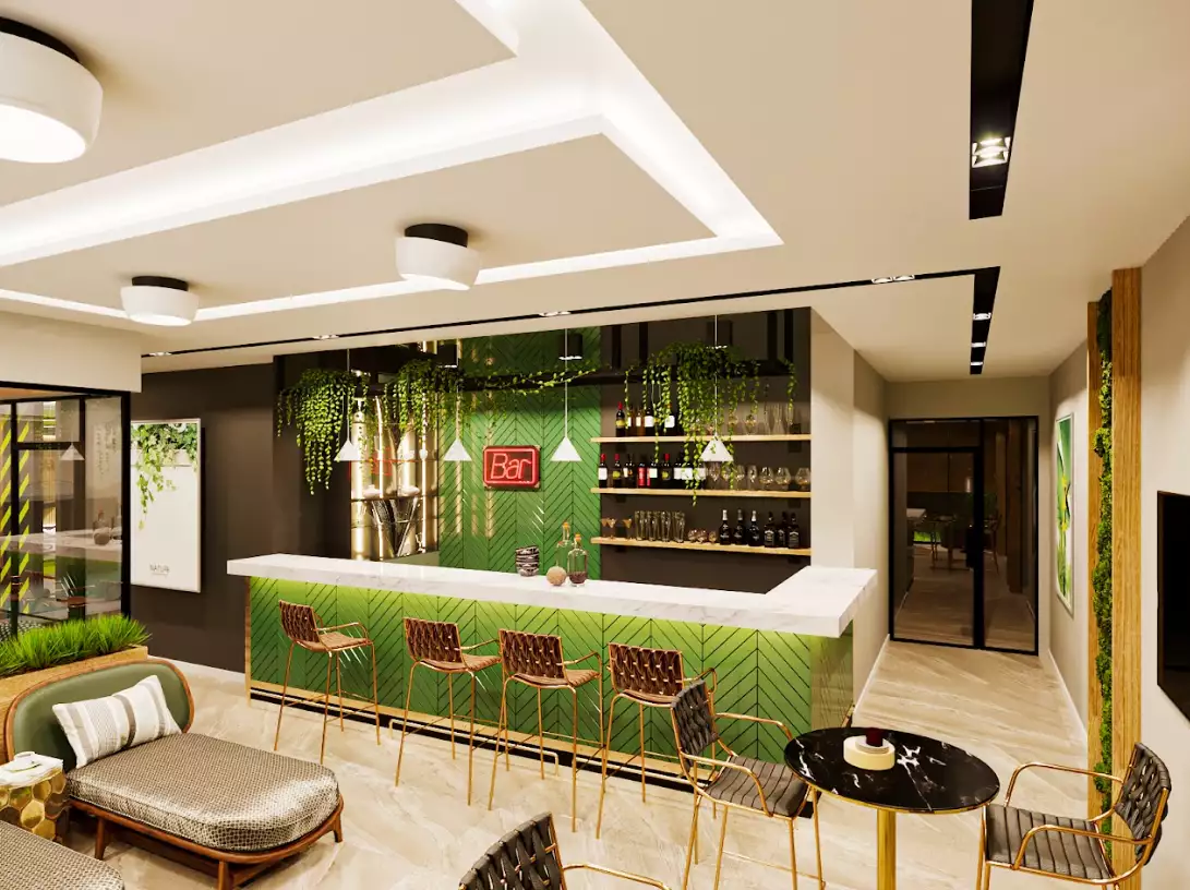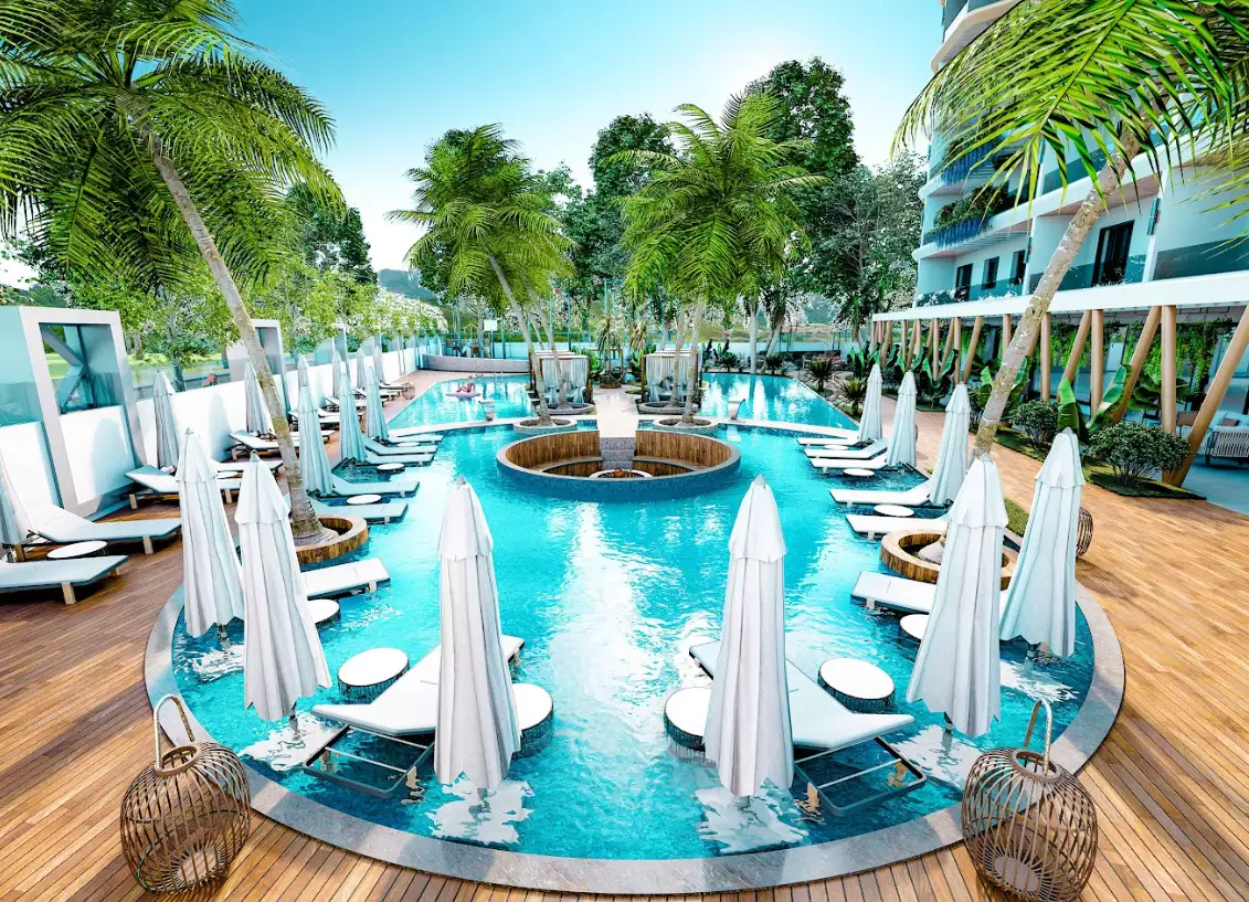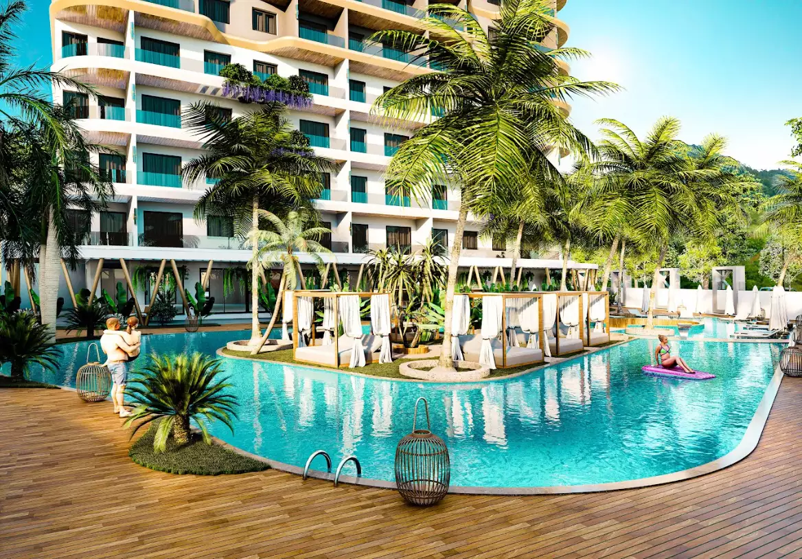 Внутри: Квартира имеет планировку 1+1, площадью 47 м². Апартаменты расположены на пятом этаже. С видом на бассейн. Квартира продается с чистовой отделкой, включая межкомнатные двери, освещение, кухонный гарнитур и сантехнику в санузле.