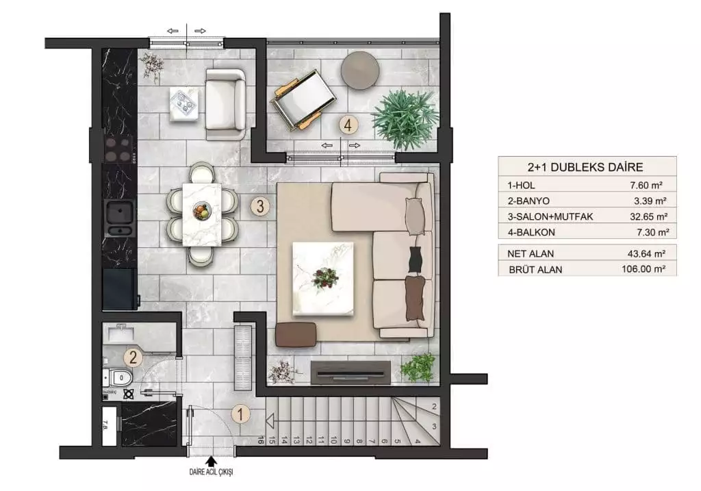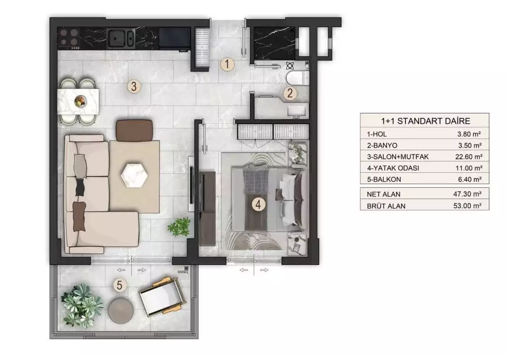 Квартира 2-комнатная (1+1) площадью 59 м.кв. на 1-ом этаже нового жилого комплекса в Аланье. До моря – 700 метров. Очень удобная локация...