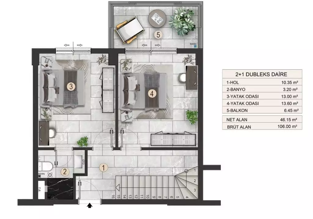 2+1 пентхаусы площадью 106 м2.