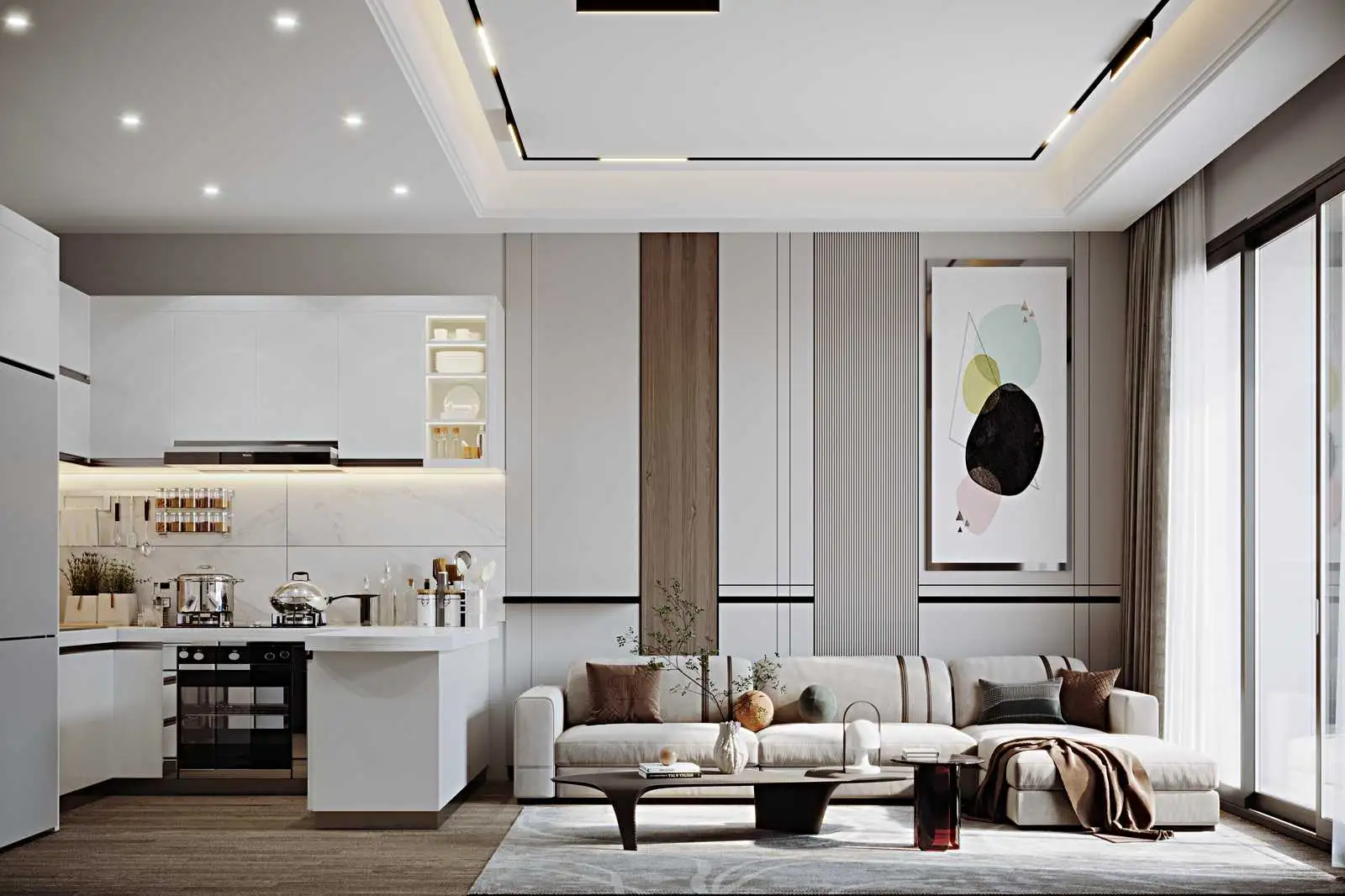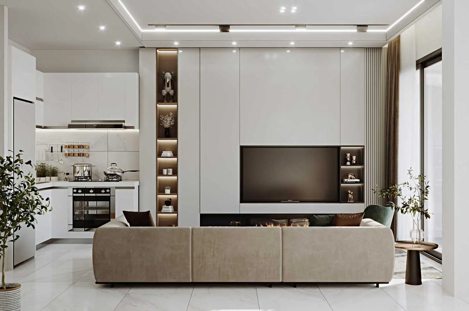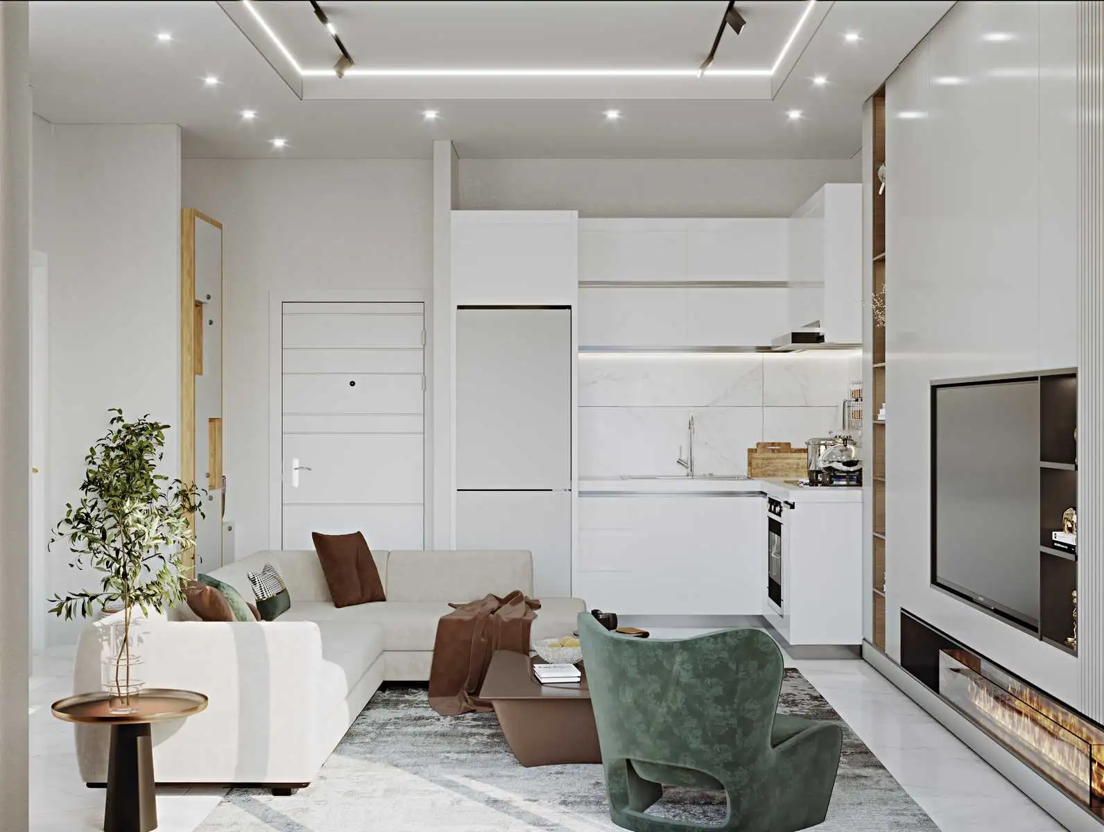 Внутри: Квартиры будут сданы в чистовой отделке с встроенной кухней, с керамическим полом в гостиной, в спальной комнате будет уложен ламинат.