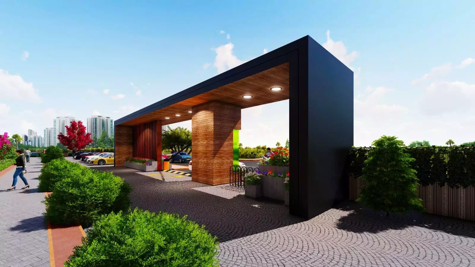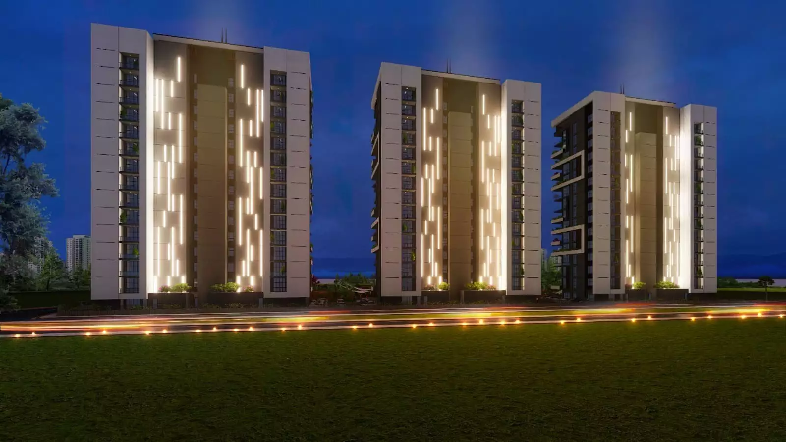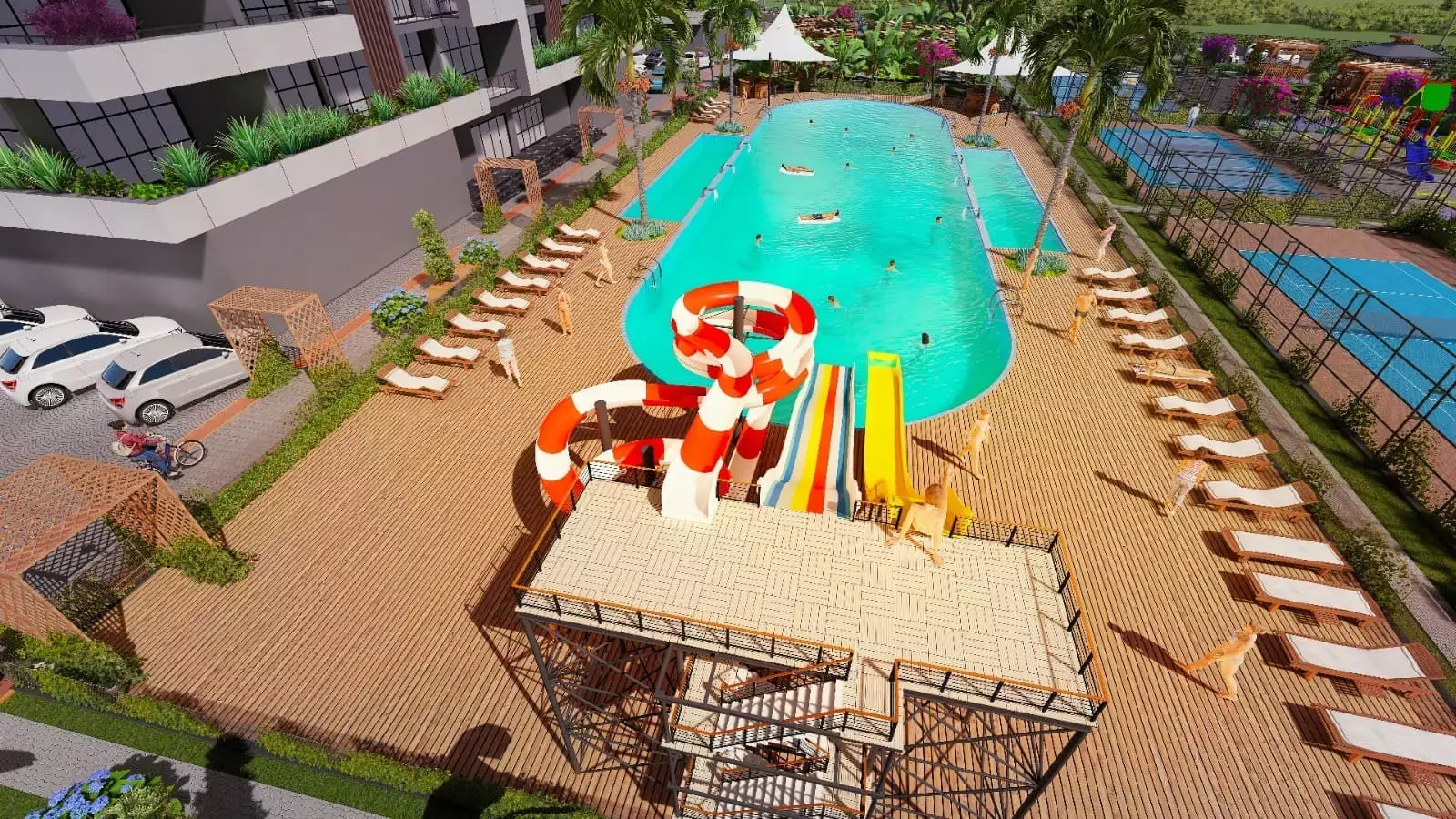 Что в комплексе: На закрытой территории будет расположено 3 жилых блока, открытый бассейн, аквапарк, зона отдыха у бассейна, беседки для отдыха, зоны барбекю, теннисный корт/баскетбольная площадка, детская площадка, фитнес, открытая парковка, генератор.