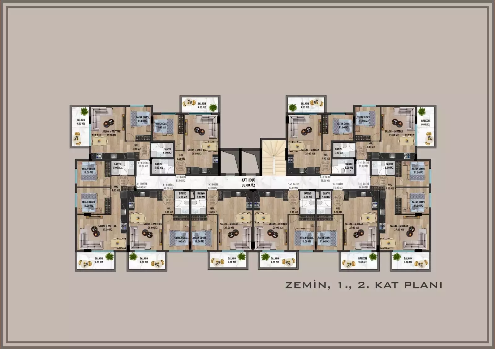 апартаменты планировкой 2+1, площадью 64 и 66 м2;